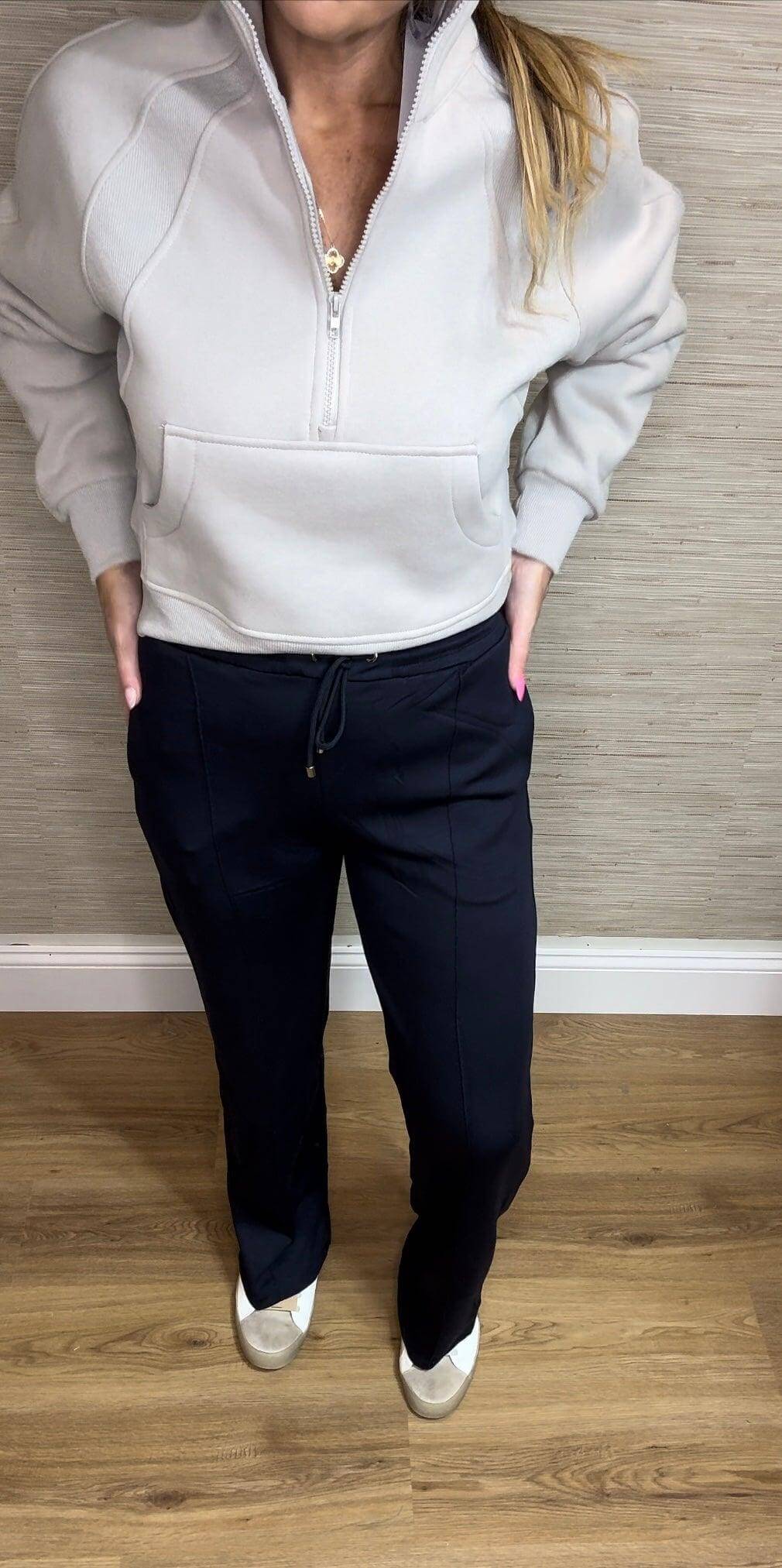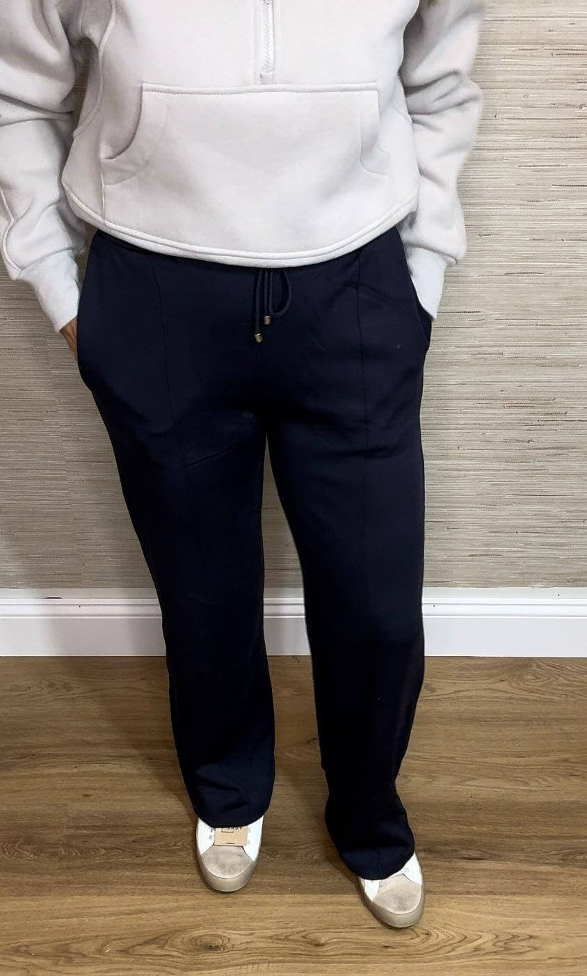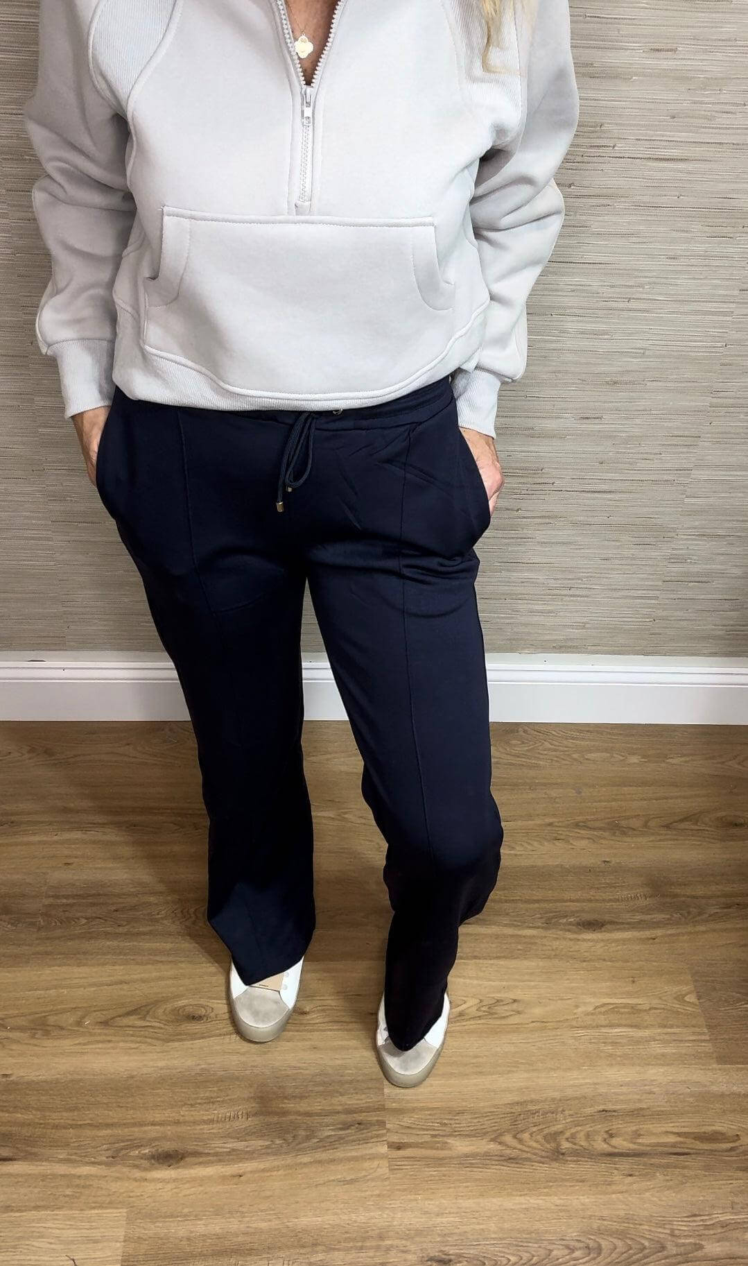 Expertly crafted for maximum comfort and style, The Roxy Pants are a must-have for any wardrobe. These navy blue pants feature elegant piping down the front and a convenient drawstring waist, making them both fashionable and functional. Elevate your everyday look with these ultra-soft and cozy pants.