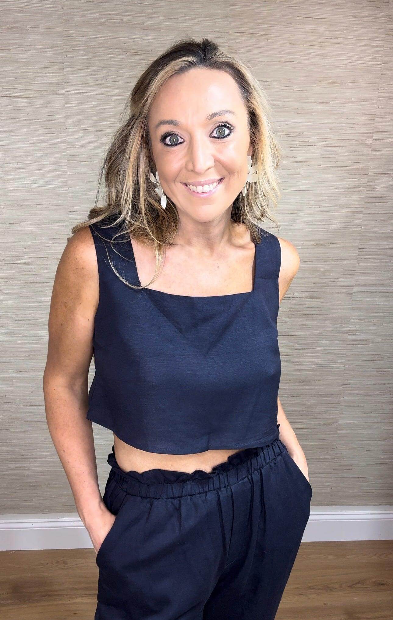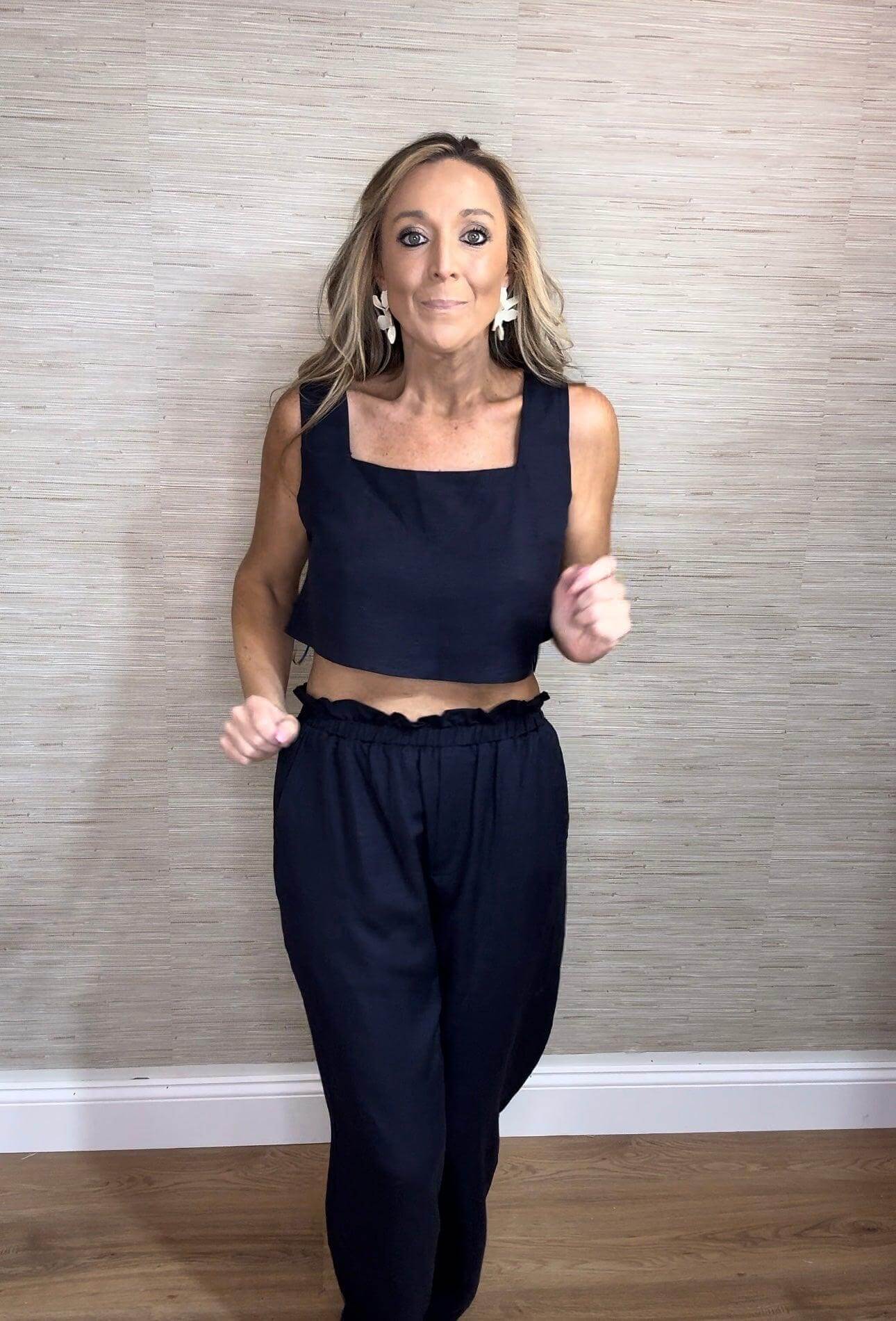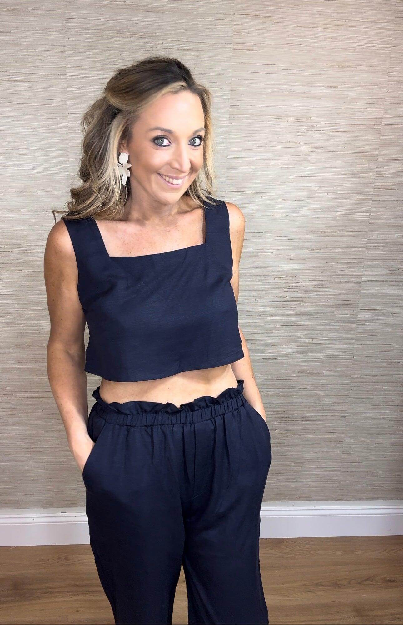 Sleeveless square neck crop top and loose straight leg pants set. Short lining inside.