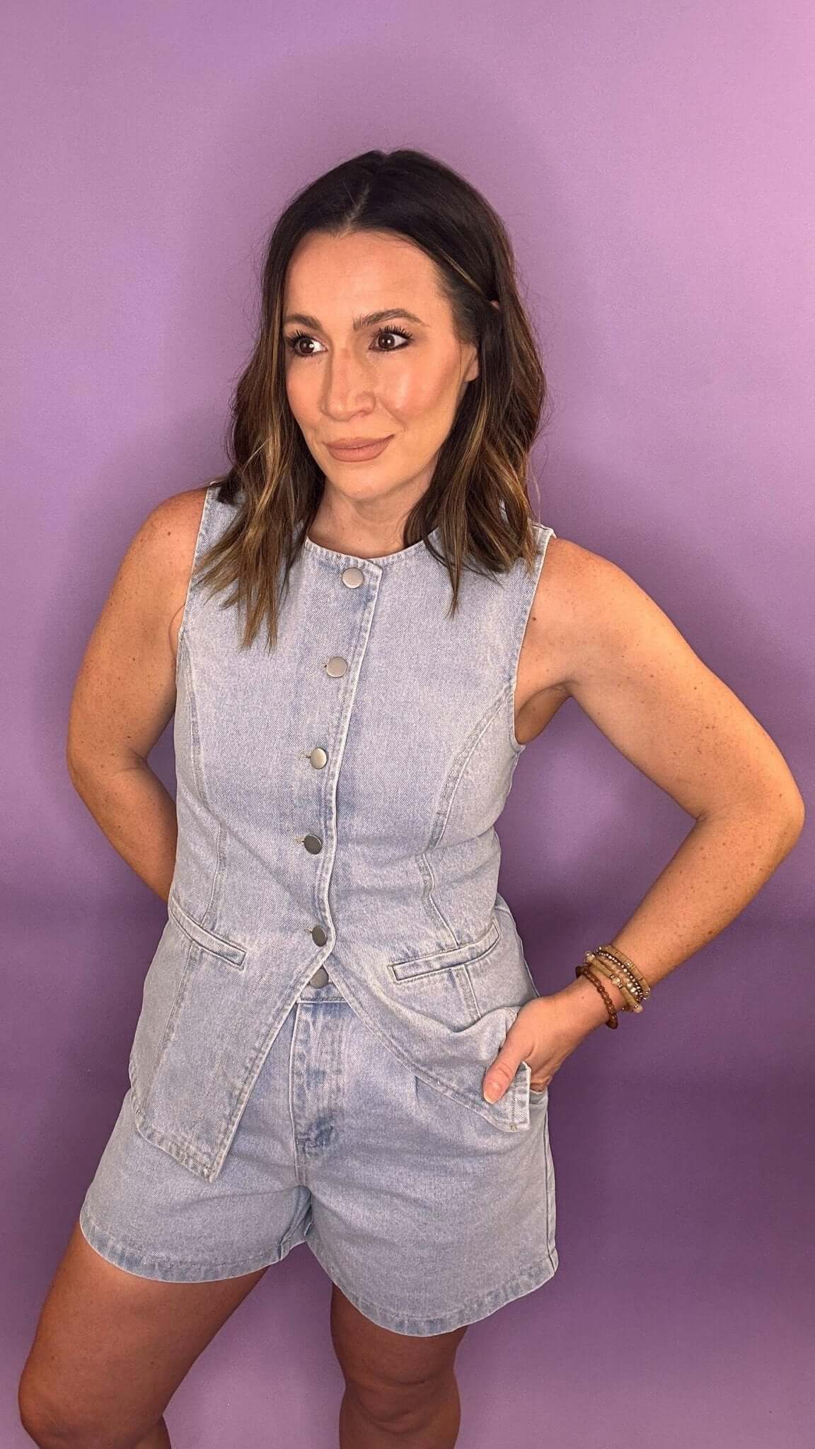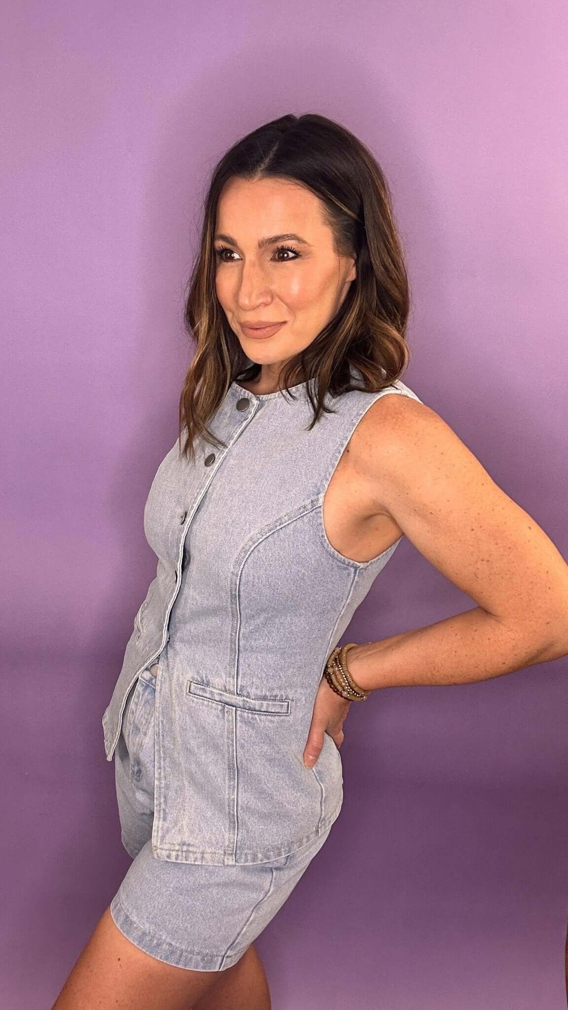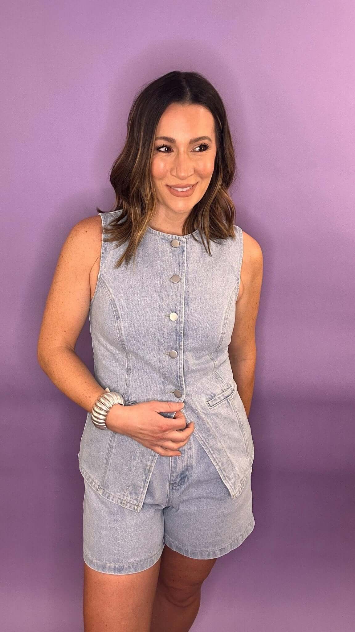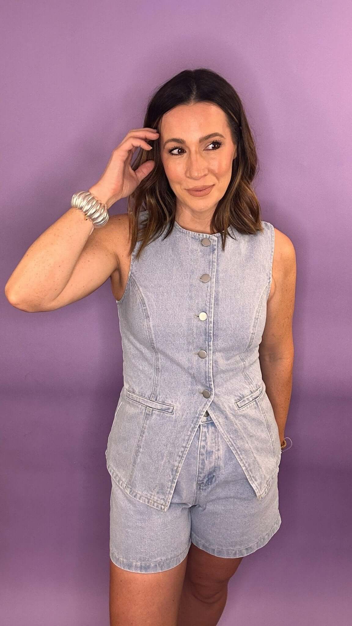 This denim vest and short set offers the perfect combination of style and comfort. Made with high-quality denim material, this set is perfect for any casual occasion. The vest and shorts are designed for a relaxed fit and provide a trendy look. Perfect for warmer days, this set is a must-have addition to your wardrobe.