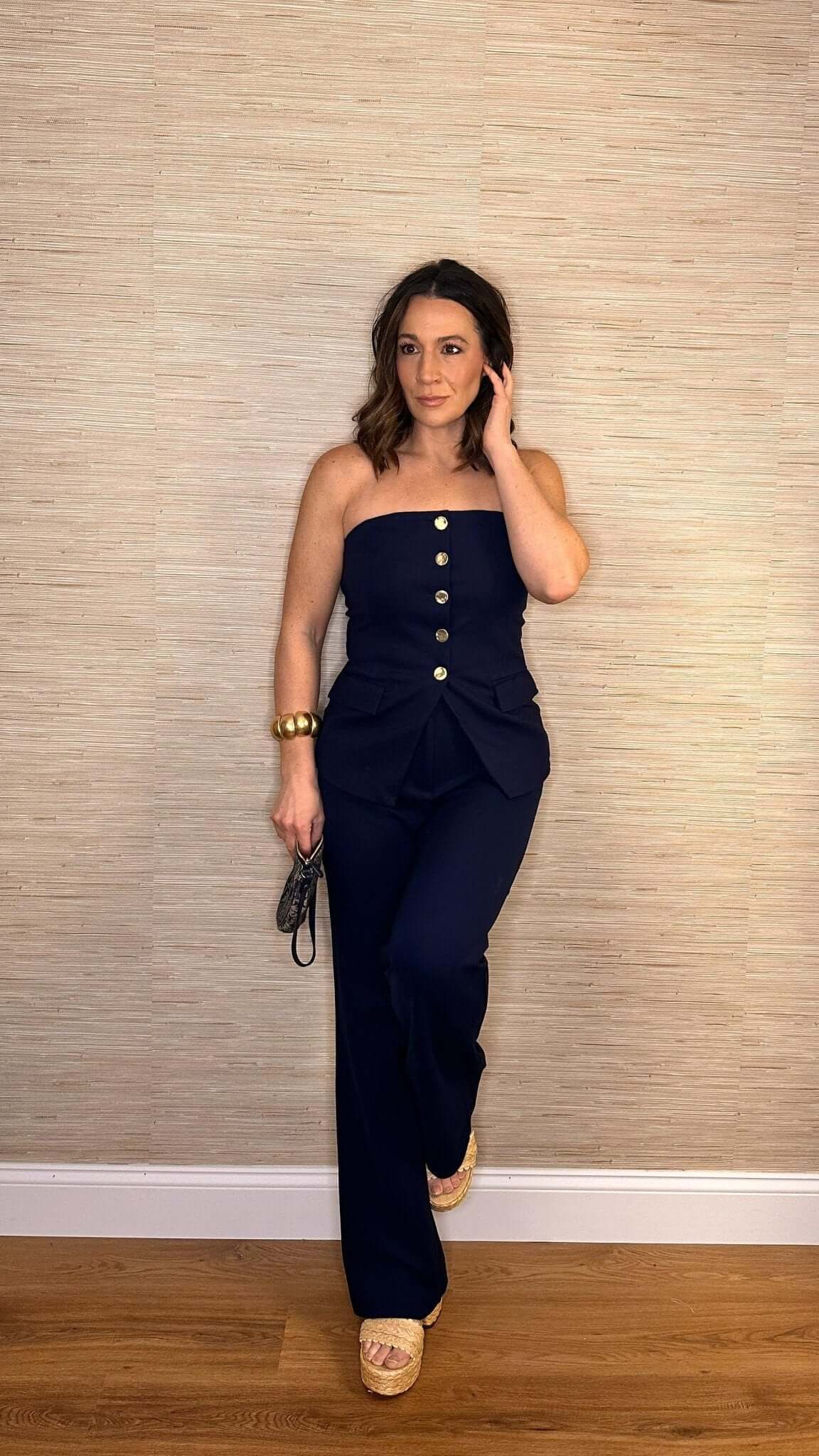 Effortless and chic, this knit ponte strapless vest set adds an on-trend touch to any outfit. The navy blue color is perfect for any occasion, and the flyaway bottom adds a unique twist. The matte gold hammered hardware gives a touch of elegance, while the matching pants with hook and zip fly closure provide a comfortable and stylish fit.