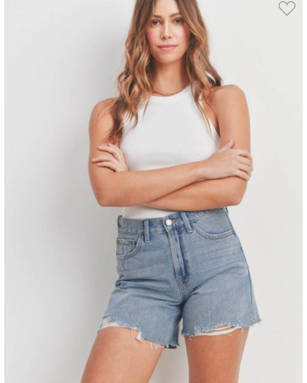 Hey, Trendsetters! Get ready to rock your summer style with our High Rise Boyfriend Shorts in Medium Denim. These shorts are all about that high-waisted, leg-lengthening magic. And let's talk about the destroyed hem – it adds just the right amount of edgy flair to elevate your look from basic to badass.