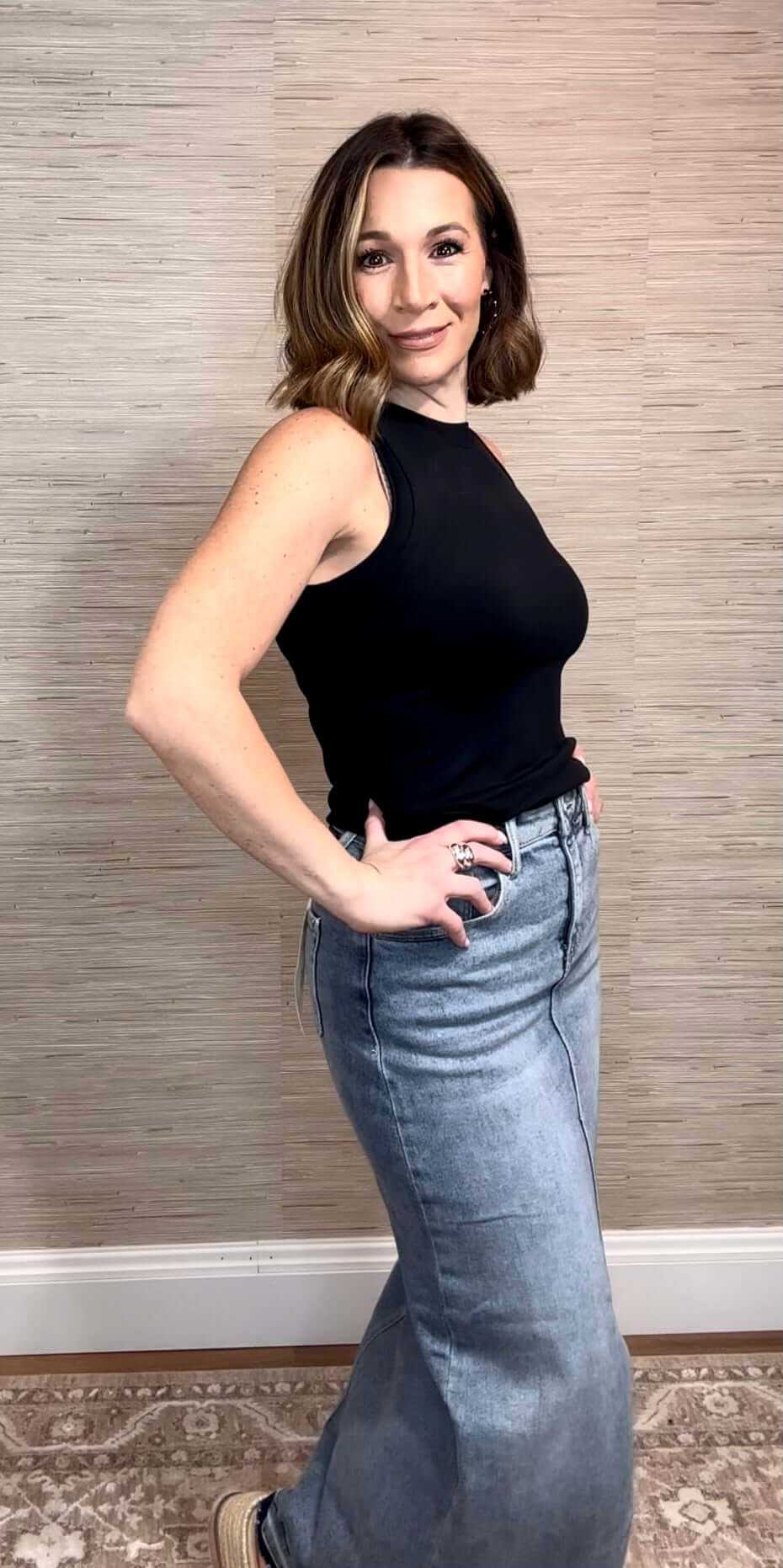 Elevate your style with our High Rise Front Open Maxi Skirt! This denim skirt boasts a high rise and a trendy front slit for a flattering and fashion-forward look. The stretch fabric ensures a comfortable fit while keeping you on-trend. Upgrade your wardrobe with this modern and versatile piece.