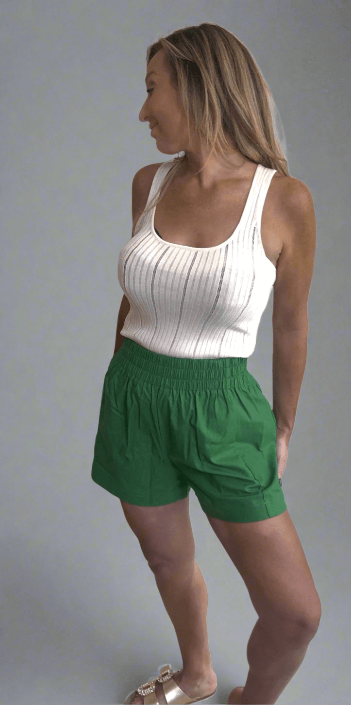 The Portia Shorts combine comfort and chic design with their elastic high-rise waist and flattering flat front pockets. Made from lightweight cotton, these mid-length shorts keep you cool and stylish all day. Available in versatile navy or fresh palm green, they’re perfect for effortless, polished looks.