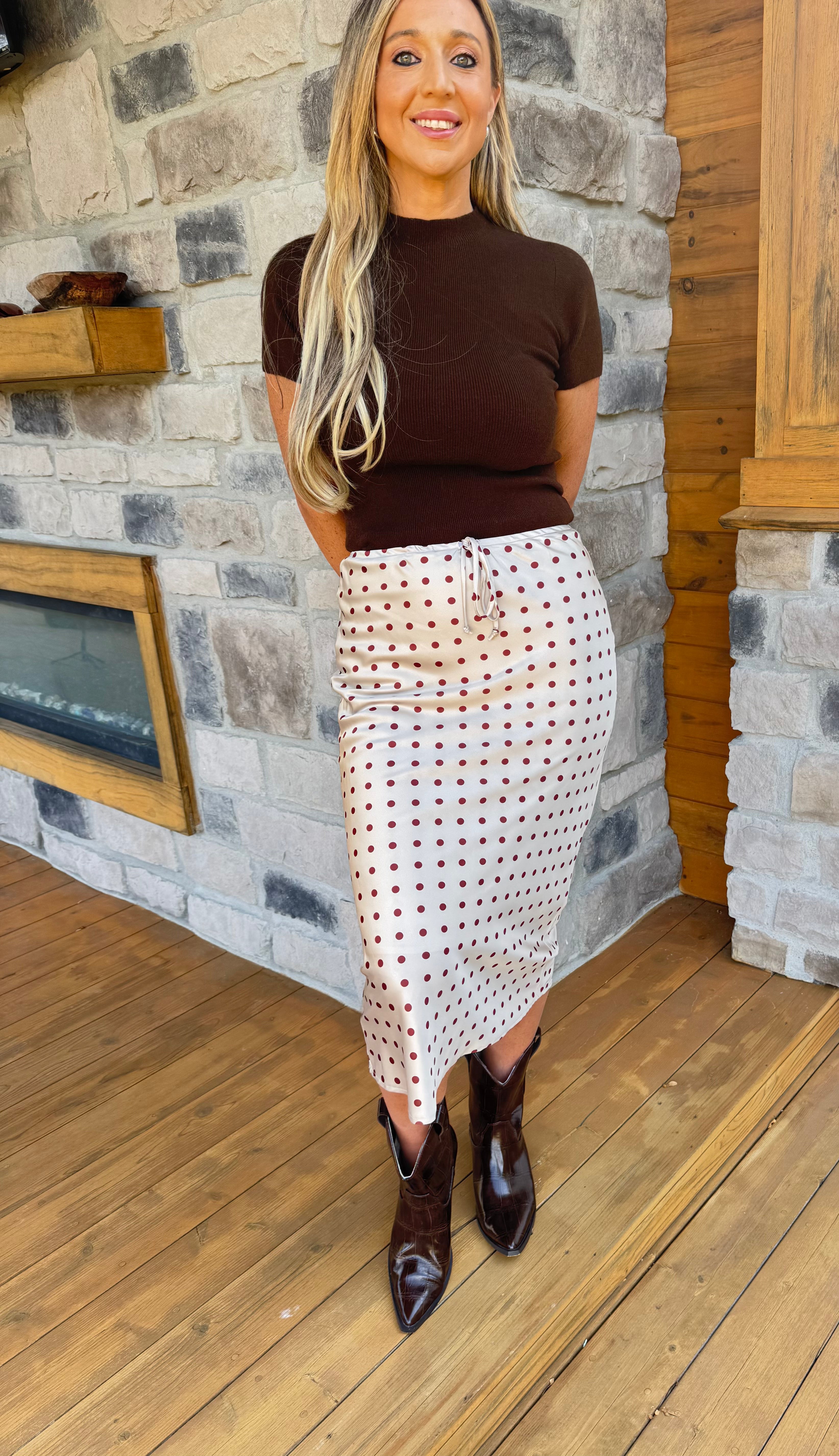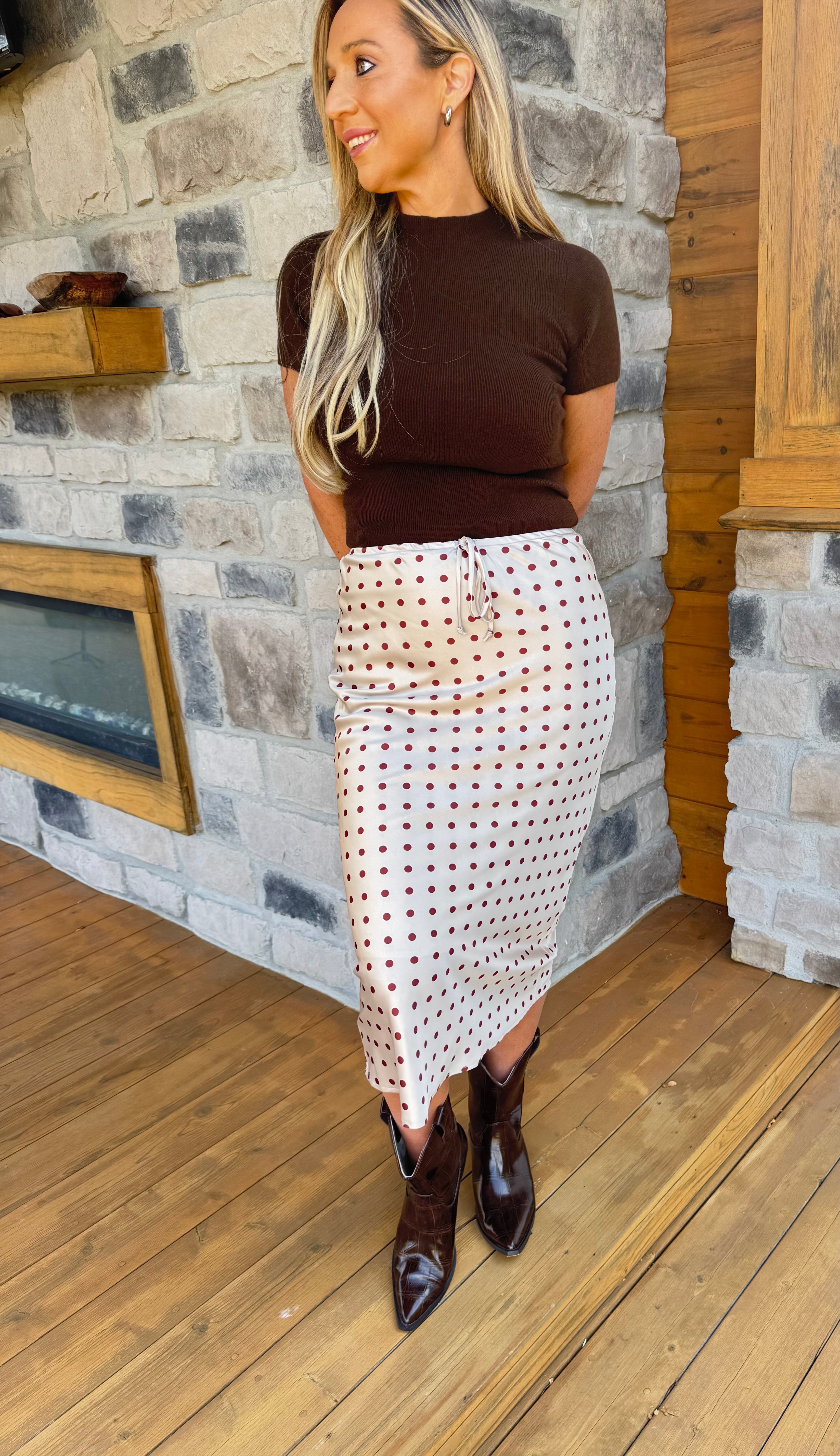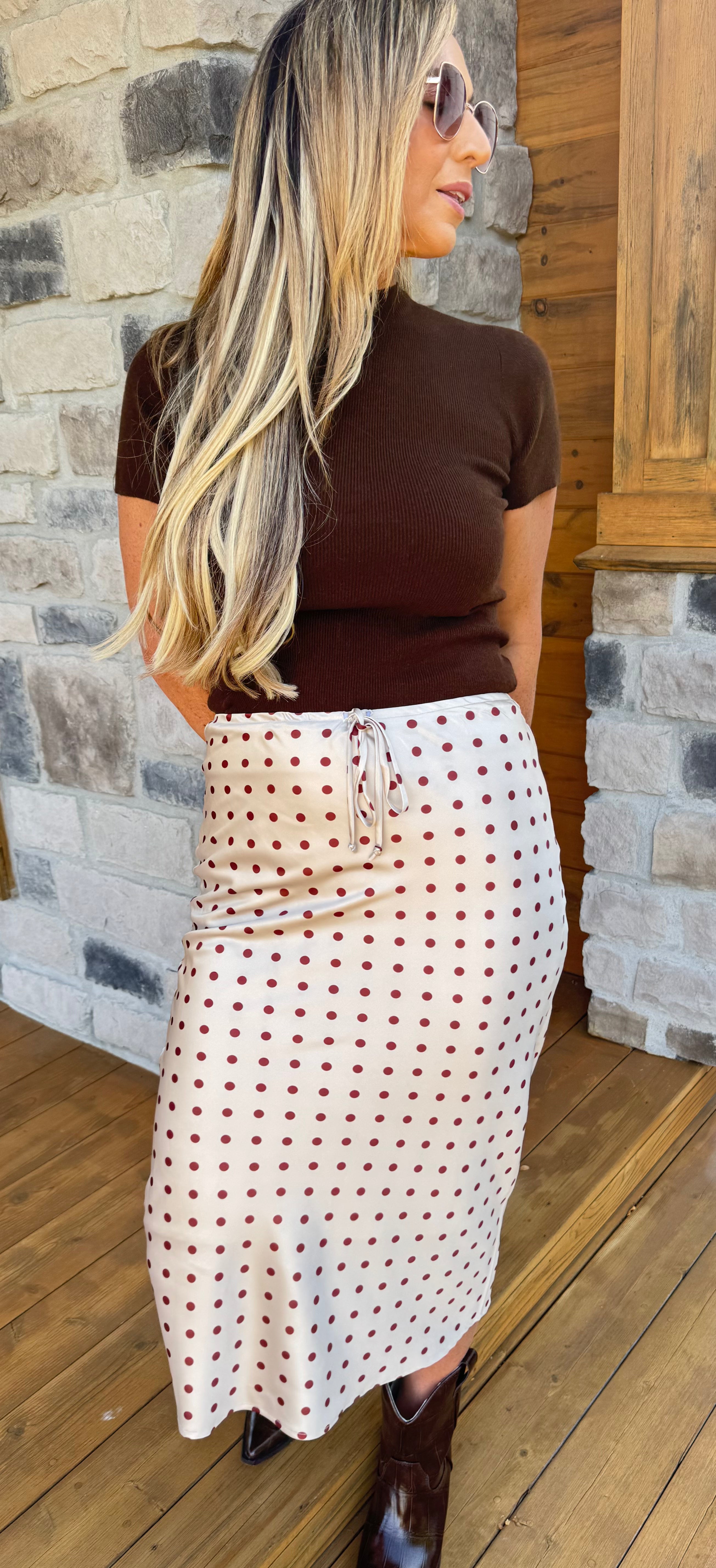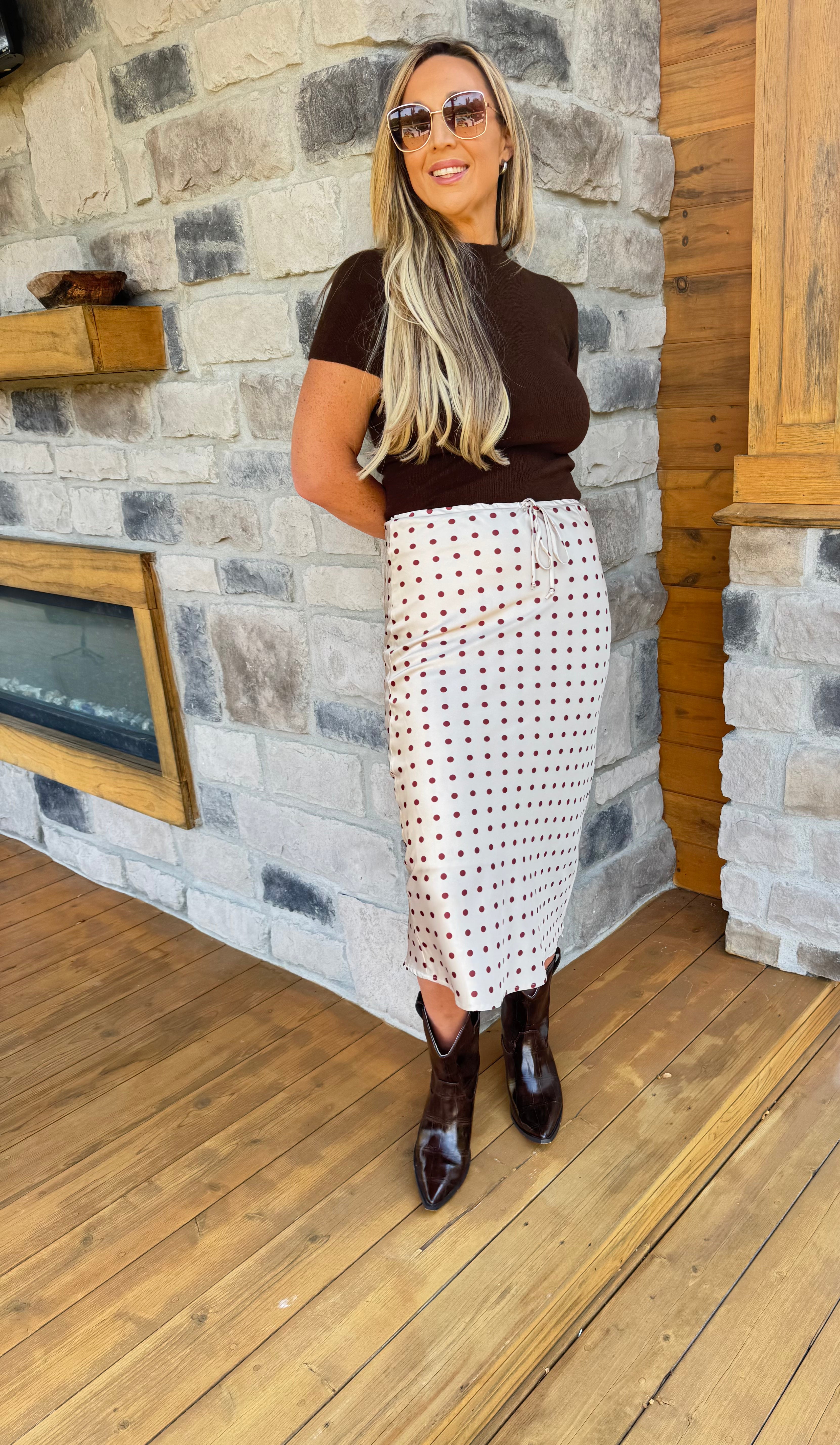 Effortlessly elegant, the Silken Dots Midi Skirt is a timeless wardrobe staple with a playful twist. Crafted from luxurious silk, this cream-colored skirt features a cascade of soft brown polka dots that strike the perfect balance between classic and modern. The fluid midi length sways gracefully with movement, while the adjustable drawstring waist ensures a customizable and comfortable fit. Pair it with a crisp blouse for daytime polish or a slinky camisole for evening charm.