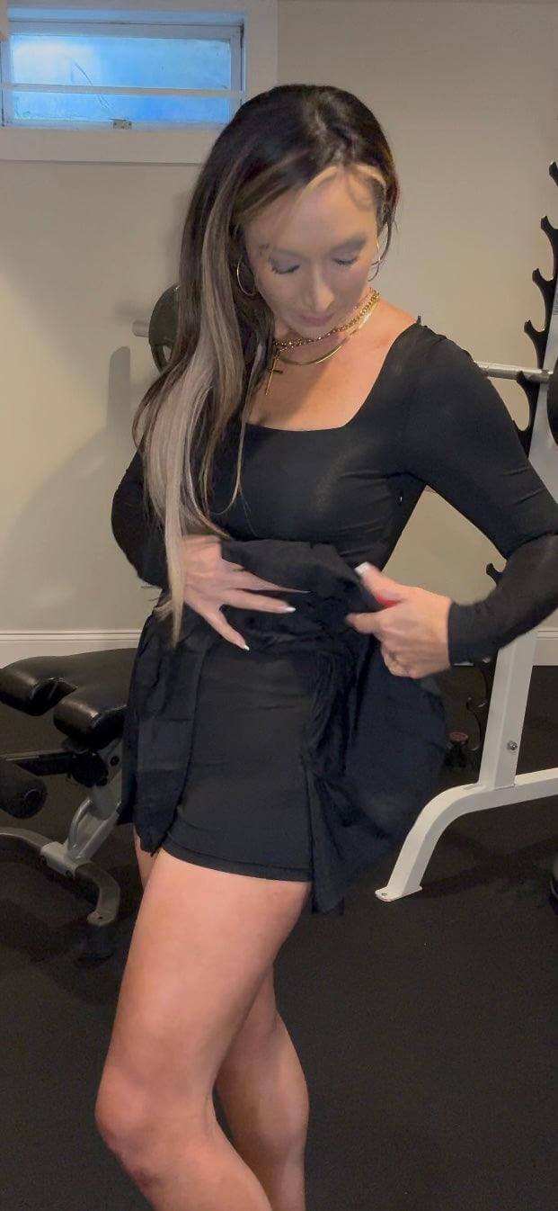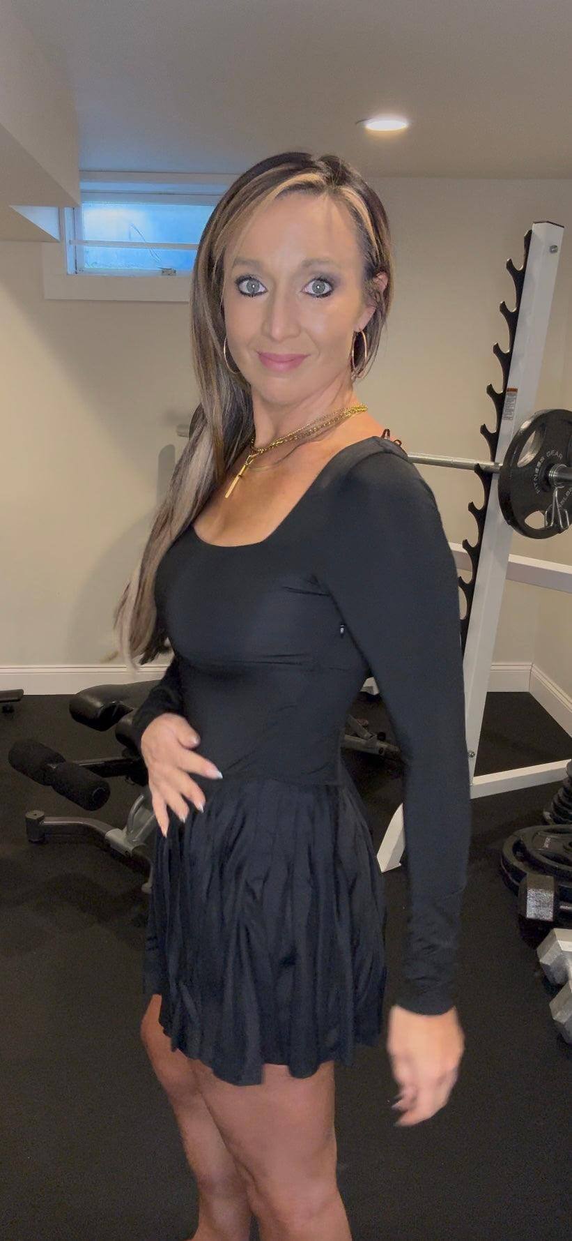 Introducing the Lily Tennis Dress - a sleek and stylish choice for the court. This black long sleeve dress features built-in shorts for added comfort during play. Serve up a winning look and performance with this must-have piece for your tennis wardrobe.