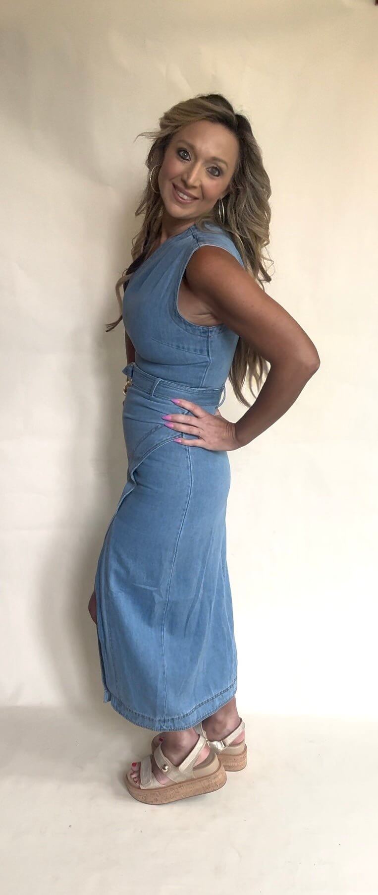 Denim One Shoulder Dress with Slit & Belt – Edgy & Elegant