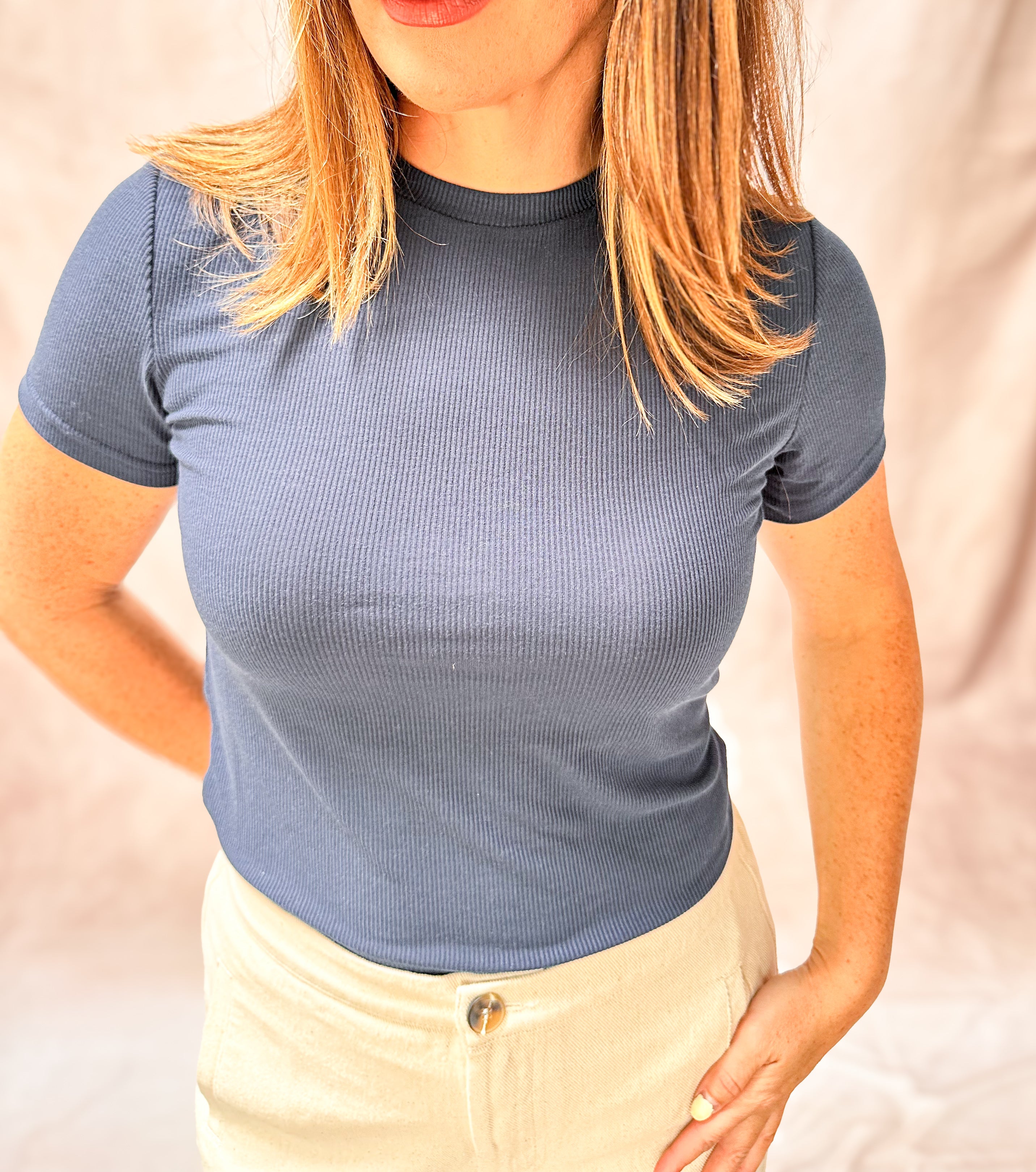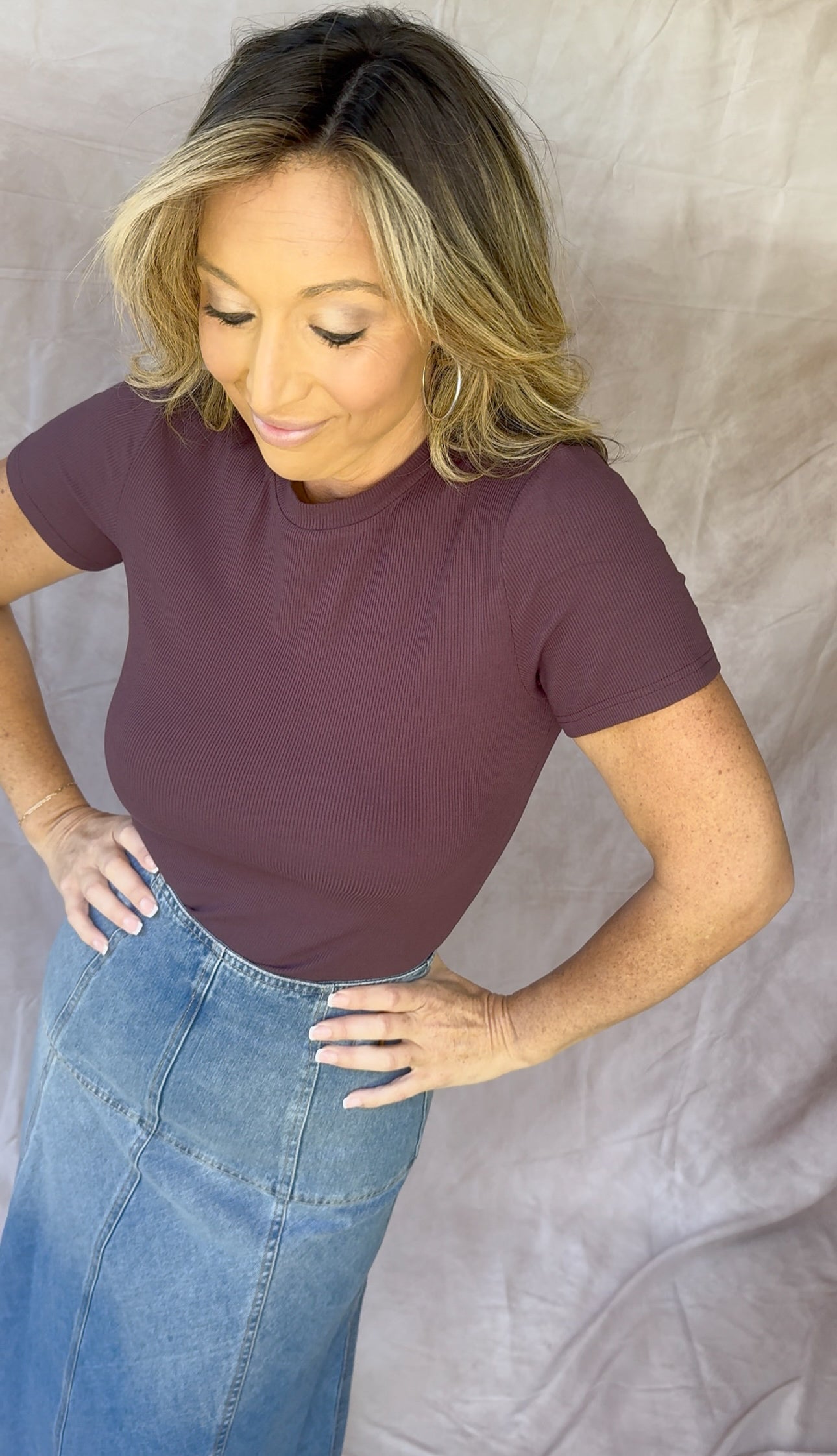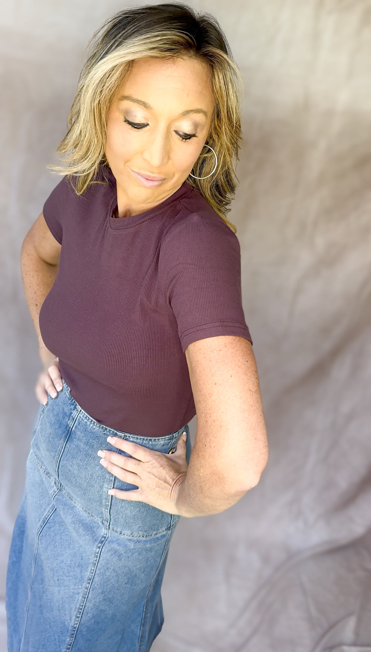 Sleek, simple, and so flattering. The Juliet Top is a fitted ribbed knit that hugs in all the right places, now available in three rich, fall-ready shades: classic Burgundy, deep Navy, and warm Oak. With short sleeves and a longer length, it’s perfect for tucking into skirts or wearing long with your favorite denim. A versatile essential you’ll reach for on repeat.