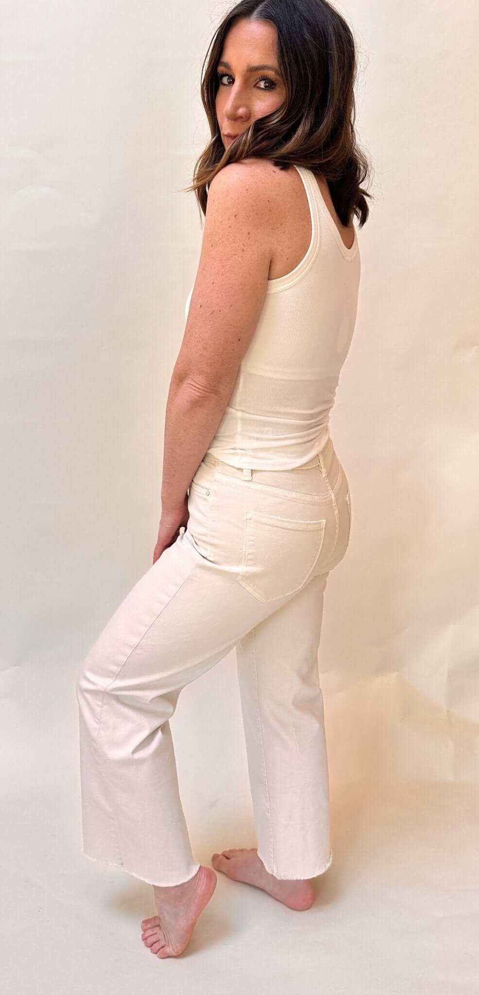 Elevate your denim game with our Lulu Ivory High Rise Crop. This everyday essential features an ivory high rise fit with a unique frayed hem for a twist on classic denim. Plus, the elevated construction and matching metal buttons add a touch of sophistication to your style. Button up in style today!