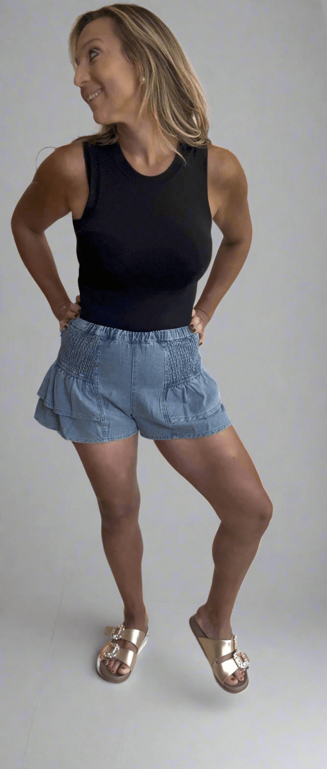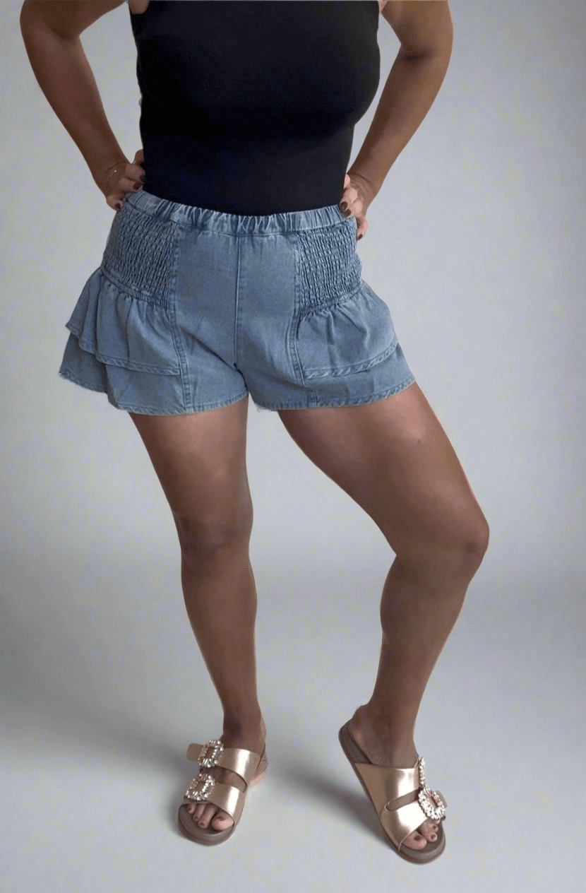 The Mandy Denim Flutter Shorts combine comfort and style with lightweight cotton denim and a flexible elastic waist for an easy, flattering fit. Featuring an adorable tiered ruffle along the side, these shorts add a slimline, feminine flair perfect for sunny days and casual outings. Elevate your wardrobe with this effortlessly chic piece.