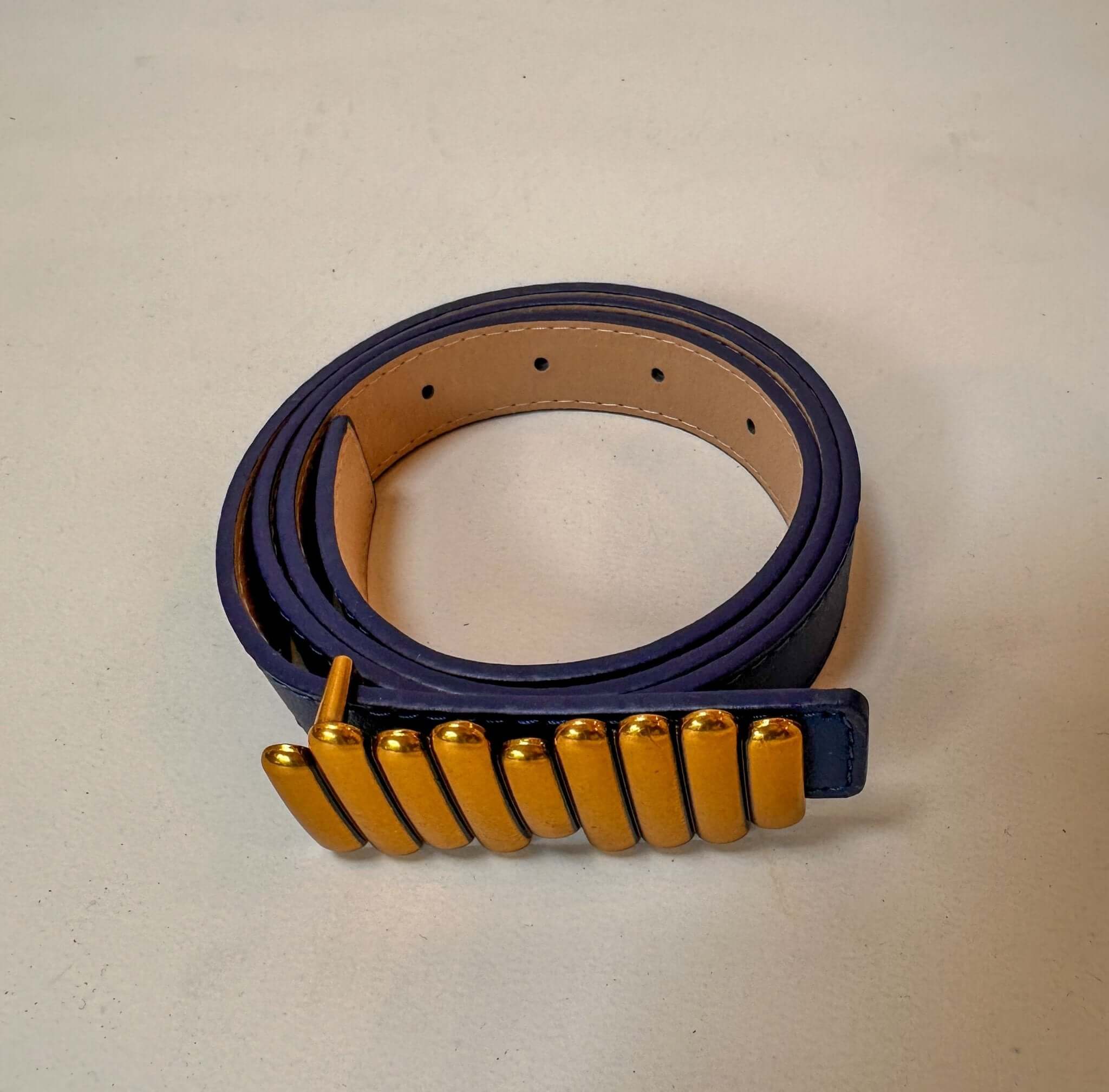 Add a touch of nautical style to any outfit with our Nine Bar Belt in Navy. Made with durable brass buckle and sturdy belt material, it's a practical yet stylish addition to your wardrobe. Sail into fashion with this playful nod to the sea, featuring a brass buckle and sturdy material, it's the perfect finishing touch to any outfit!