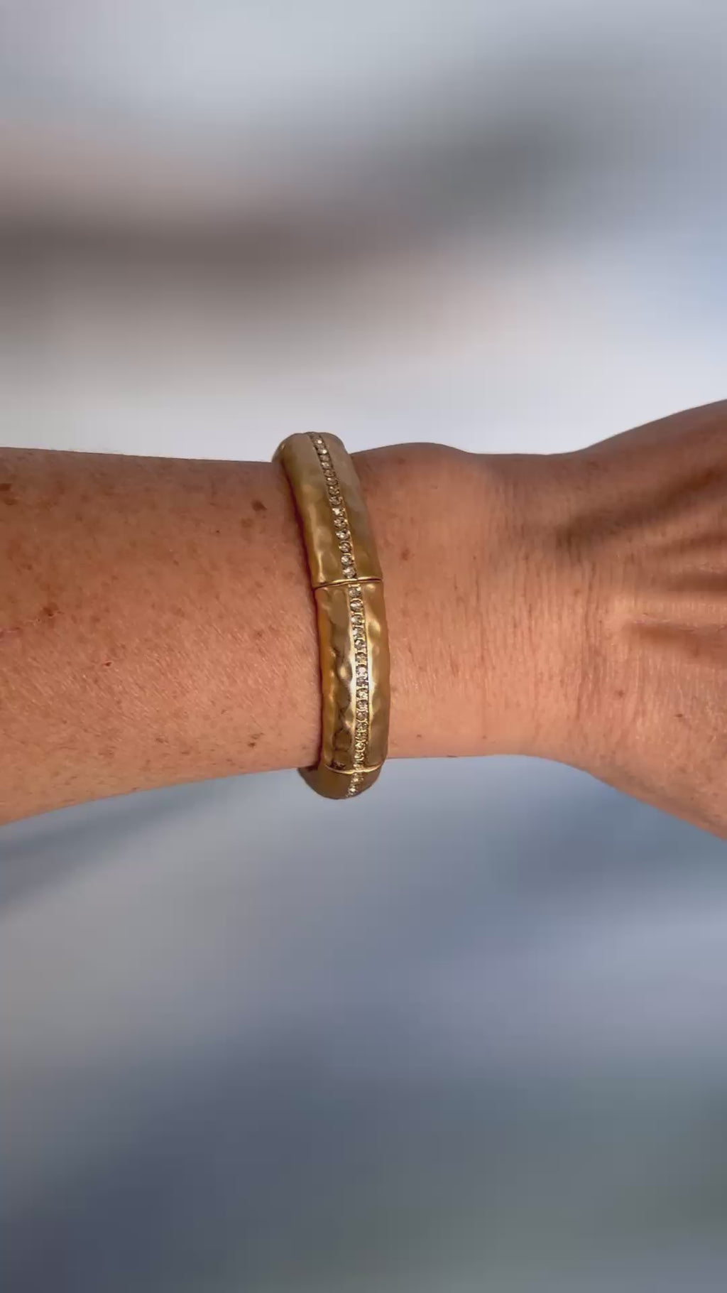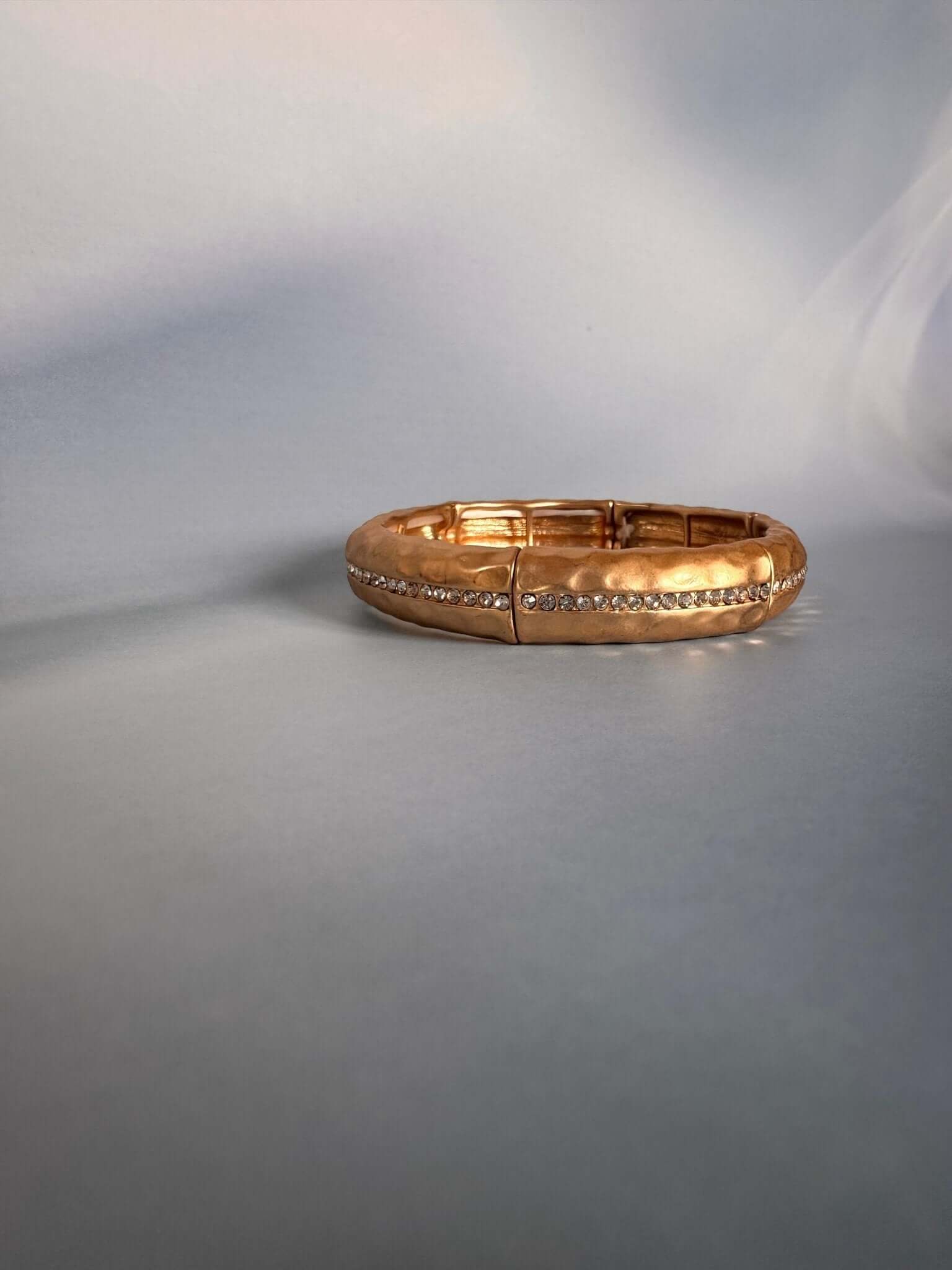 Indulge yourself in the luxurious elegance of the Paloma Rhinestone Stretch Bangle. Crafted with a hammered matte gold finish, this exquisite bangle glimmers with the addition of inset rhinestones. Its stretch design ensures a comfortable fit and adds a touch of sophistication to any outfit. Elevate your style with this exclusive piece.