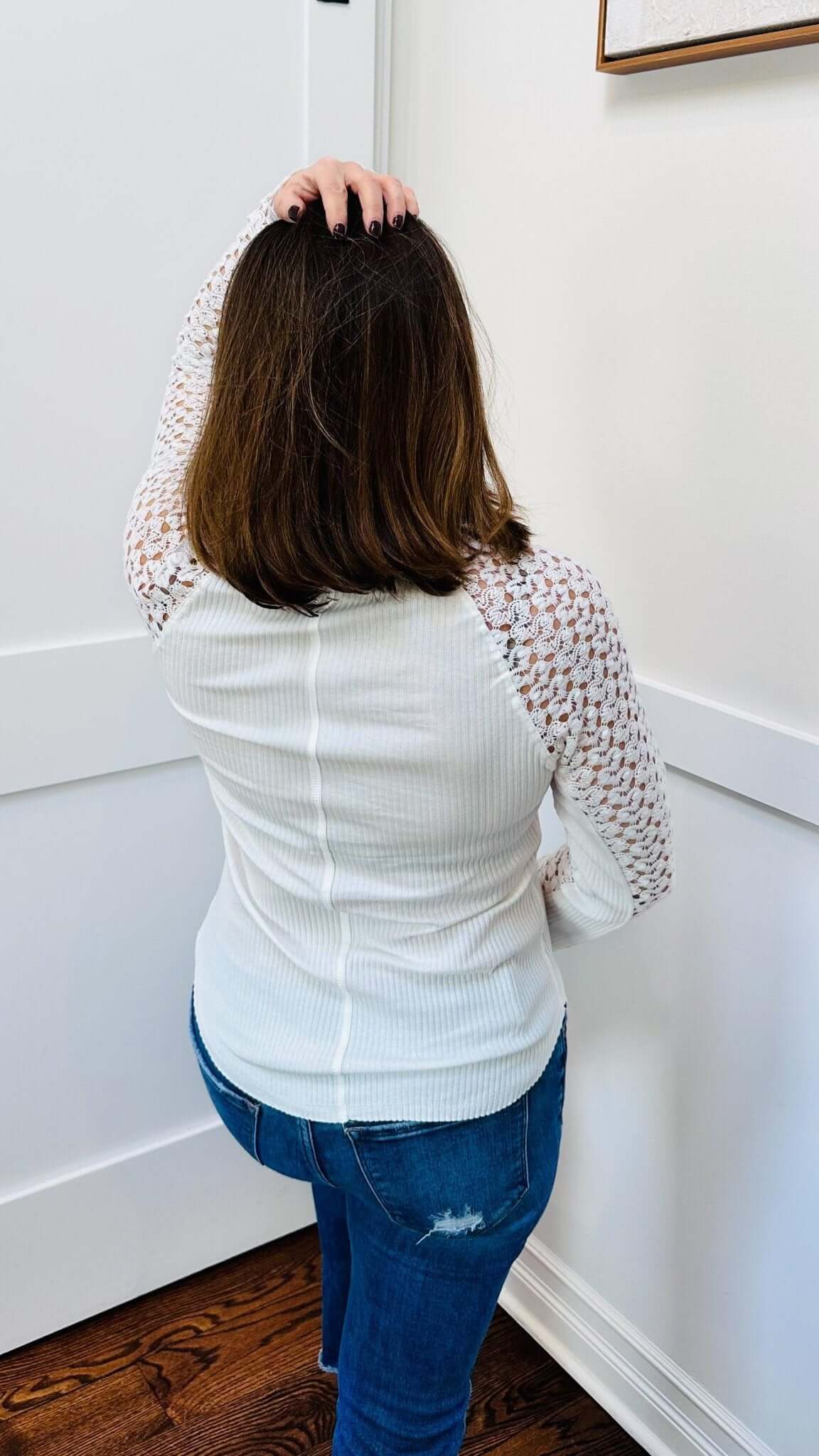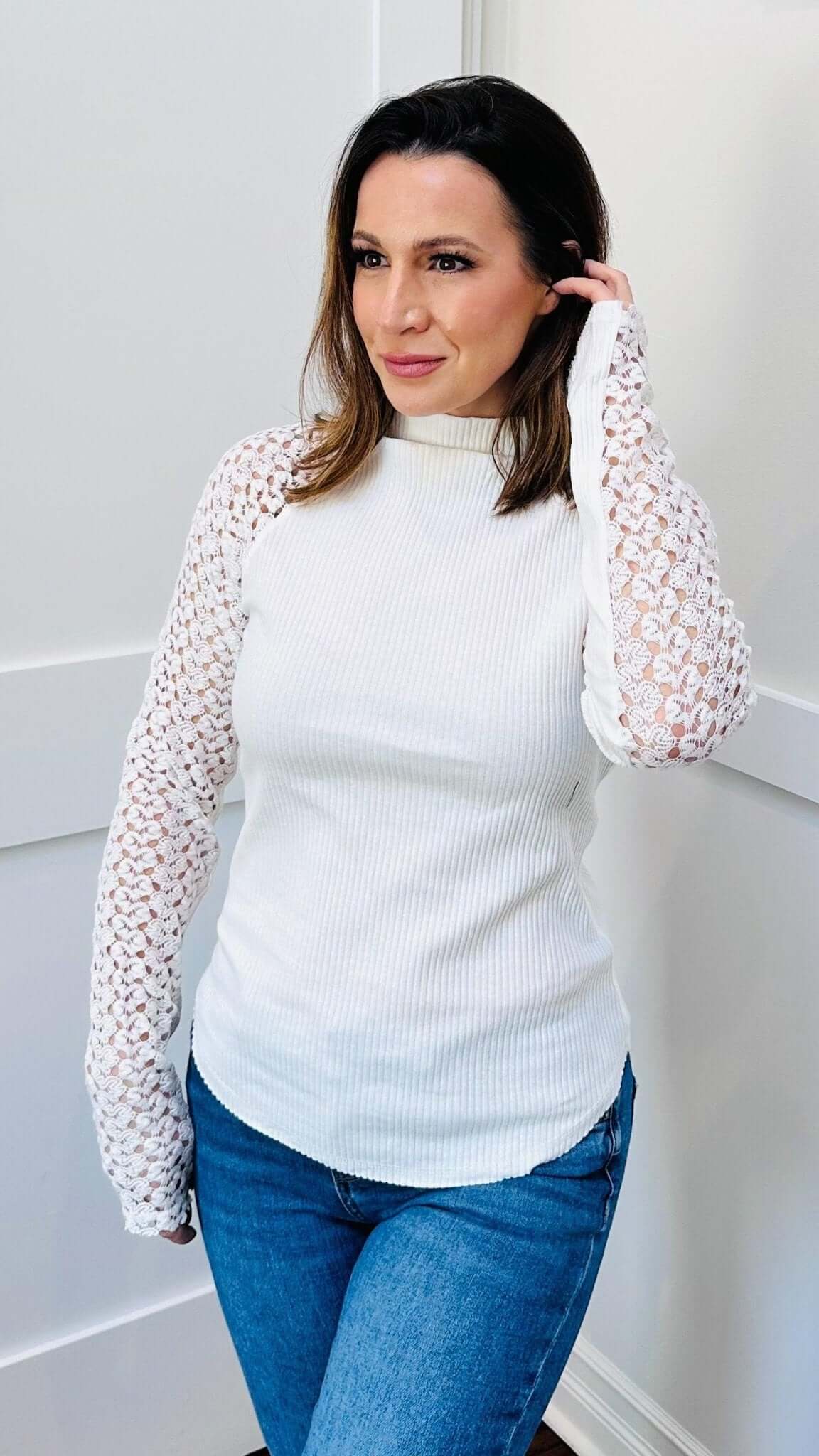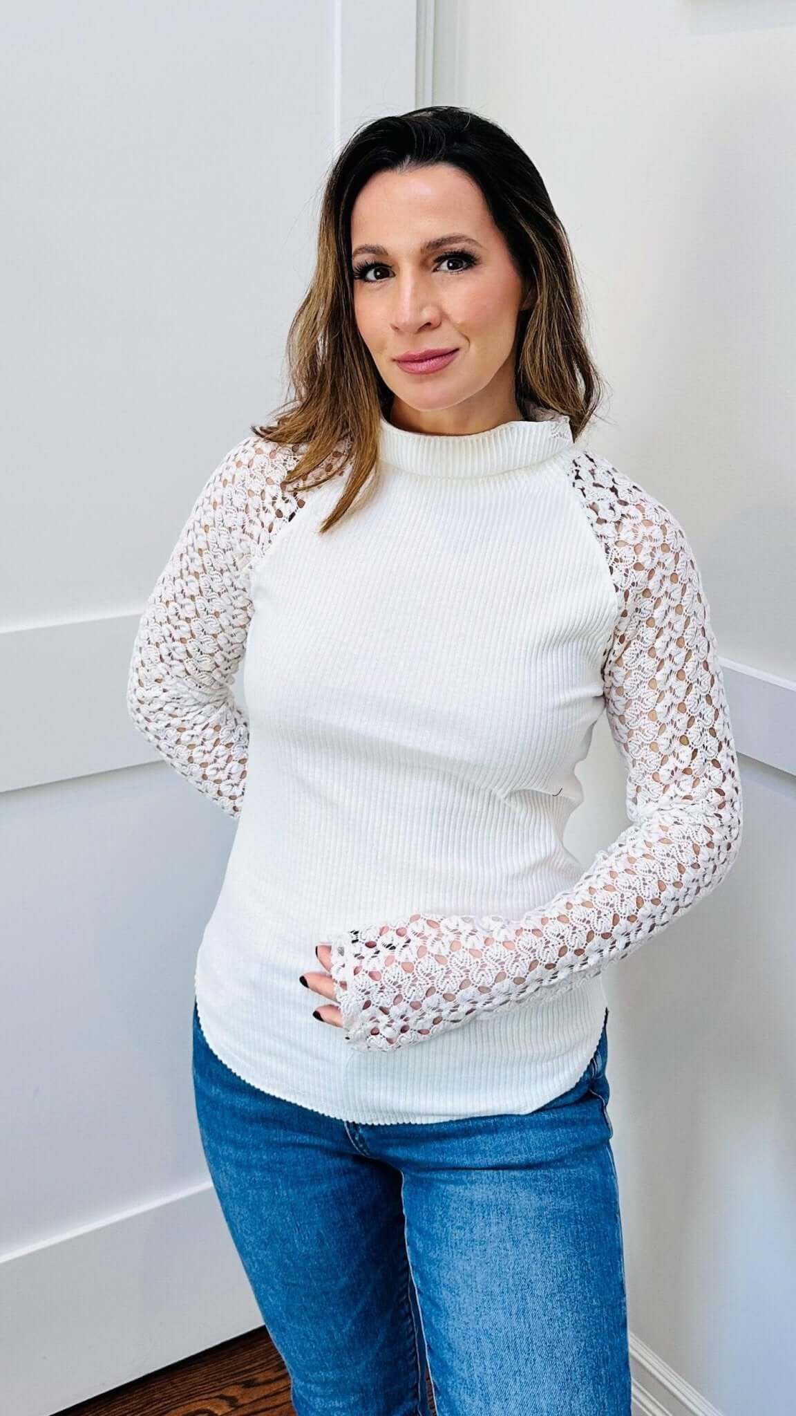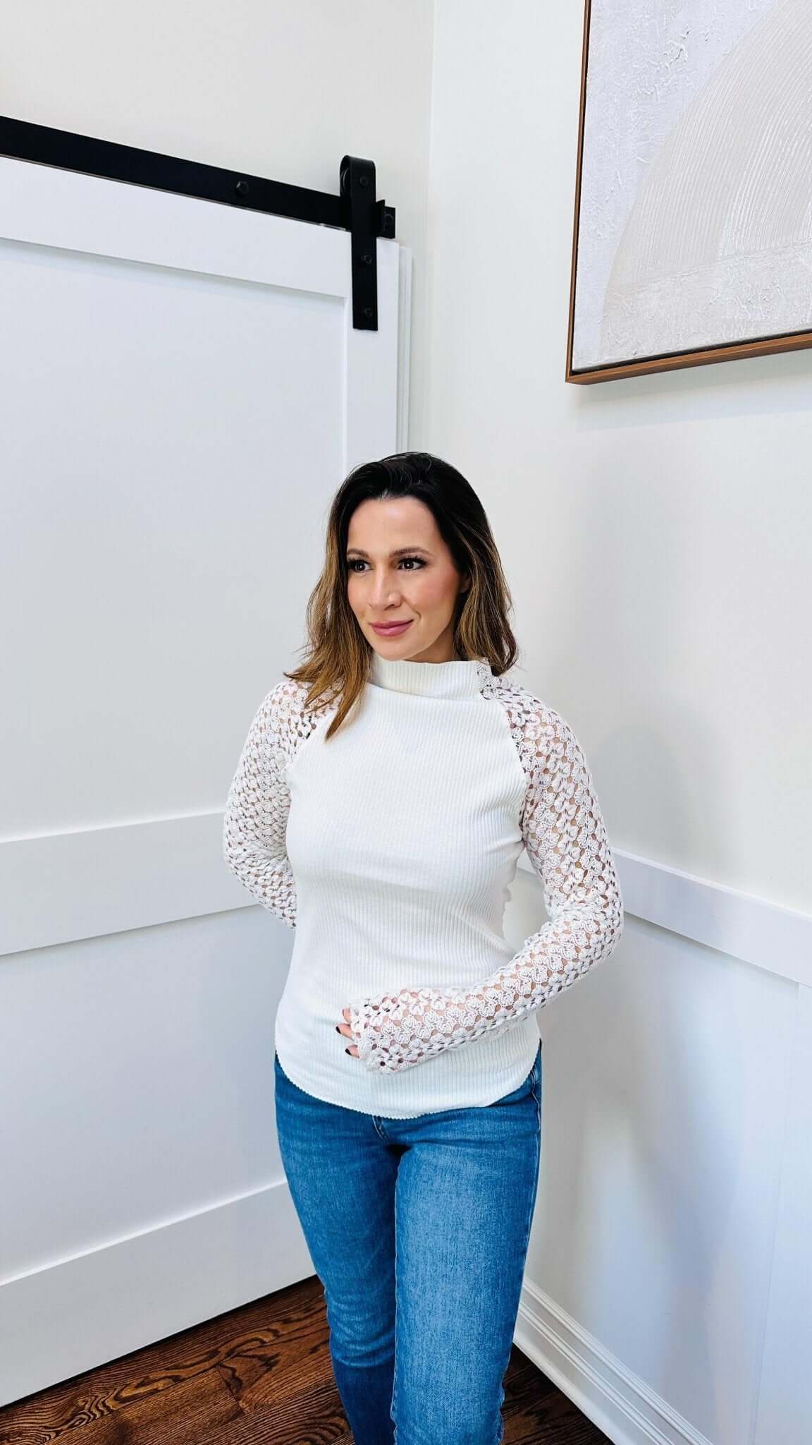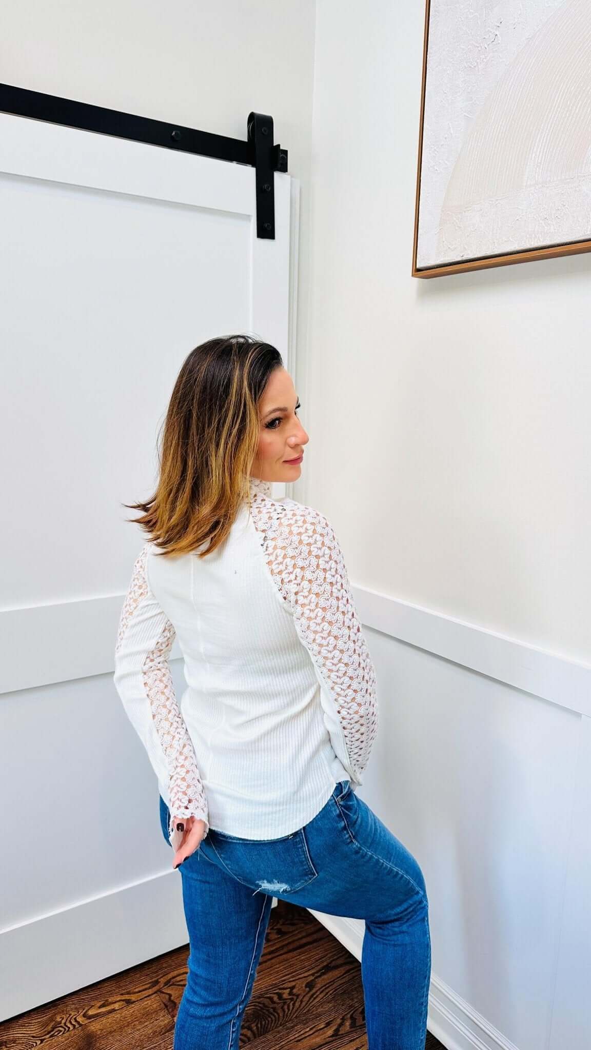 The Suri Top offers a refined and sophisticated look with its white turtleneck design and elegant crochet sleeves. Stay warm while exuding an air of elegance and style. Perfect for any occasion.