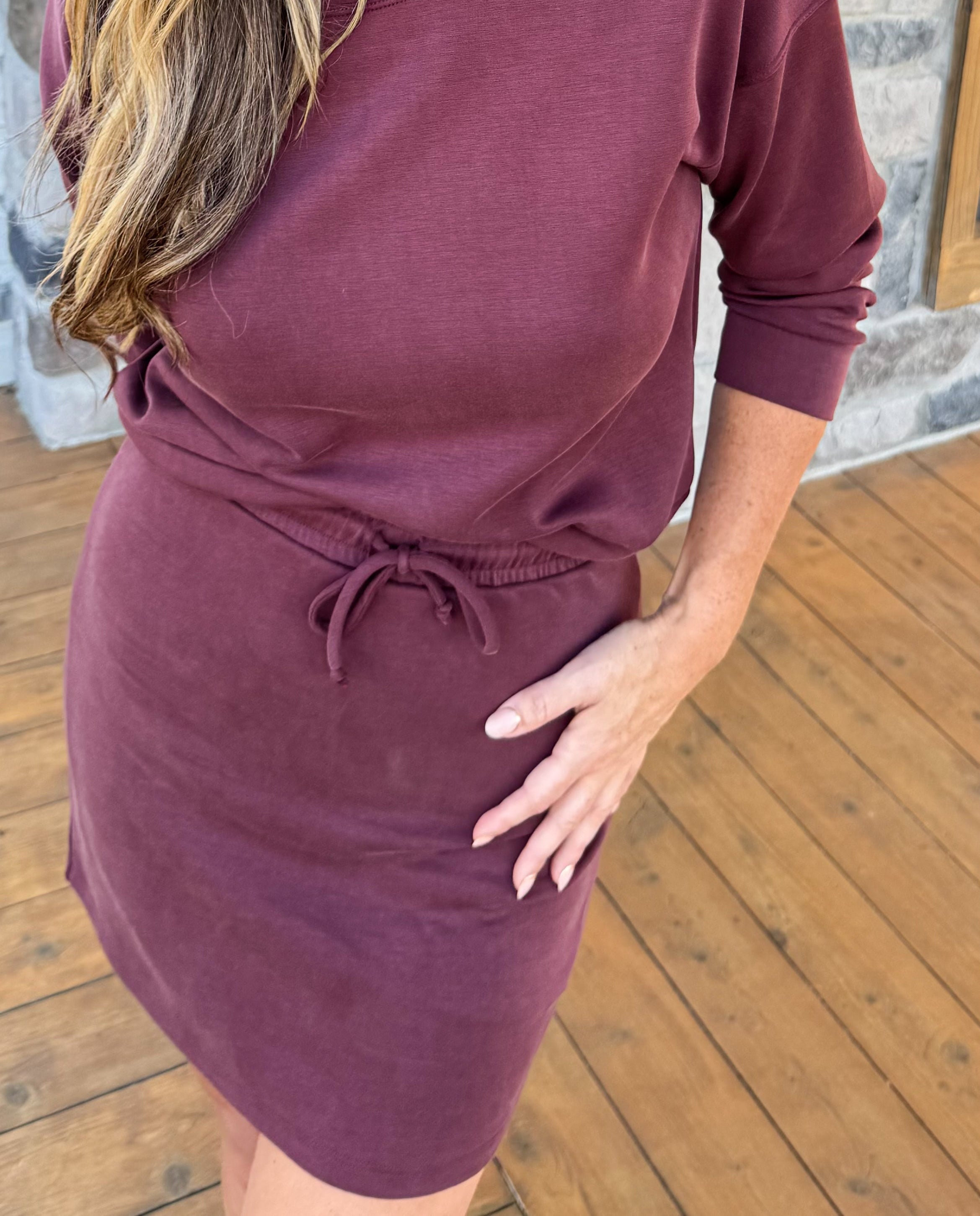 Everyday luxury, reimagined. The Elara Set pairs an ultra-soft, silky round-neck sweatshirt with a tailored-yet-relaxed fit and a playful matching skort in a gorgeous wine color. Designed for comfort without sacrificing style, this duo is equal parts lounge-worthy and street-ready—your go-to uniform for everything from errands to brunch.