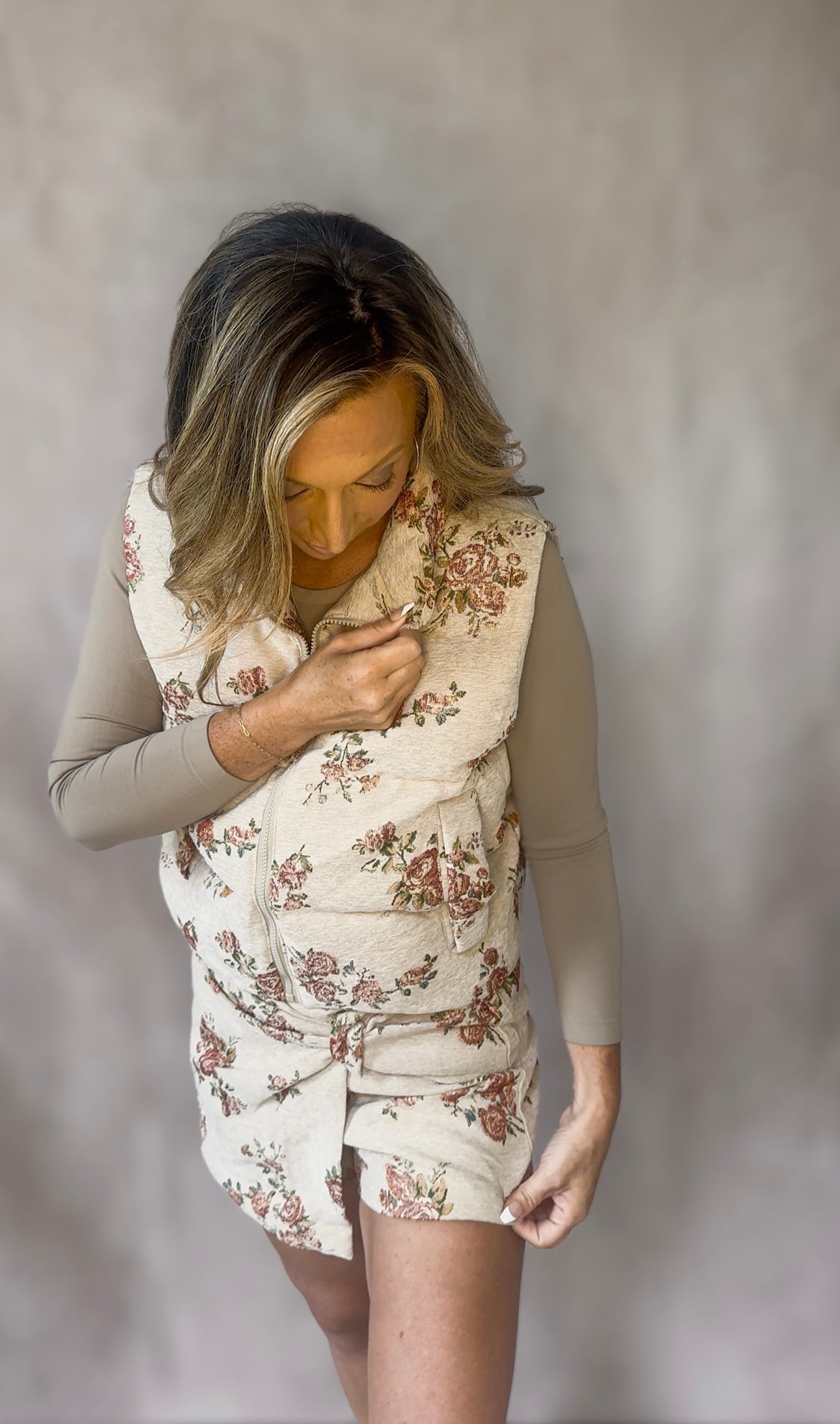 Statement-making yet so wearable. The Fiona Set features a tailored embroidered jacquard skort in soft taupe, finished with rich fall florals in green and mauve. It’s paired with a coordinating puffer vest that adds the perfect layer of warmth without sacrificing style. This set gives polished, feminine, and cozy all at once—whether you’re heading to brunch, grabbing coffee, or soaking up a crisp autumn afternoon.