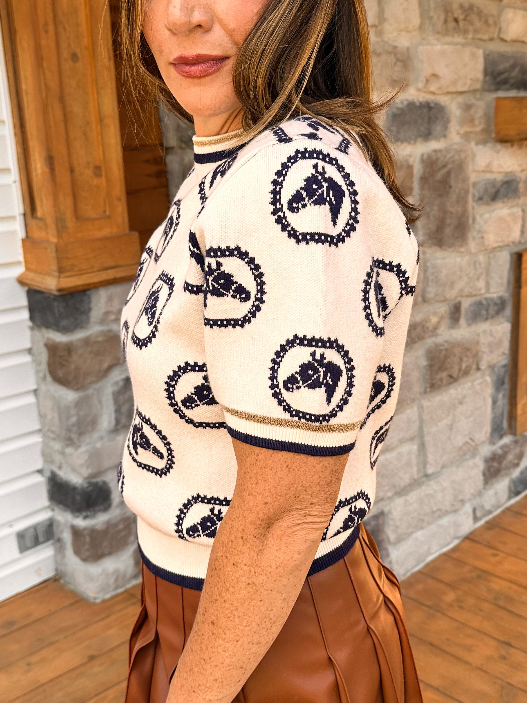 Equestrian elegance meets everyday luxury. The Navy Stallion Sweater is a short-sleeve statement knit crafted from a thick, structured woven fabric for a rich, elevated feel. Designed with a creamy white base and bold navy horse head motif, it balances classic and eye-catching perfectly. Finished with metallic gold ribbed trim at the sleeves and hem for just the right hint of shine. Polished enough to dress up, but easy enough to wear on repeat.