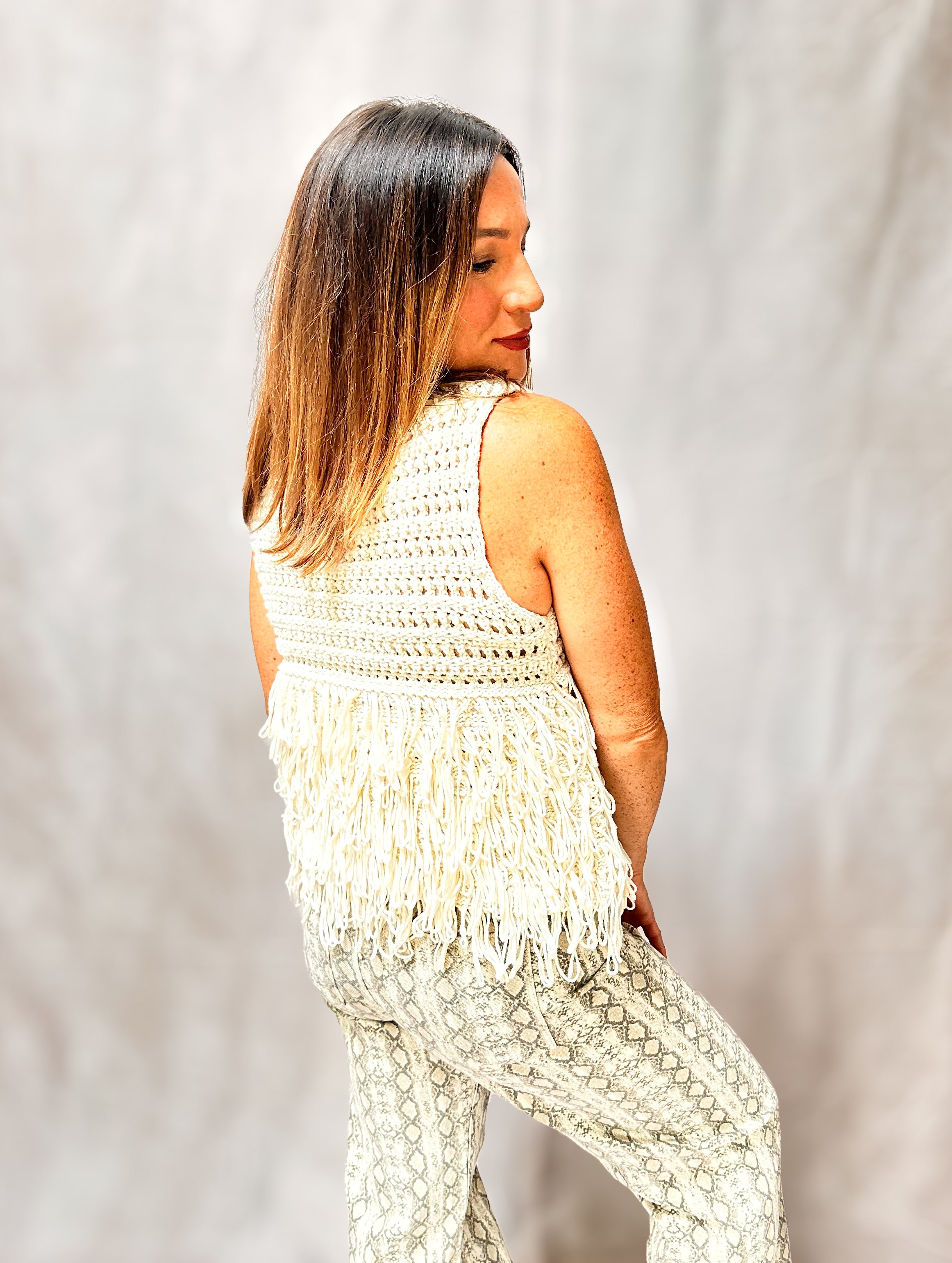 Coastal charm with a touch of texture. The Montauk Sweater Vest is an off-white, open-knit piece with effortless layering appeal—featuring fringe trim along the hem for a breezy, beach-meets-boho vibe. With its relaxed fit and soft drape, it’s perfect over a tank, tee, or button-up. Lightweight but cozy, this vest brings all the outfit-making energy without the bulk.
