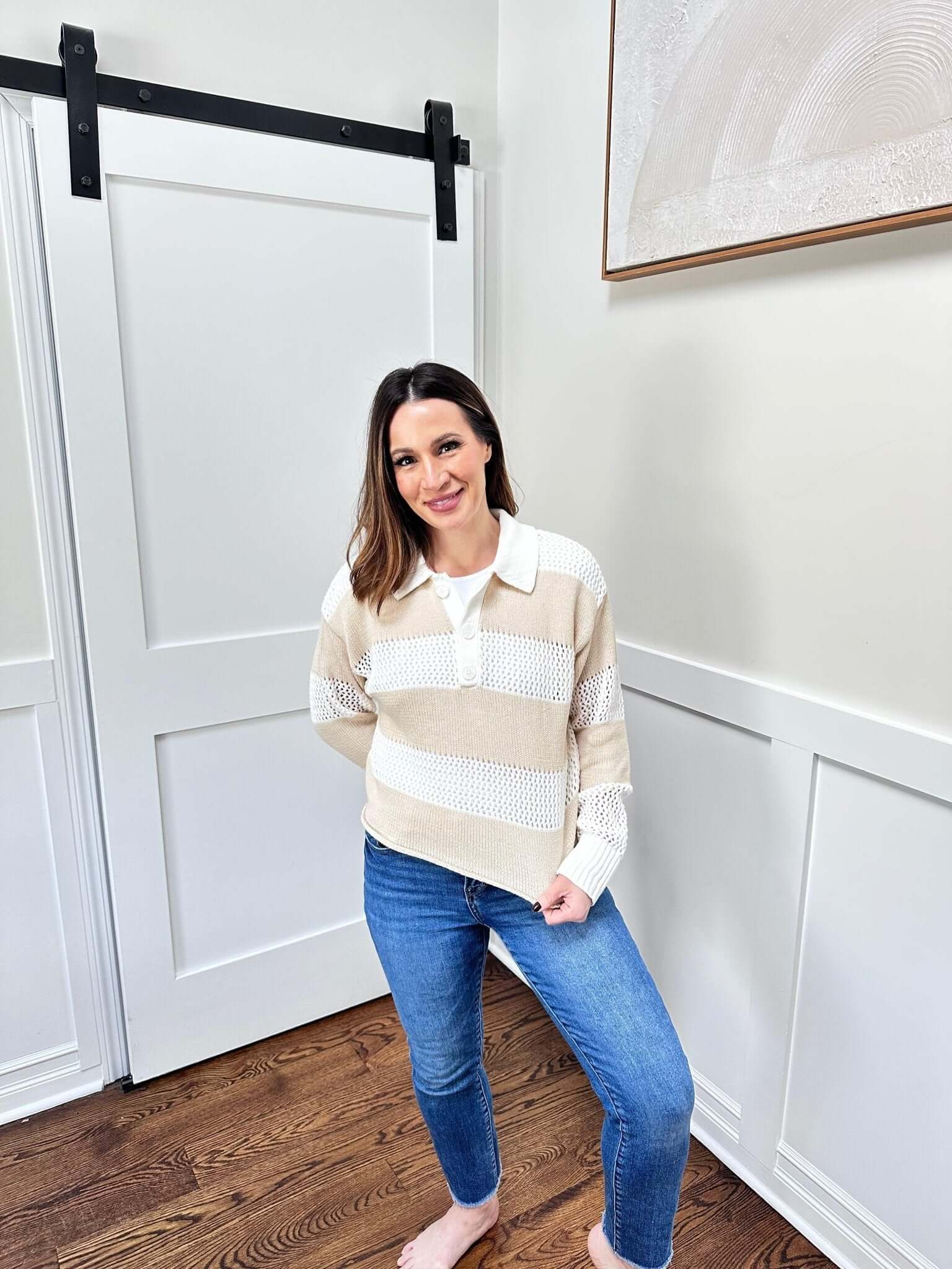 This Oatmeal Knit Sweater features a loose knit design, a comfortable collar, and stylish buttons. Stay warm and cozy with this versatile piece that will be a staple in your wardrobe. Perfect for layering or wearing on its own, this sweater will keep you stylish and comfortable all season long.