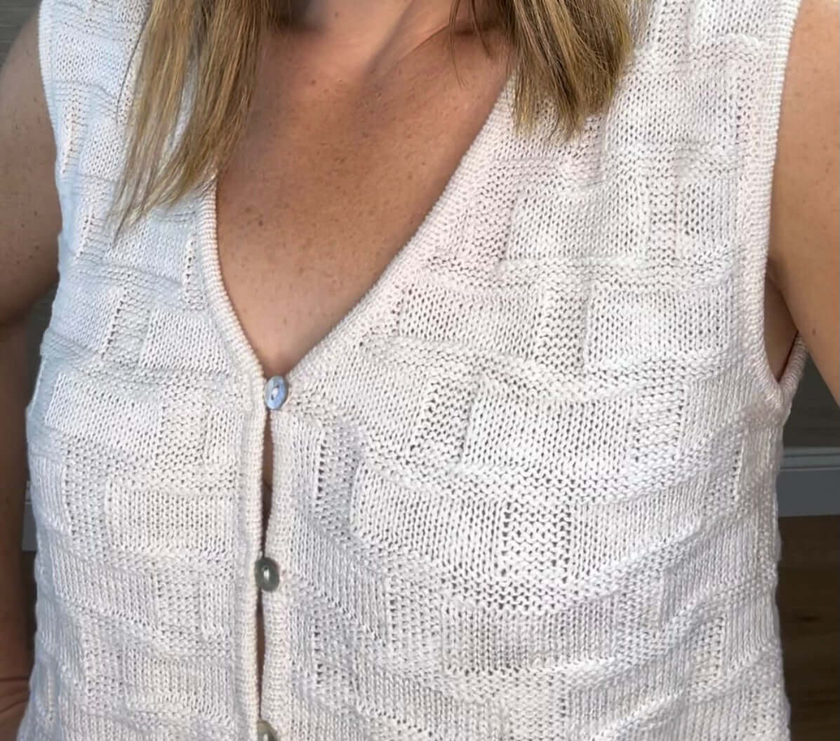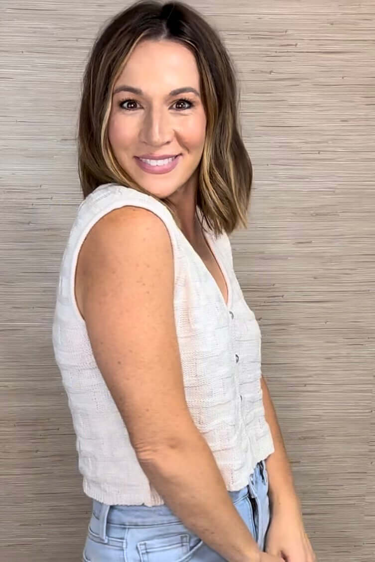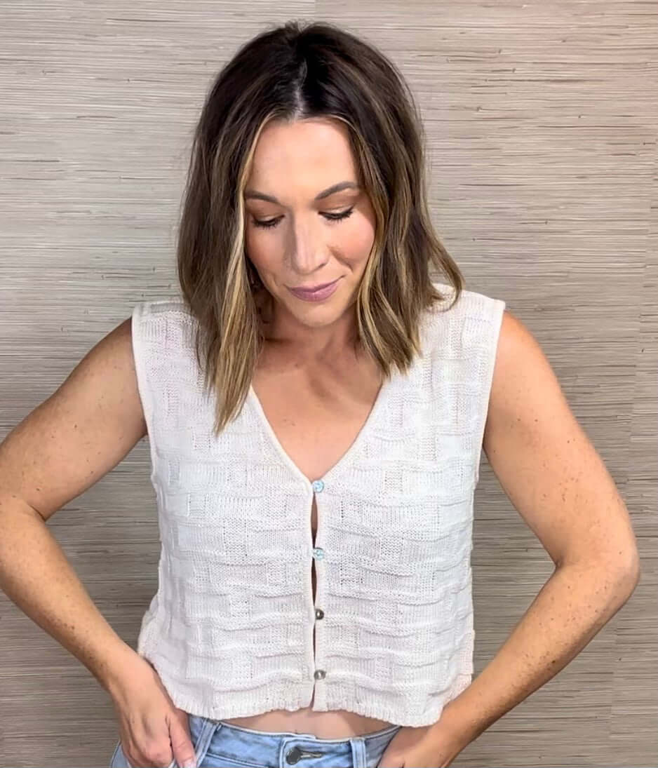 Our Clara top is a versatile and stylish button front sleeveless sweater tank. Made in a beautiful knit, this ivory colored top offers a boxy, slightly cropped fit that is both trendy and comfortable. Perfect for any occasion, The Clara is a must-have addition to your wardrobe.