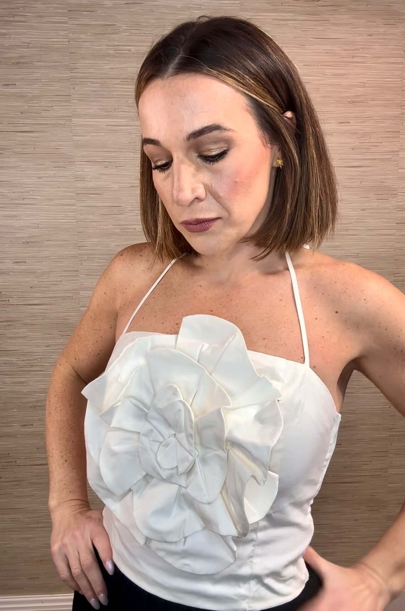 Hey, Trendsetter! Ready to turn heads and break hearts? Introducing our Melody Rosette Halter Top, the ultimate statement piece for on-trend ladies like you!