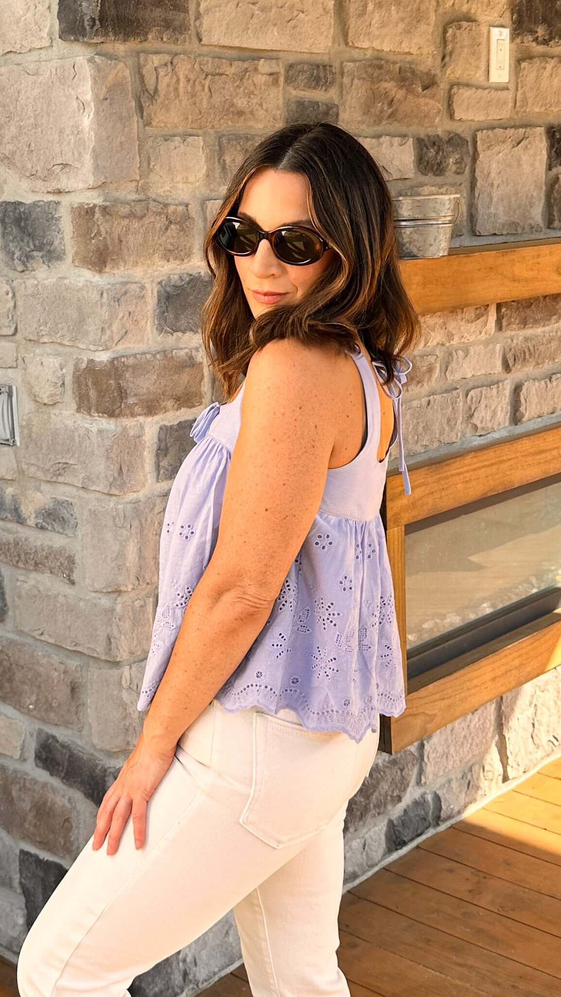 Add a little charm to your everyday rotation with The Tessa, a periwinkle tank with scalloped eyelet trim and sweet tie details at the front and back. Lightweight and breathable, it’s designed with a hint of swing through the body—perfect for warm days when you want to look cute and feel comfy. Feminine, fresh, and endlessly easy to wear.