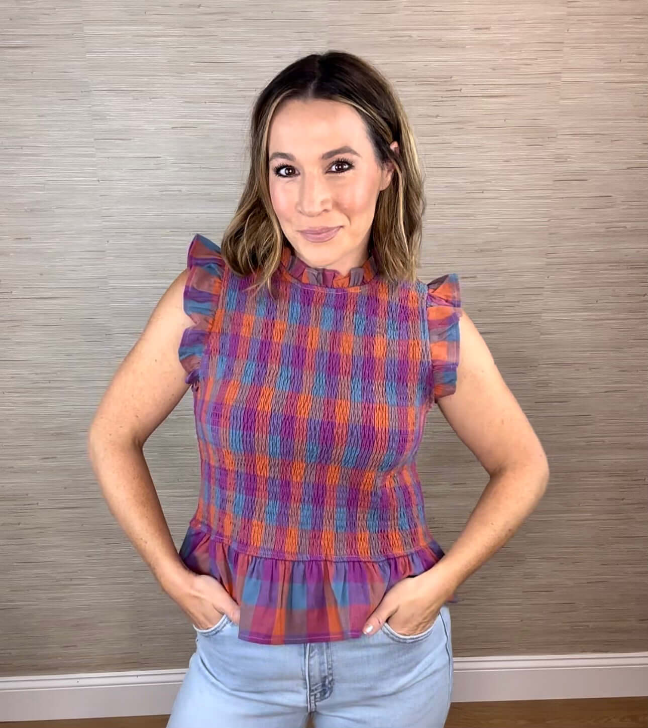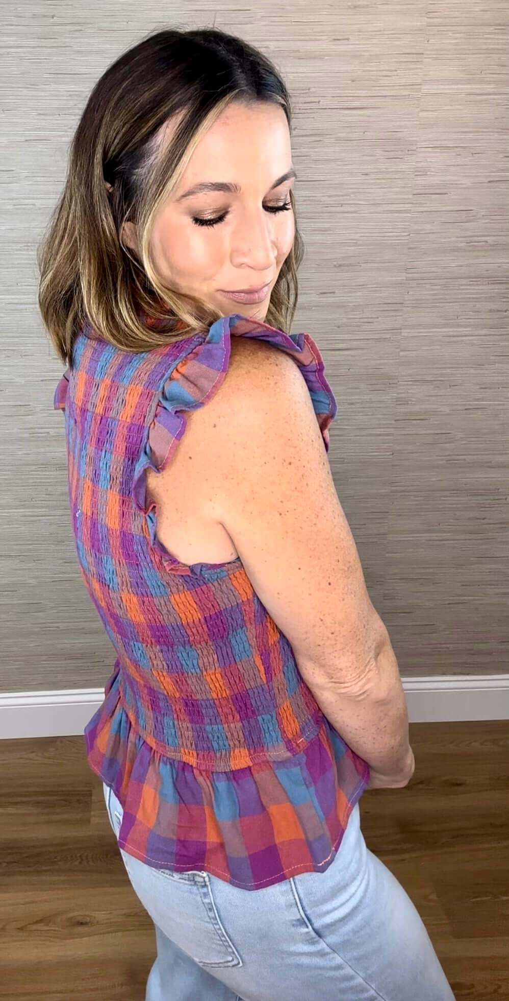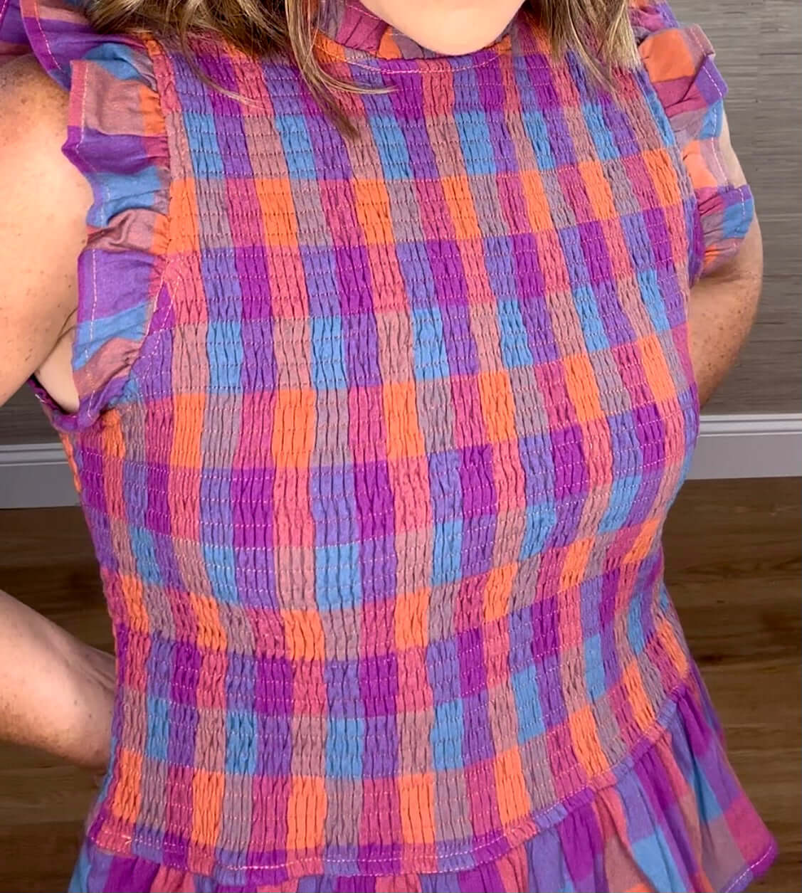 Indulge in effortless style with our madras plaid Tank! This ruffle sleeve top features a unique plaid design that adds a touch of playful charm to your wardrobe. Made with soft and lightweight fabric, it provides all-day comfort while making a statement. Perfect for any occasion, you'll love how it elevates your look!