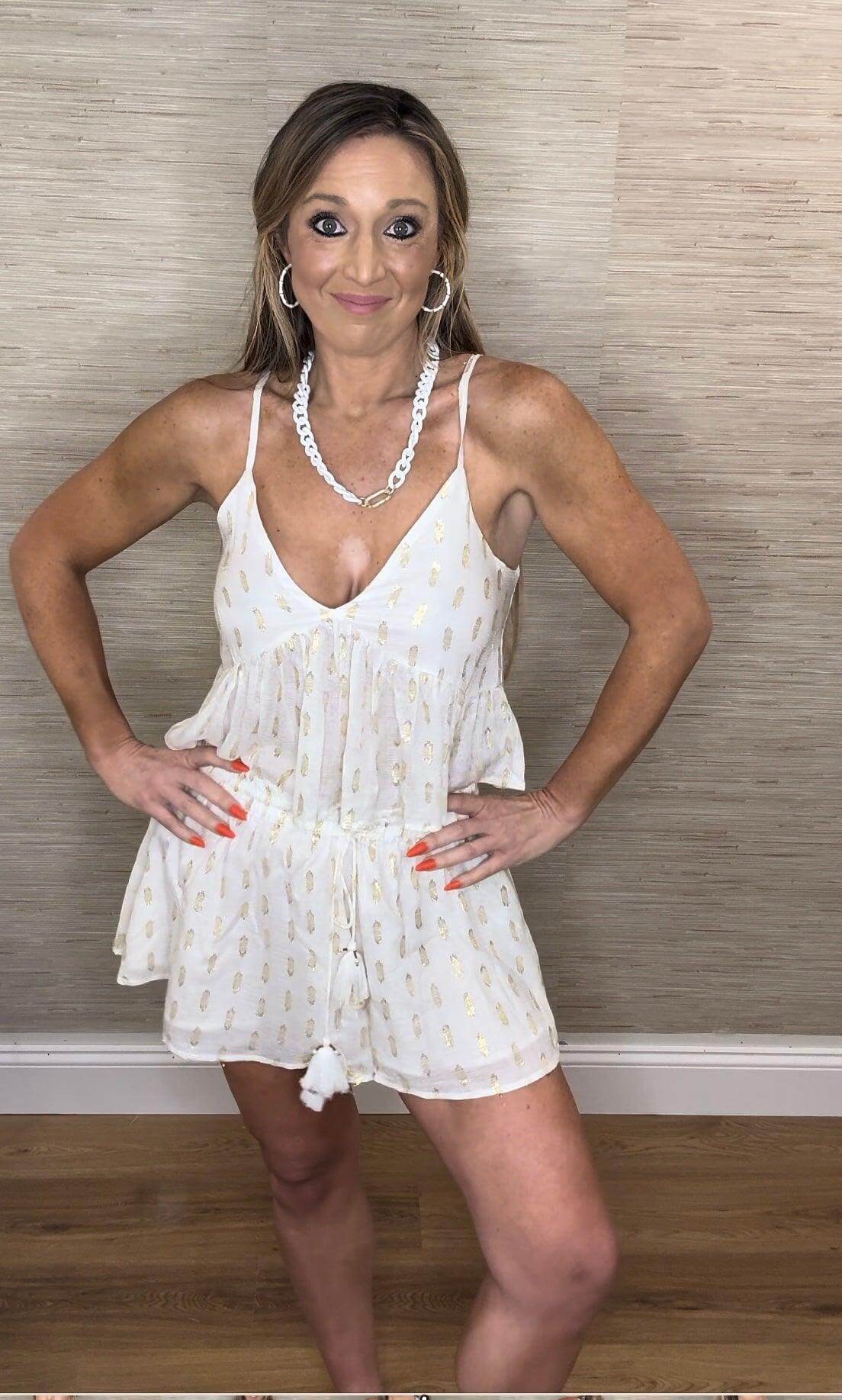 Get ready to stand out in style with our White Clipped Metallic Tank! This unique tank features a subtle metallic finish and a playful clipped design. Perfect for a fun and lighthearted look, this tank will add a touch of quirkiness to any outfit. Don't miss out on this must-have piece!