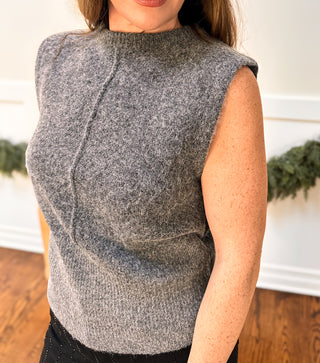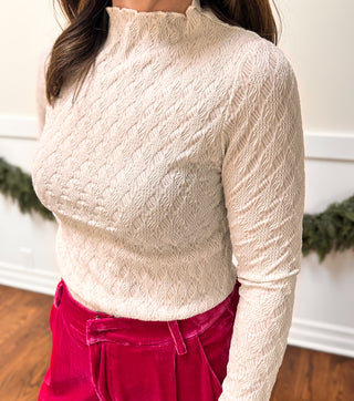 Woman wearing ivory sweater with teddy bear skiers and snowflake accents