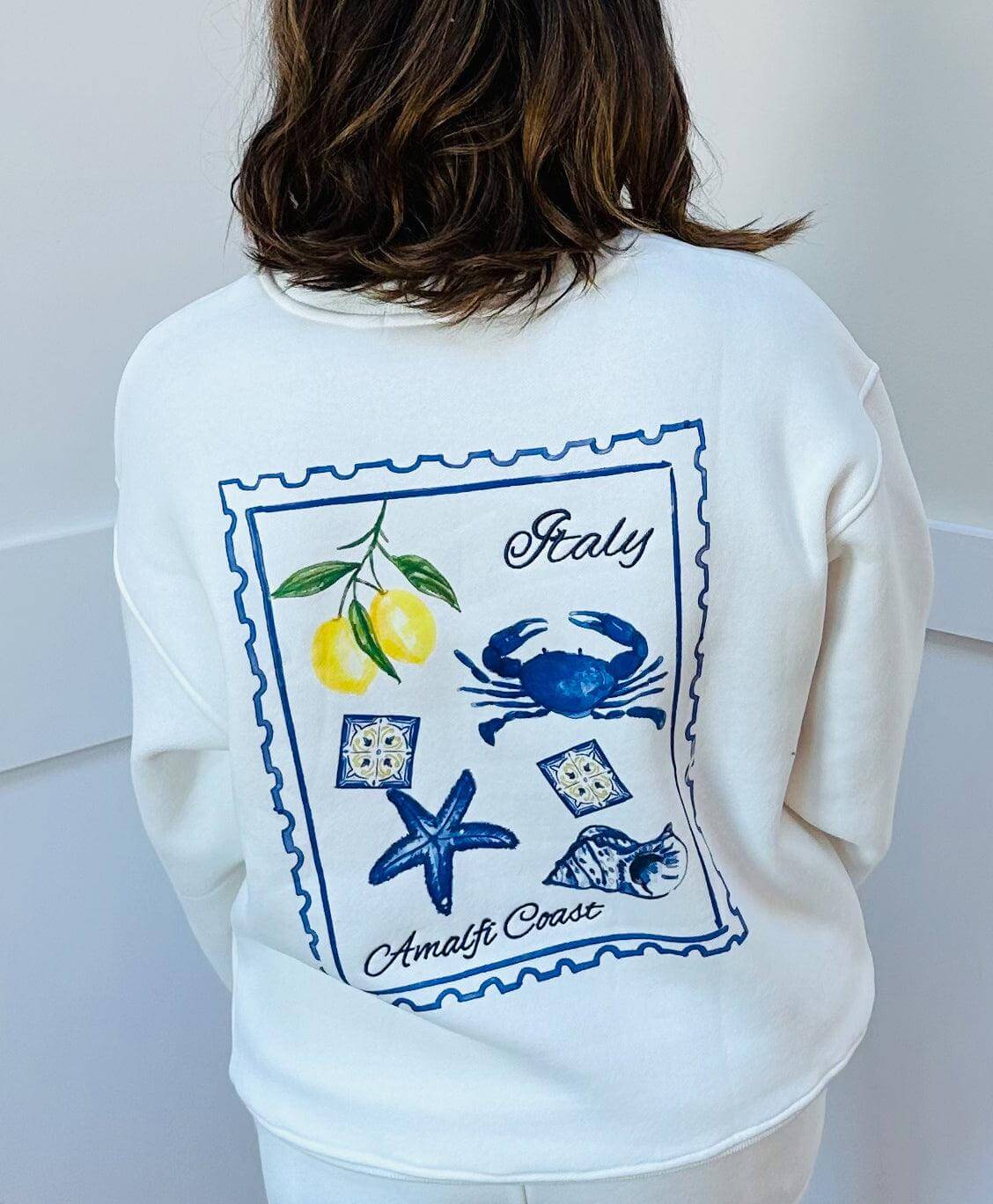Unleash your inner Italian fashionista with our Amalfi Coast Sweat Set. This white terry short set features dolce vita vibes and playful graphics on the back of the shirt. With an embroidered Amalfi Coast Positano design on the sweatshirt and an elastic waist with pockets on the shorts, you'll be both stylish and comfortable.