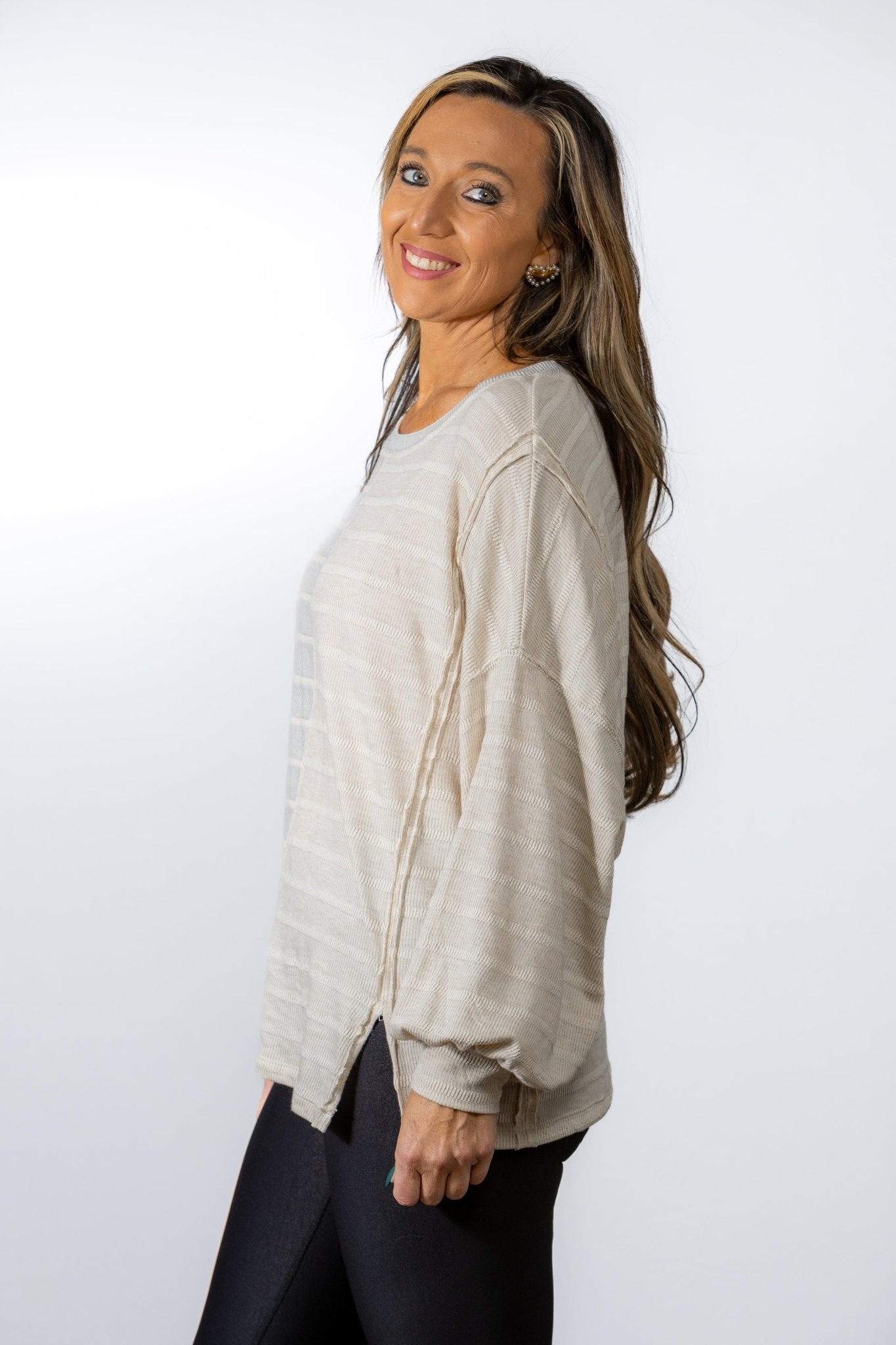 Fall in love with our Basic Striped Tee in grey, white, and cream. Perfect for any occasion, this tee is both comfortable and stylish. Elevate your wardrobe with this must-have piece.