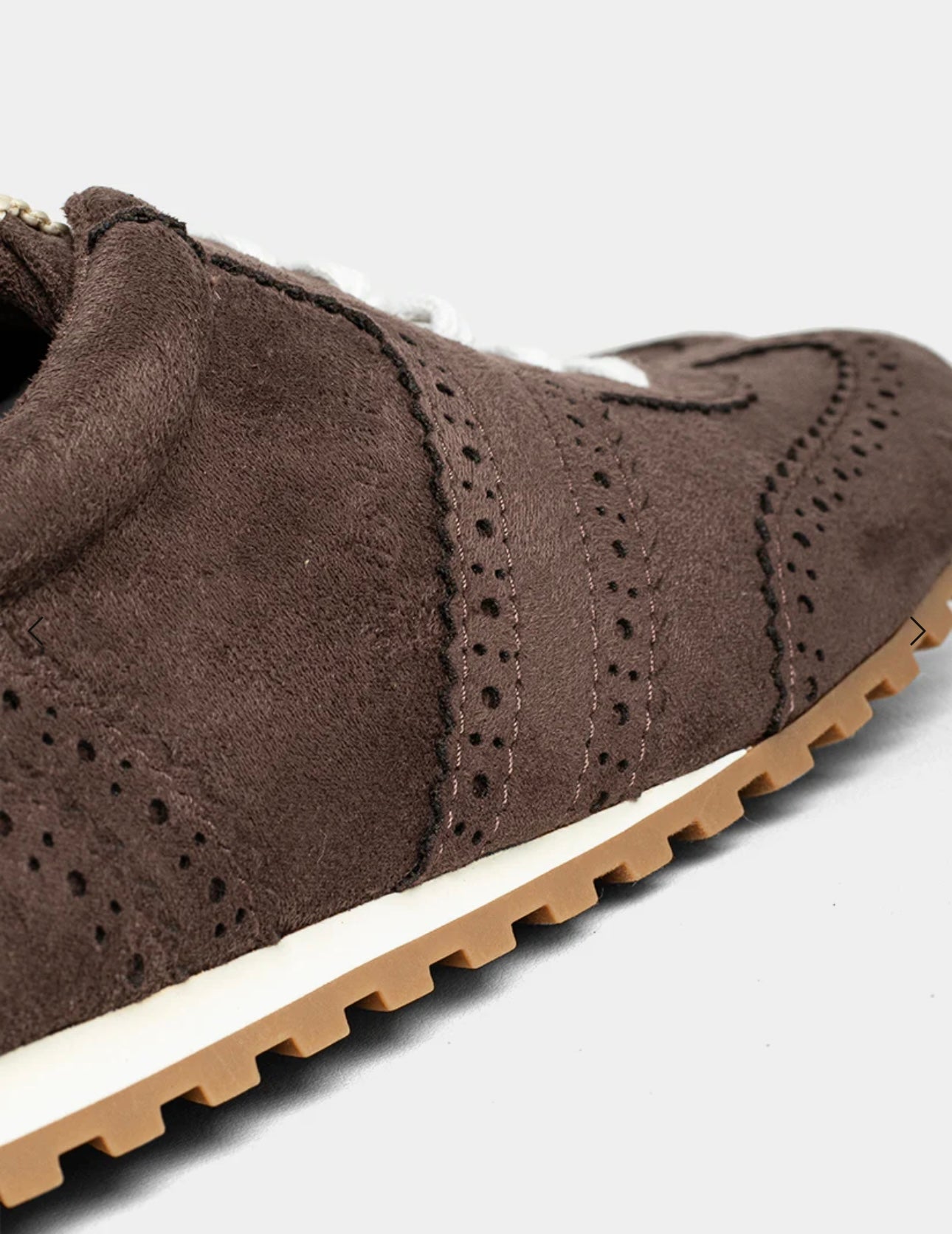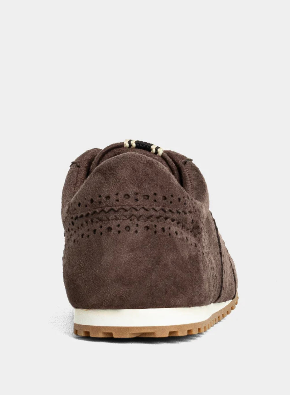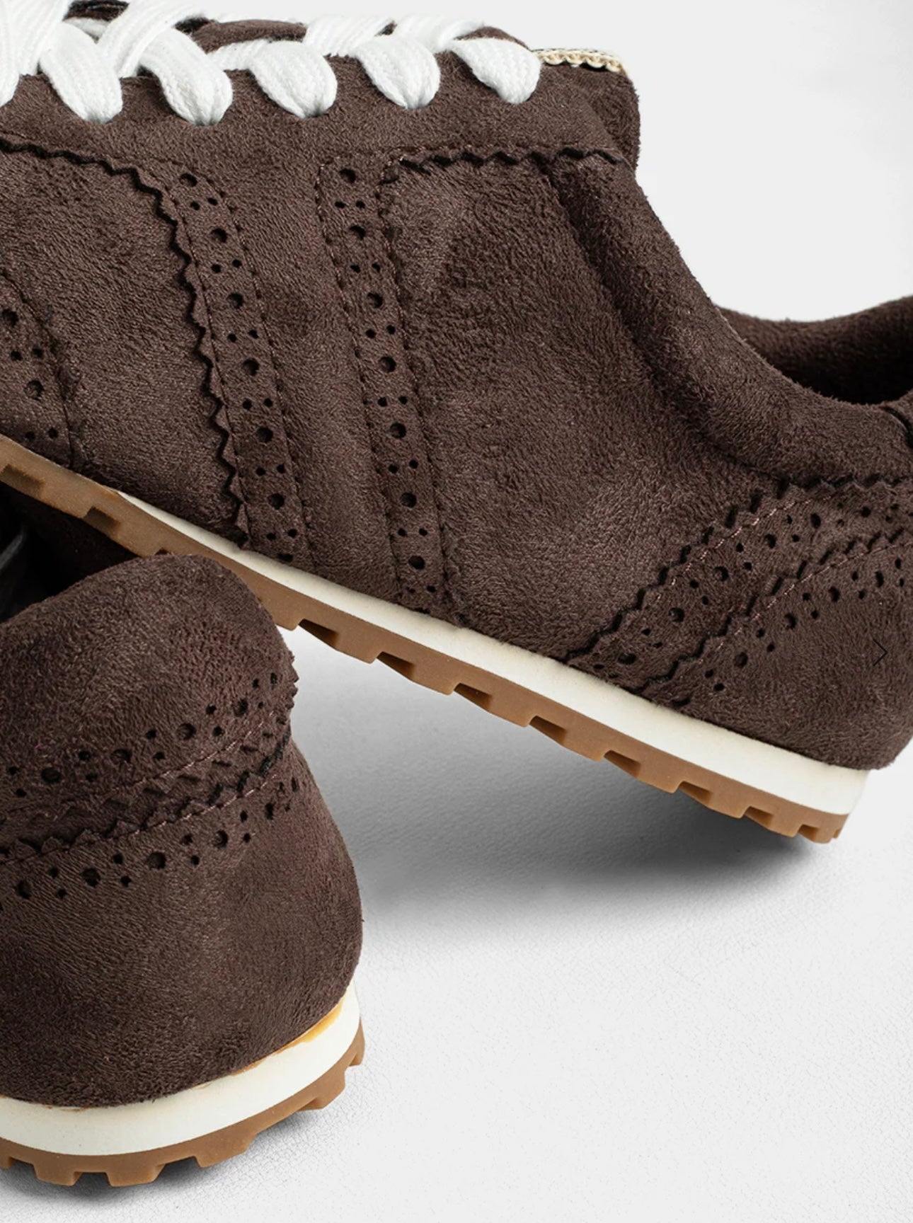 Retro charm, redefined. The PENELOPE sneaker in rich brown suede-texture brings a grounded, heritage feel to your wardrobe. With its brogue-style perforations, contrast laces, and low-profile silhouette, this style effortlessly blends sporty and sophisticated energy. Dress it up with tailored denim or keep it casual with wide-leg trousers-this one’s built for versatility.