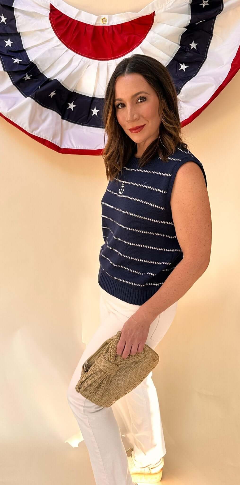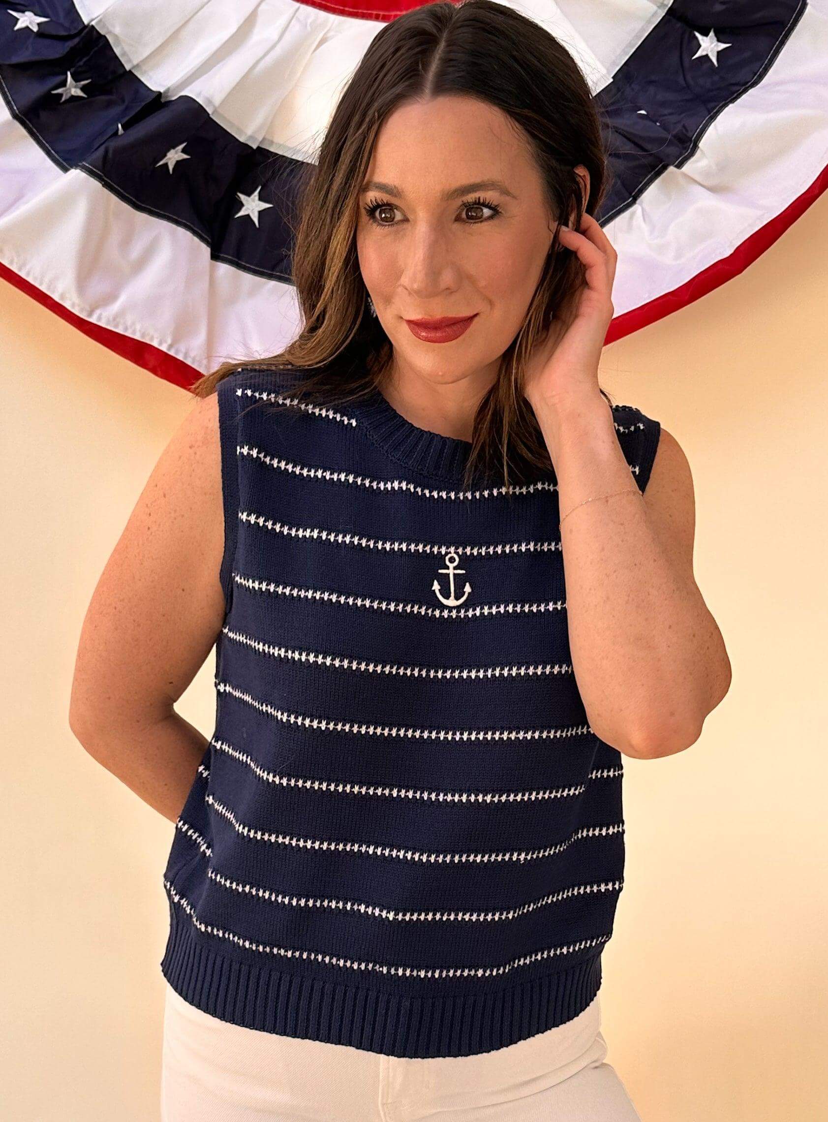 Set sail in style with our Anchor Sweater Tank. This navy blue sweater tank features thin white stripes and an embroidered anchor detail in white, adding a touch of nautical charm to your outfit. Perfect for a day out on the water or a casual day on land. Stay comfortably chic all day long!