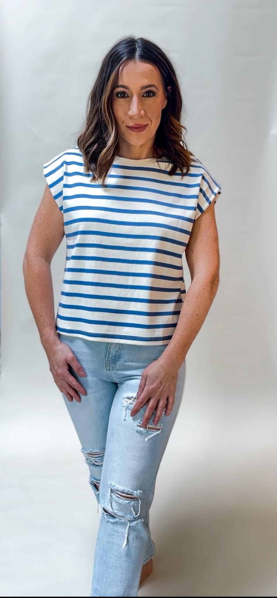 This blue and white striped tank top is a versatile addition to any wardrobe. Made from high-quality materials, it offers both comfort and style. With a classic design, this tank is perfect for any casual occasion and can easily be dressed up or down. Stay cool and fashionable with this must-have piece.
