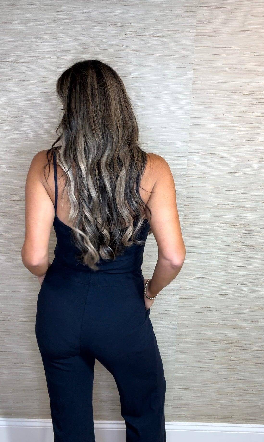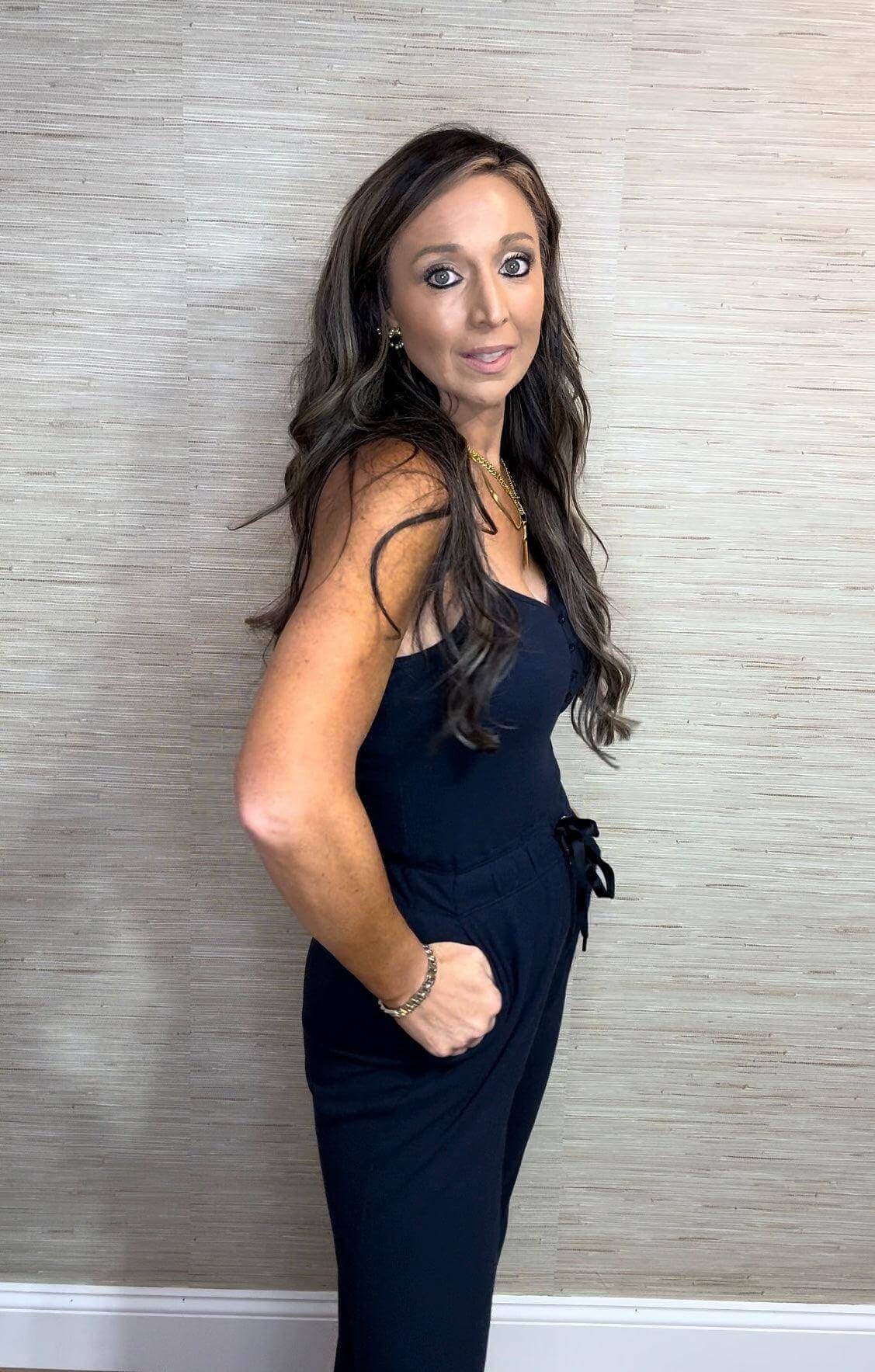 Introducing the Chloe Romper, perfect for your fall wardrobe! This cozy navy blue romper features adjustable spaghetti straps and a stylish tie waist for a comfortable fit, while the wide-leg design and ribbed material add a touch of texture. Ideal for casual outings or lounging at home, this romper pairs effortlessly with your favorite cardigan and ankle boots for a relaxed, yet trendy fall look. Embrace comfort without sacrificing style this season!