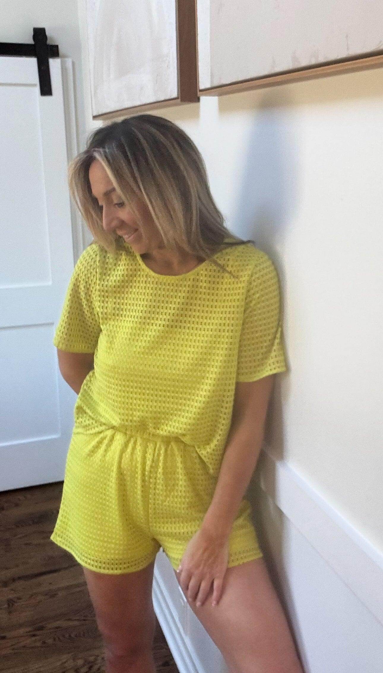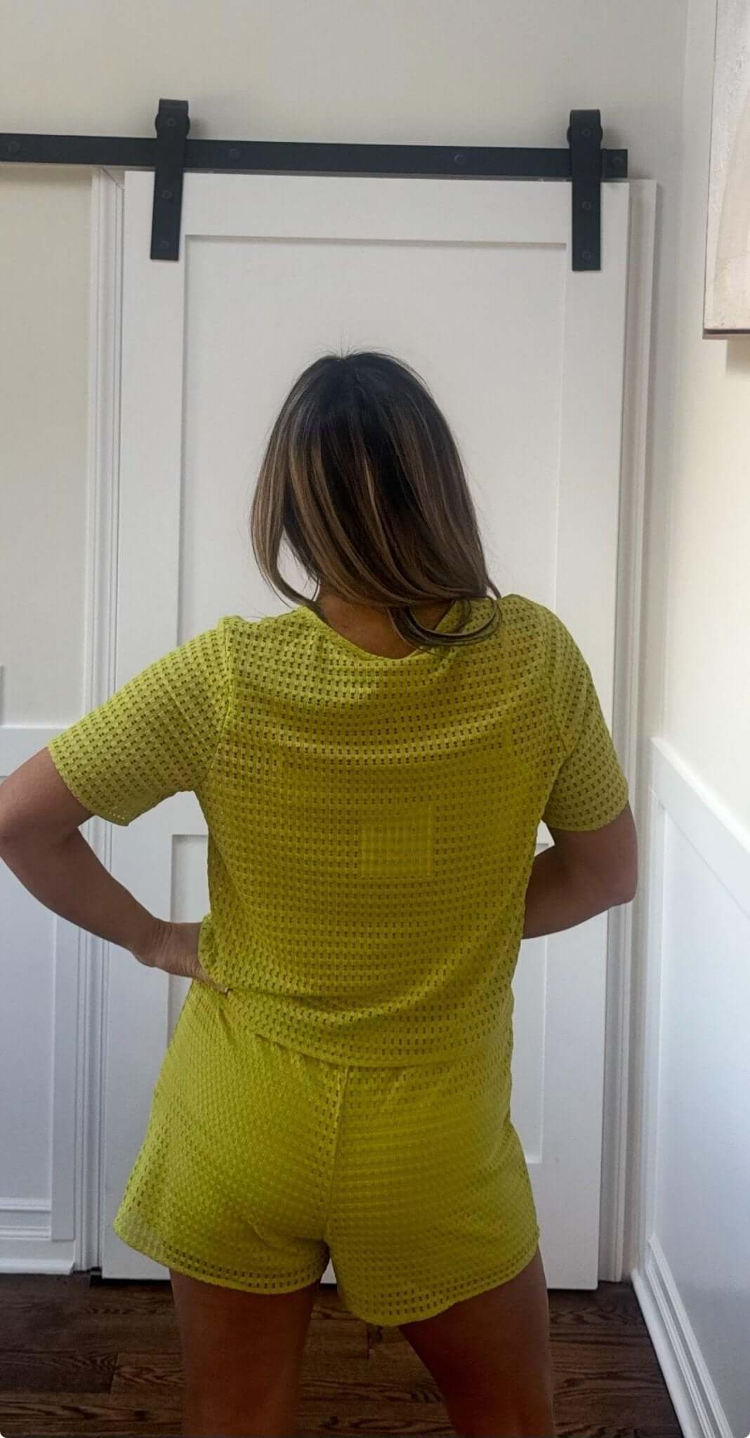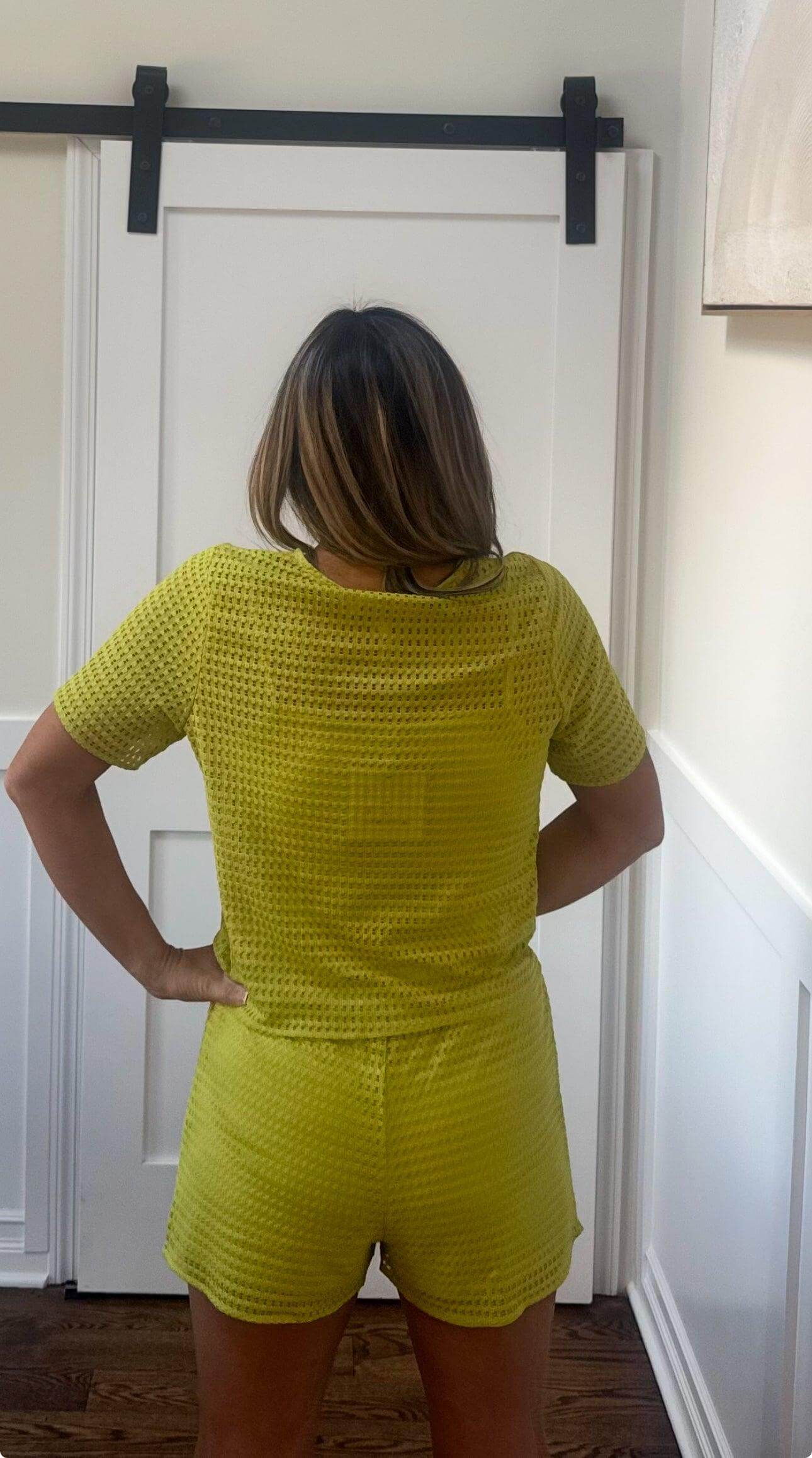 Unleash your laid-back vibes with the Lime Honeycomb Set. Perfect for relaxing days or resort adventures, this textured knit top and shorts duo keeps you cool and comfortable. Its breathable open weave fabric and easy elastic waistband make it a must-have for vacation style or effortless chic looks. Weekend brunch, here we come!