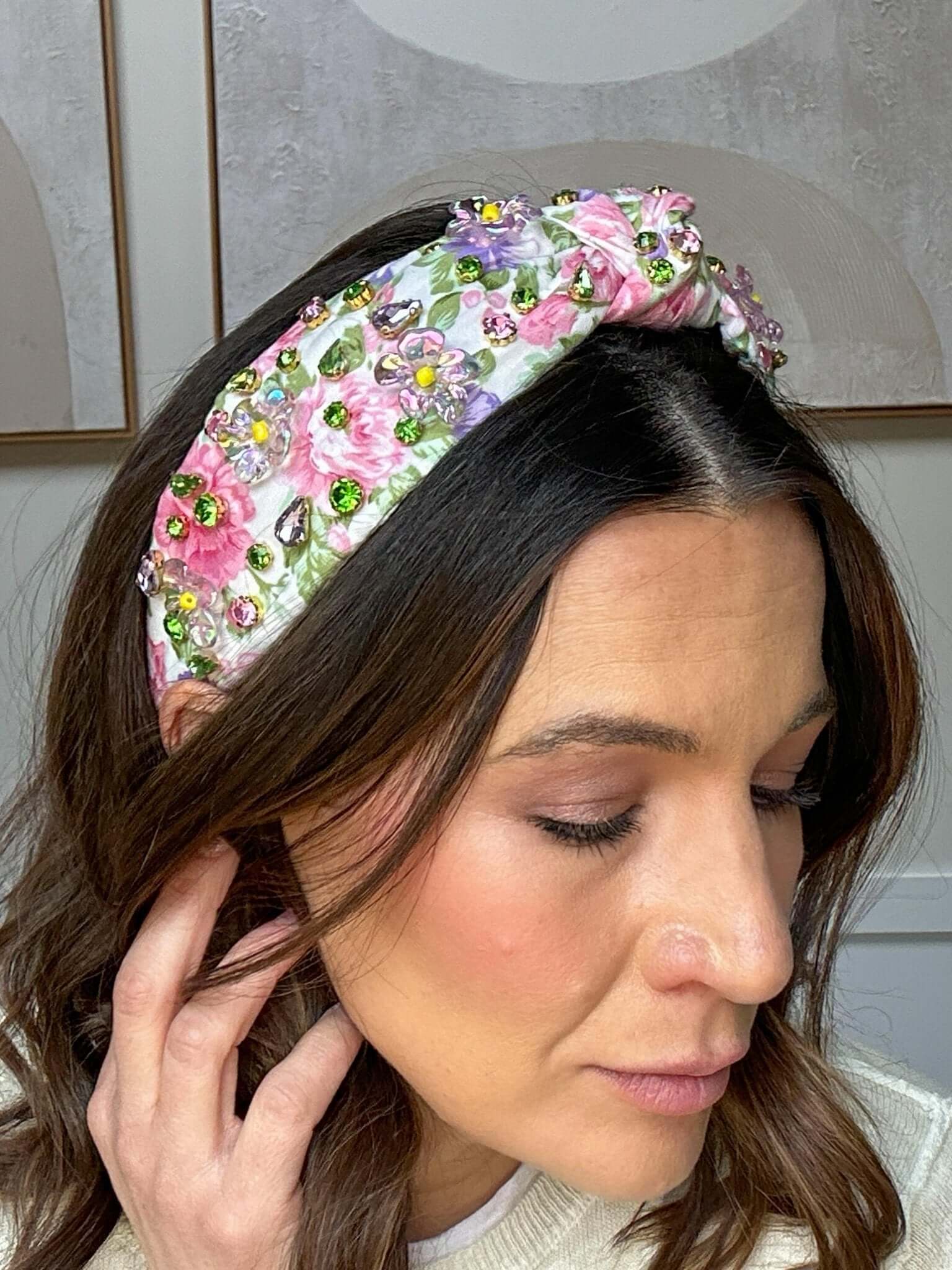 Add a touch of whimsy to your outfit with our Crystal Floral Headband! Featuring delicate pink peonies and lush green leaves on a white base, this headband is adorned with pastel rhinestones for a touch of sparkle. Perfect for adding a playful touch to your look.
