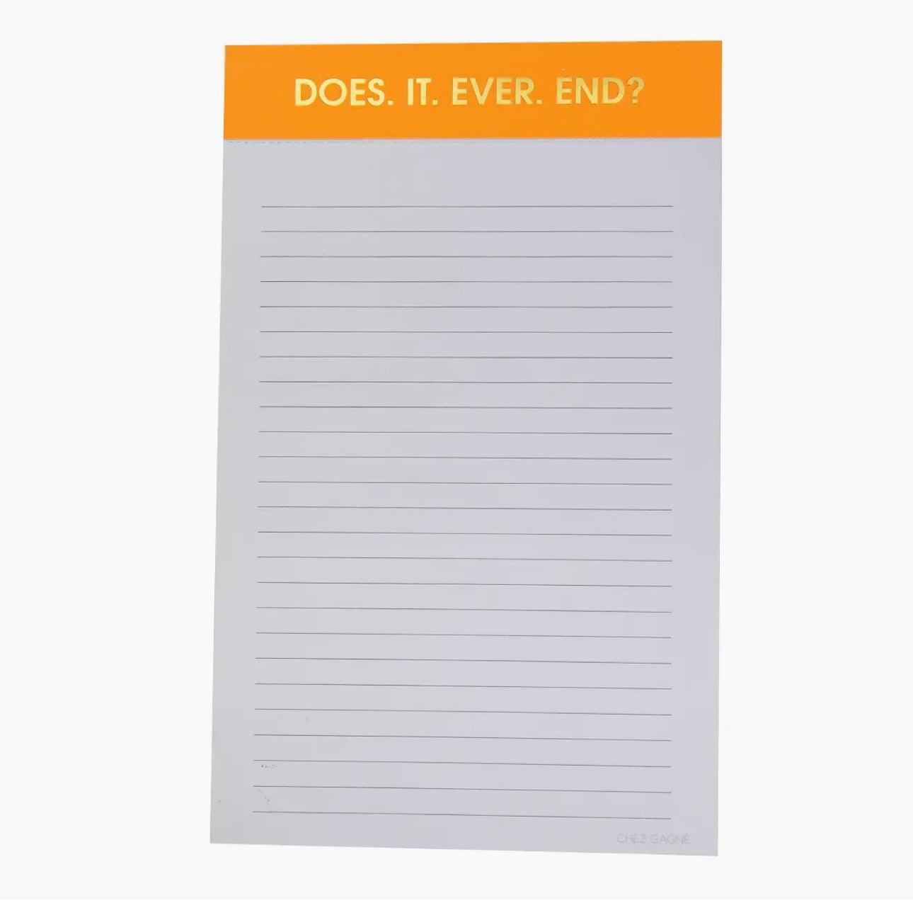 You'll never run out of space to jot down those brilliant ideas with our Does It Ever End Note Pad! Clever, right? The 65 lined and perforated pages make it easy to tear out and share or discard your notes. And with the vibrant neon tangerine cover and gold foil printing, you'll feel extra fancy. Plus, it's made with FSC certified paper, so you can feel good about writing on it. It's shrink wrapped and 5" x 8", making it the perfect size for your desk, bag, or pocket! Go ahead, write on!