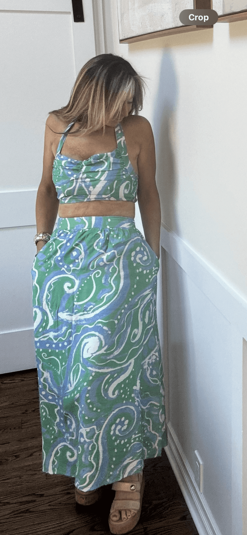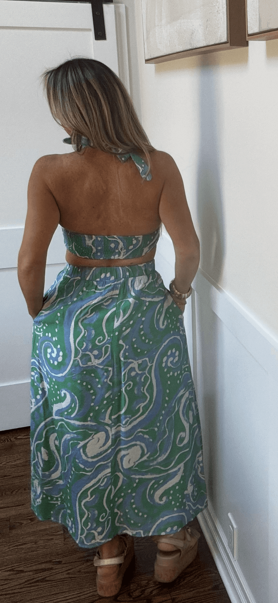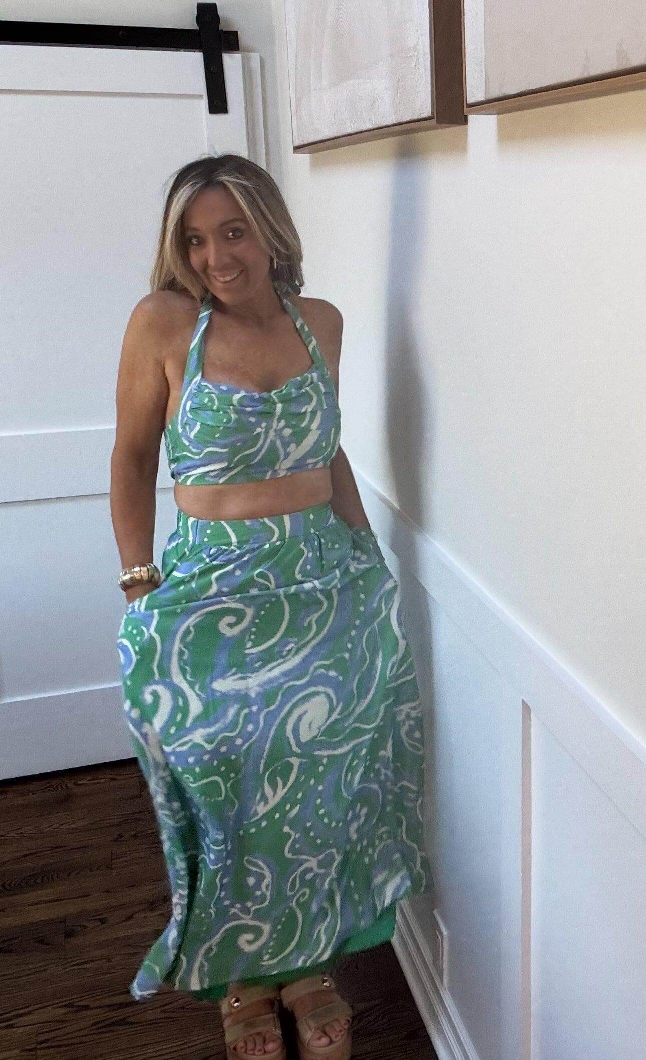 Shake your tail feathers in style with our Flamingo Dancing Set! This two piece set features a playful green and blue skirt with convenient pockets and a matching halter crop top with a sweetheart neckline. Get ready to dance the night away in this quirky and fun outfit.