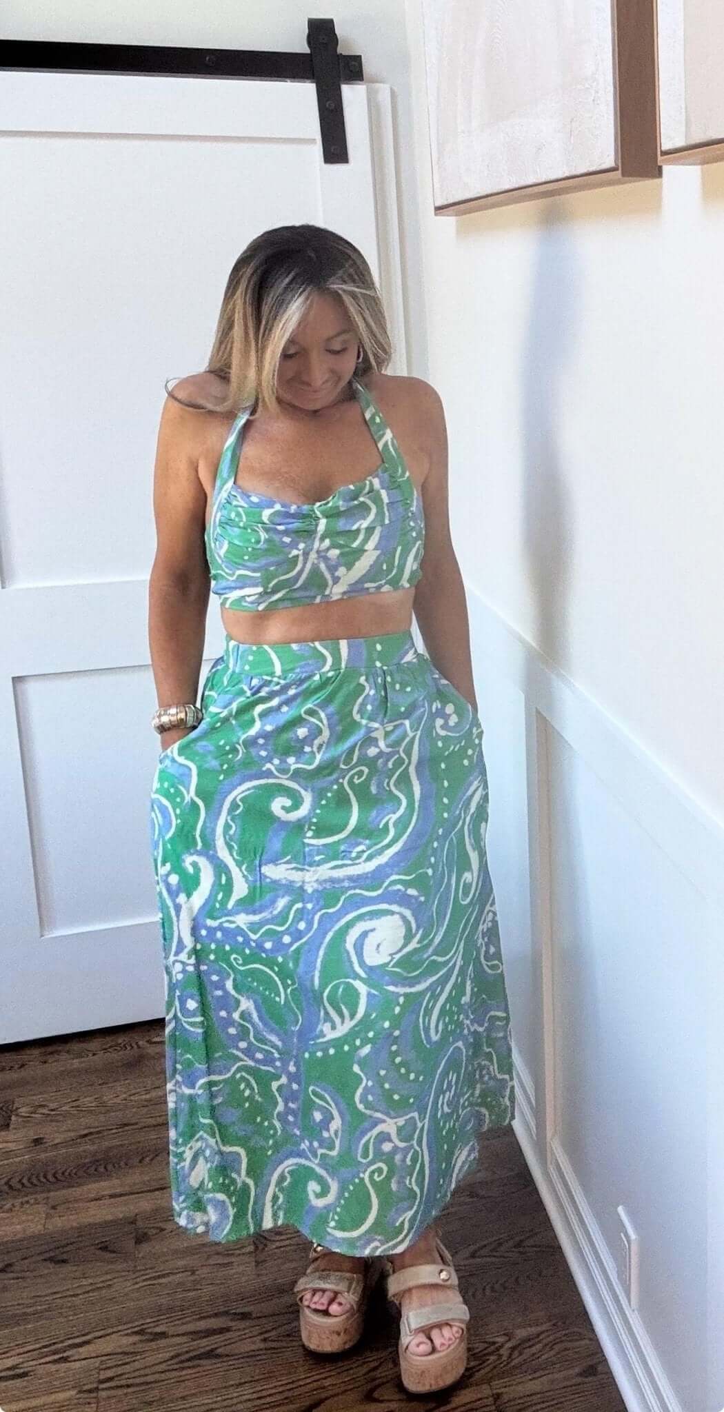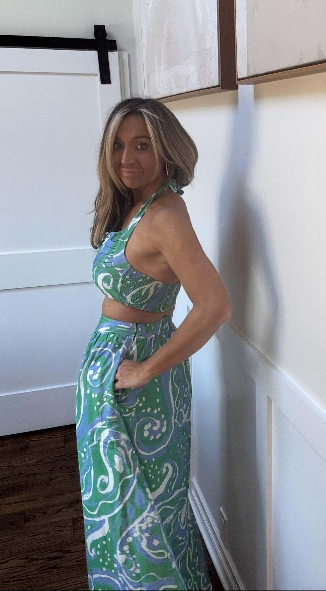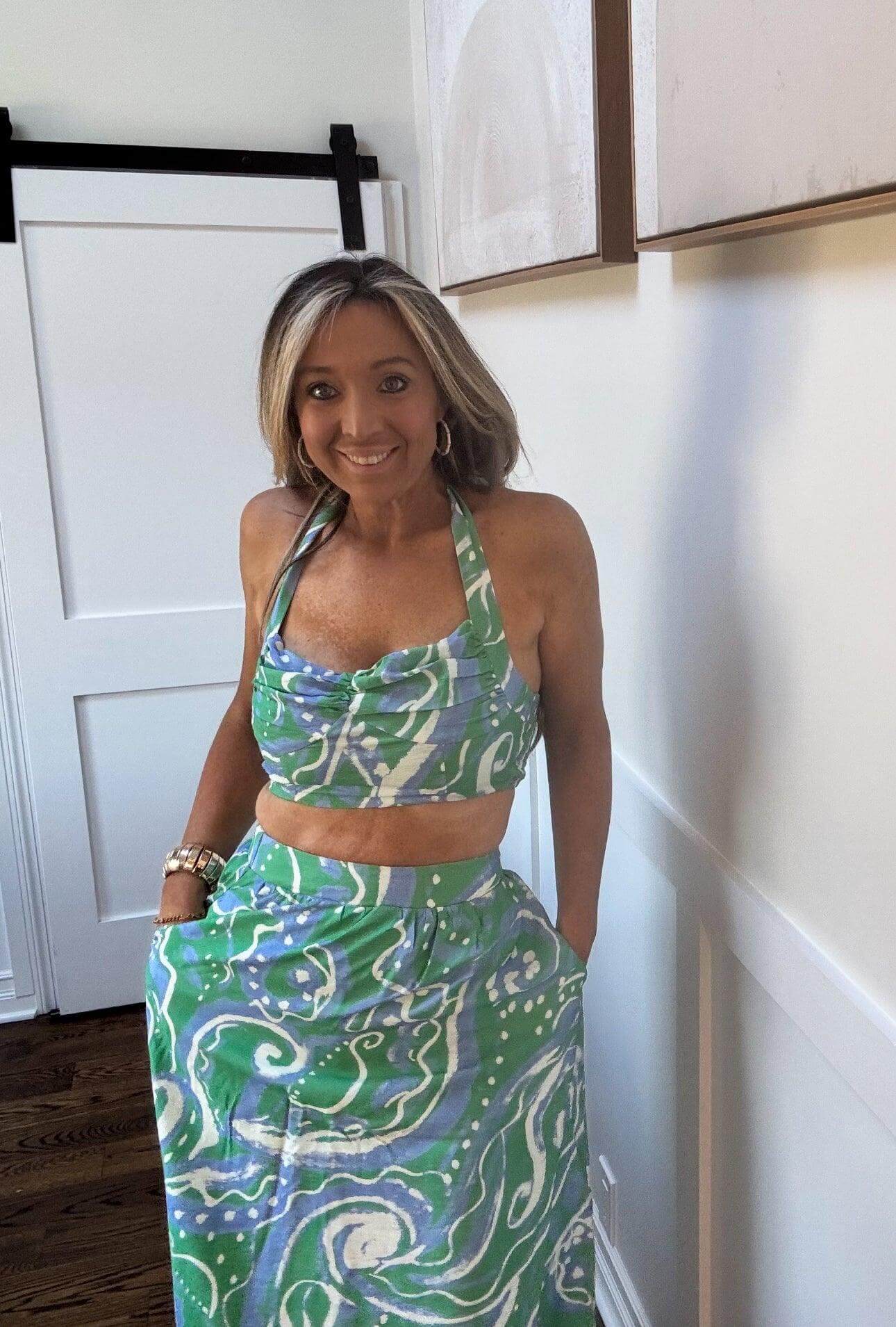 Shake your tail feathers in style with our Flamingo Dancing Set! This two piece set features a playful green and blue skirt with convenient pockets and a matching halter crop top with a sweetheart neckline. Get ready to dance the night away in this quirky and fun outfit.