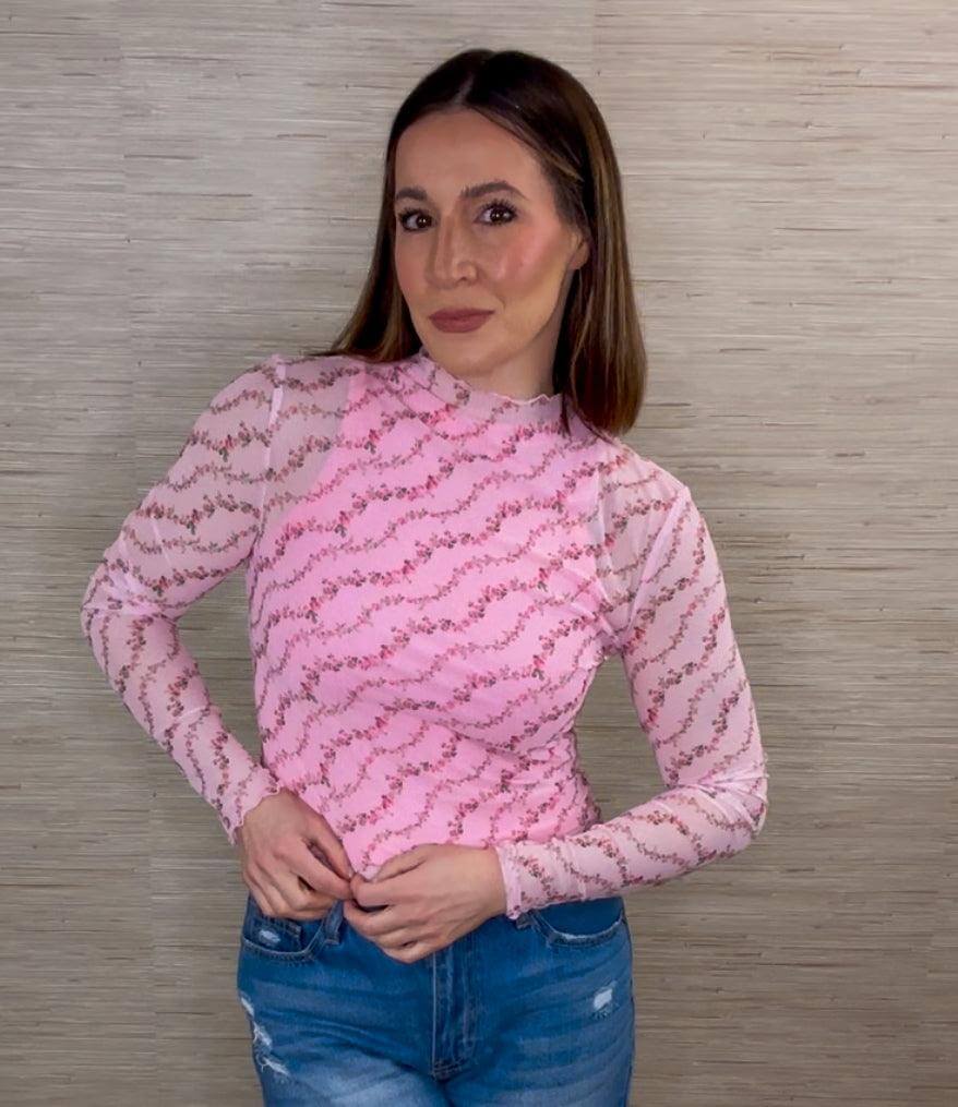 Elevate your wardrobe with our Floral Printed Mesh Top! Featuring a delicate ditsy floral pattern and lettuce edges at the waist, sleeves, and mock neck, this sheer top is a must-have for any fashionista. Add a touch of feminine charm to any outfit with this piece!