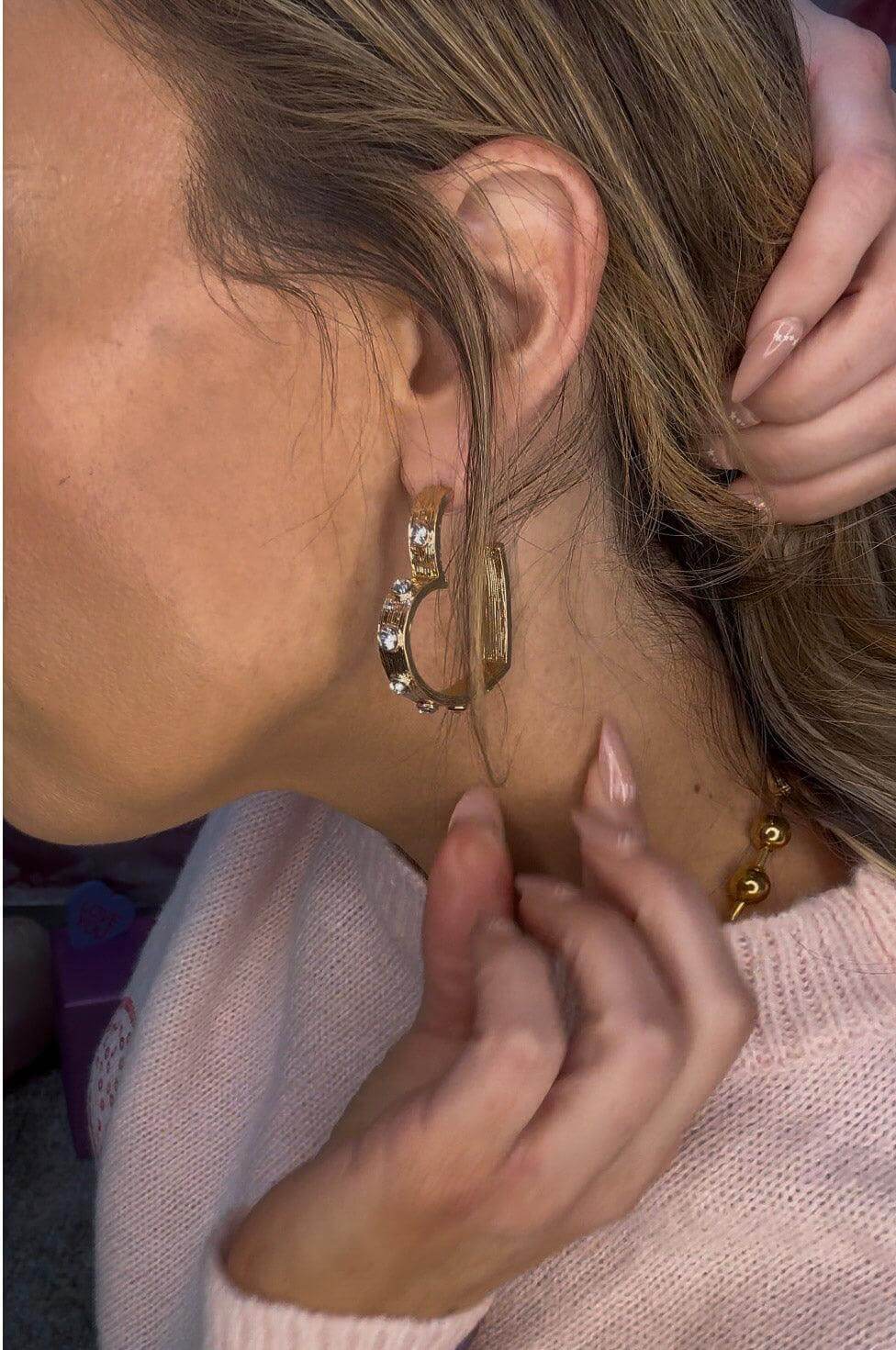 These Heart Hoops are the perfect accessory to elevate your outfit. Made with rhinestones for a touch of sparkle, the heart hoops will hold securely while adding a subtle touch of elegance. Perfect for any occasion, they are a must-have for any fashionista.