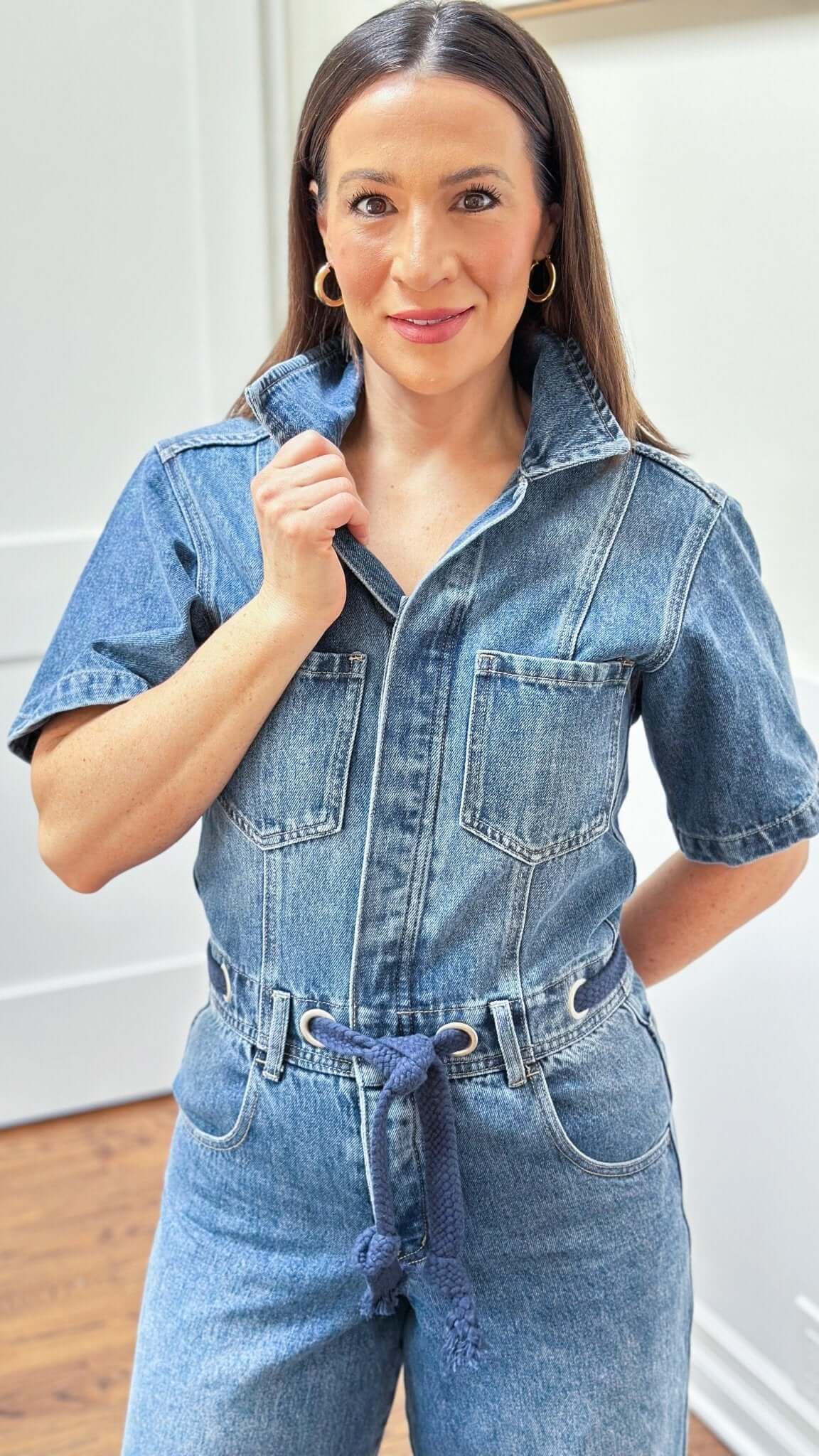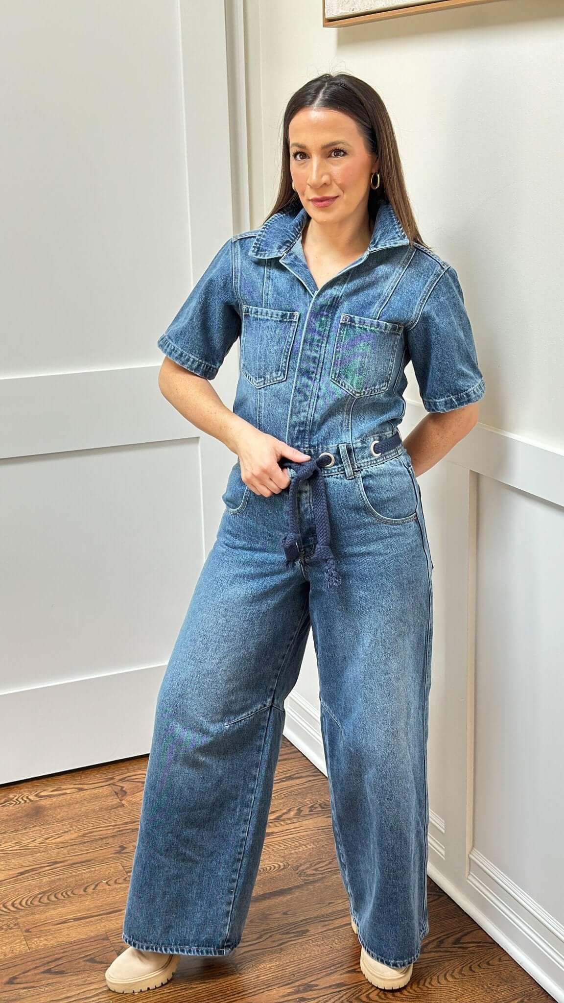 Get ready to rock this Jean Jumpsuit! Short sleeves, braided belt, and pockets make this denim romper the ultimate statement piece. Perfect for casual outings or dress it up for a night out. Show off your style in this quirky and fun jumpsuit!