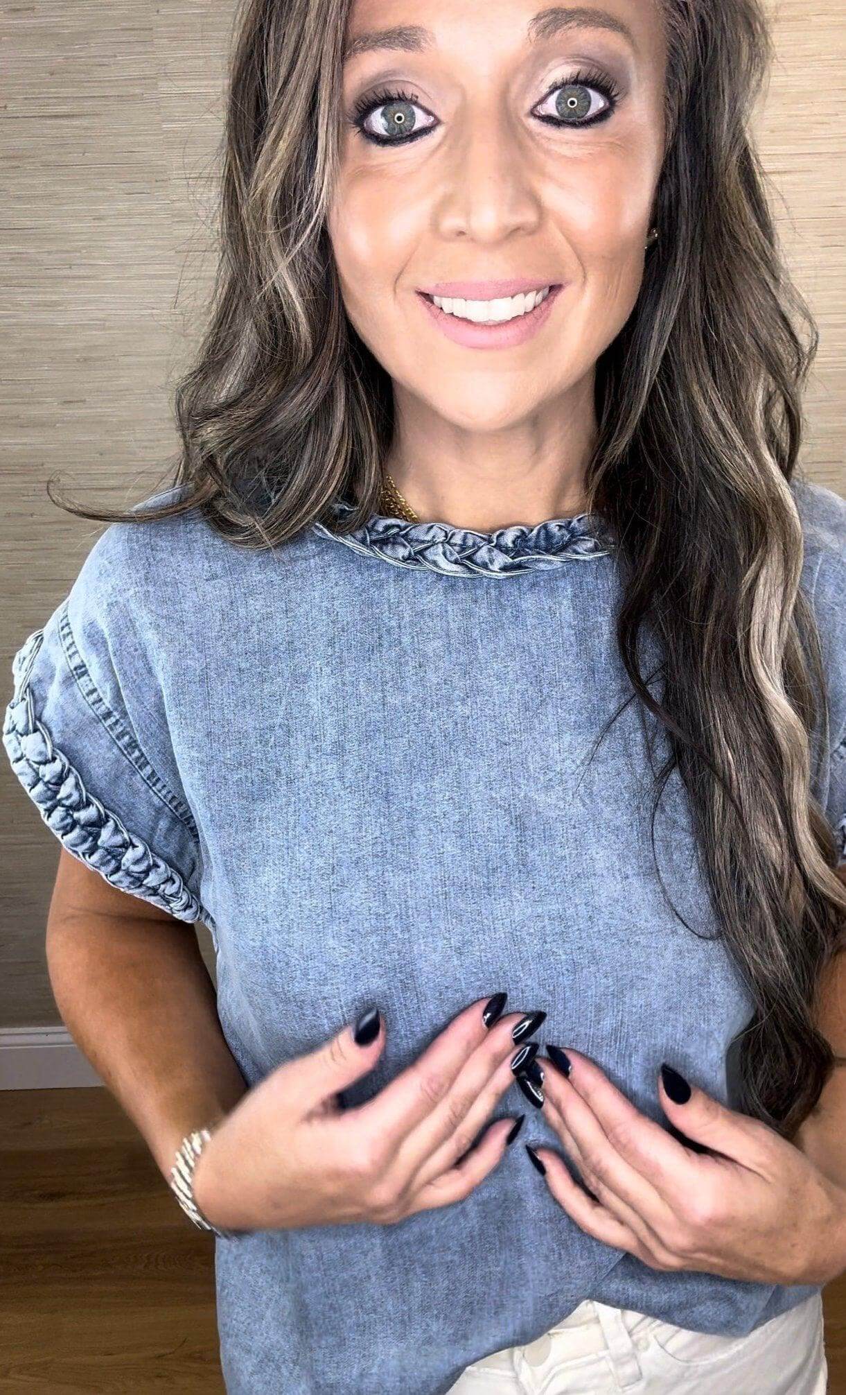 Introducing the Mia Top, a super soft, lightweight washed denim short sleeve top that effortlessly combines style and comfort. With trendy braided details on the sleeves and collar, this top adds a stylish twist to your casual wardrobe. Designed with a loose fit, the Olivia Top is true to size, making it a perfect choice for layering or wearing on its own. Pair it with your favorite jeans or shorts for a chic look that’s perfect for any occasion!