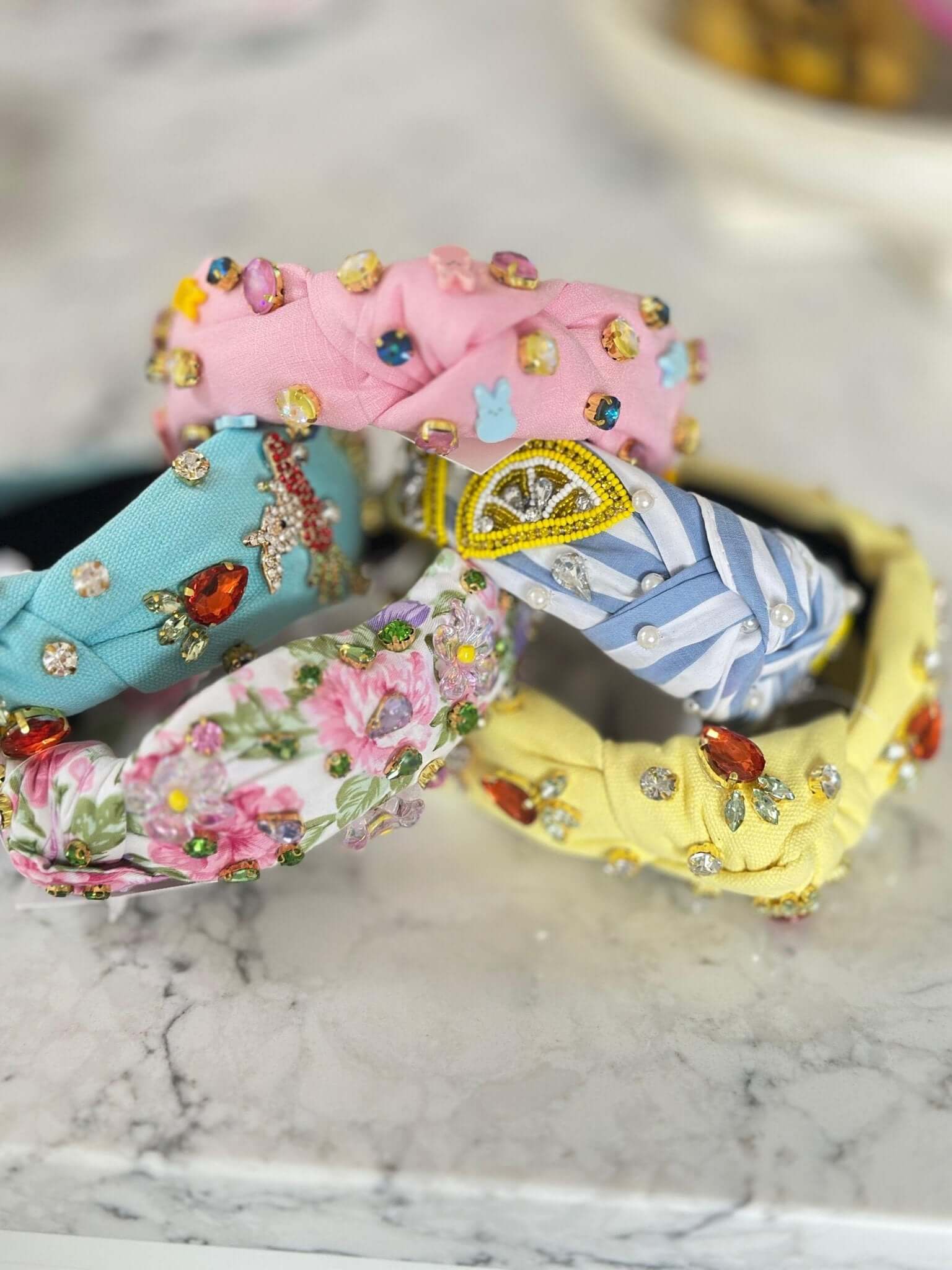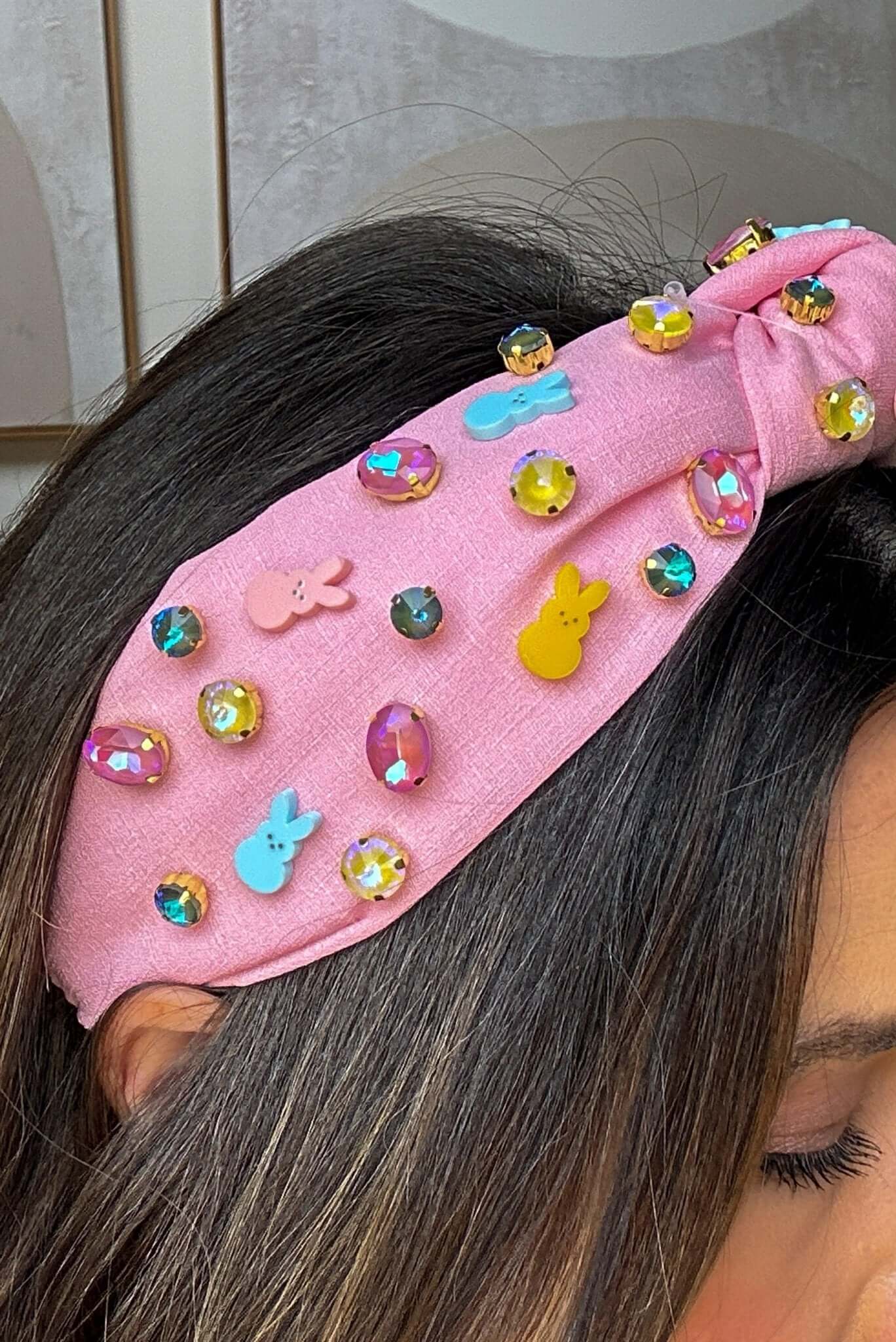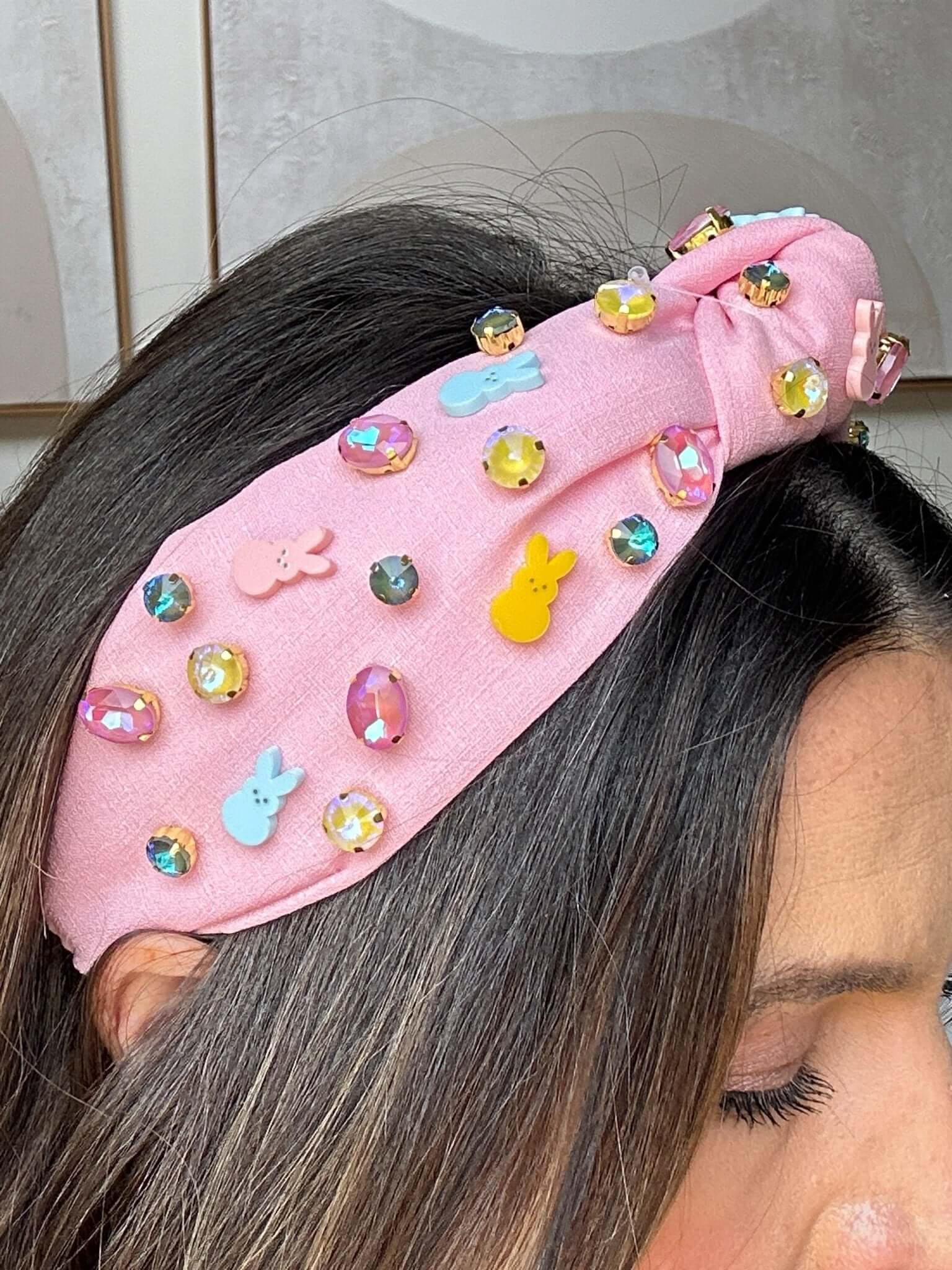 Add a playful touch to your look with our Jeweled "Peep" Headband. The soft pastel pink color and fun "peep" design will add a touch of whimsy to any outfit. Adorned with sparkling rhinestones, this headband is a playful and stylish addition to your accessories collection.