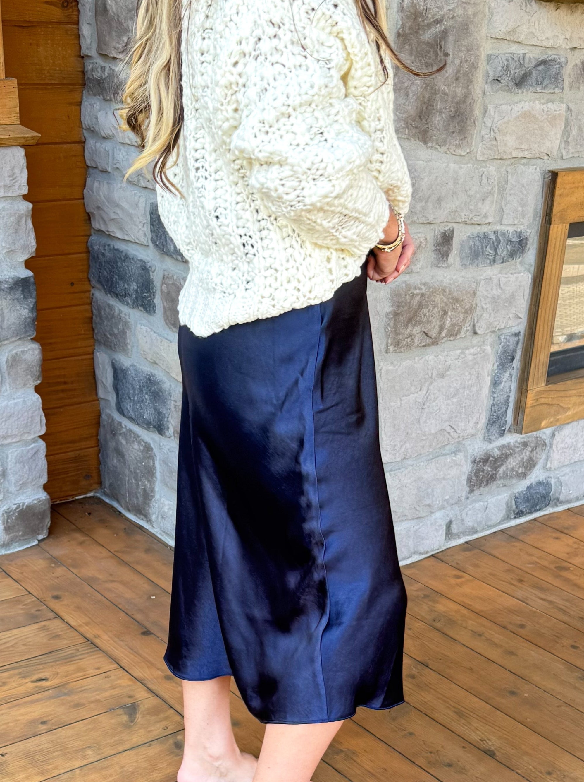 Our Luna Satin Bias-Cut Maxi Skirt in navy blue is crafted from a luxurious, thick, high-shine satin that glides effortlessly along the body. Designed with a timeless bias cut, this skirt skims your curves in all the right places—creating a soft, elongating silhouette that flatters every figure.