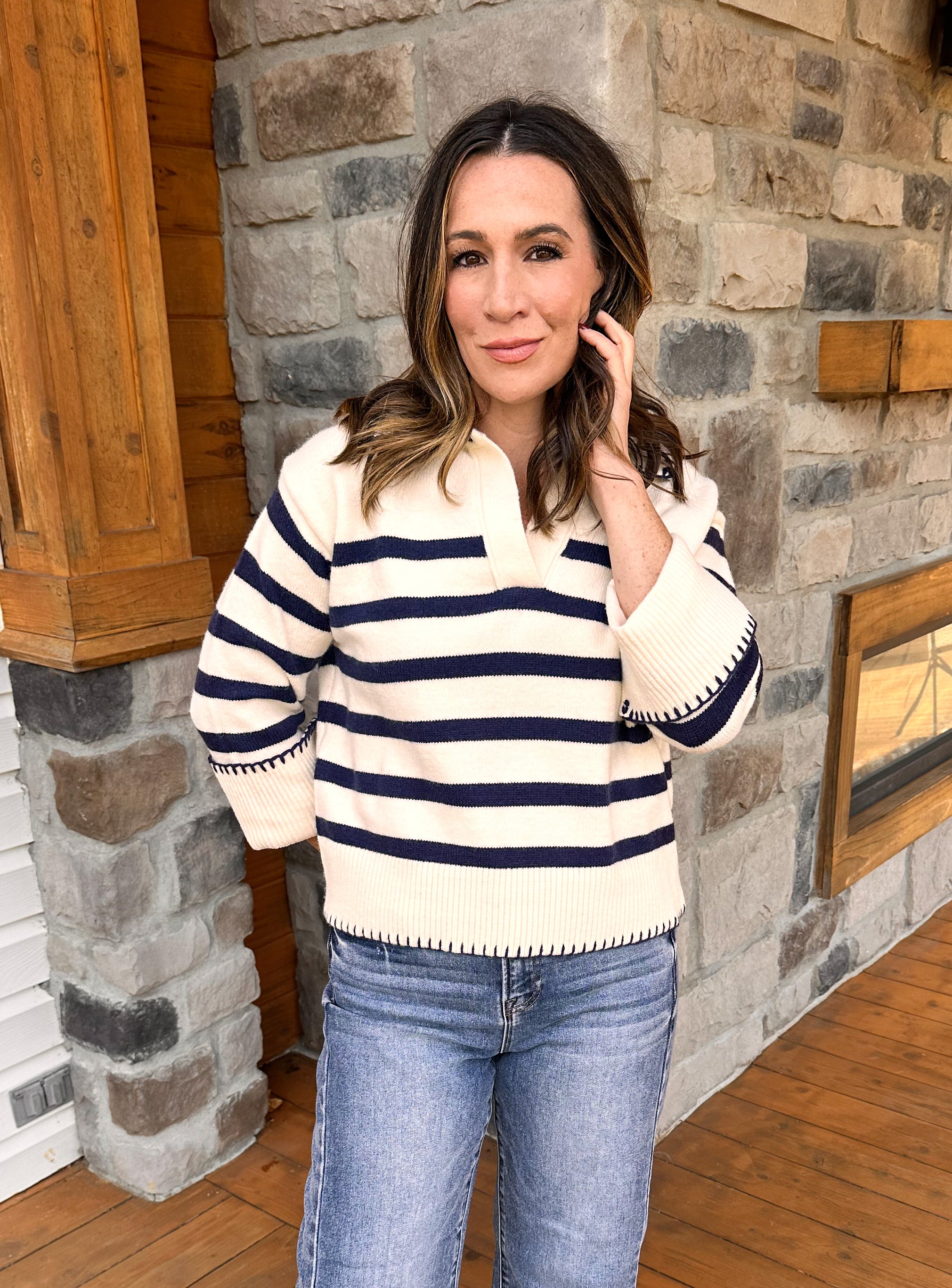 Timeless, versatile, and effortlessly cool — The Nautical Striped Sweater brings classic charm with a modern twist. Designed in a soft navy and cream knit, it features a structured collar and foldable sleeves that let you switch up your look with ease. The relaxed fit makes it an easy go-to for layering, while the timeless stripe pattern adds a playful, elevated touch. Perfect for transitional weather and everyday wear.