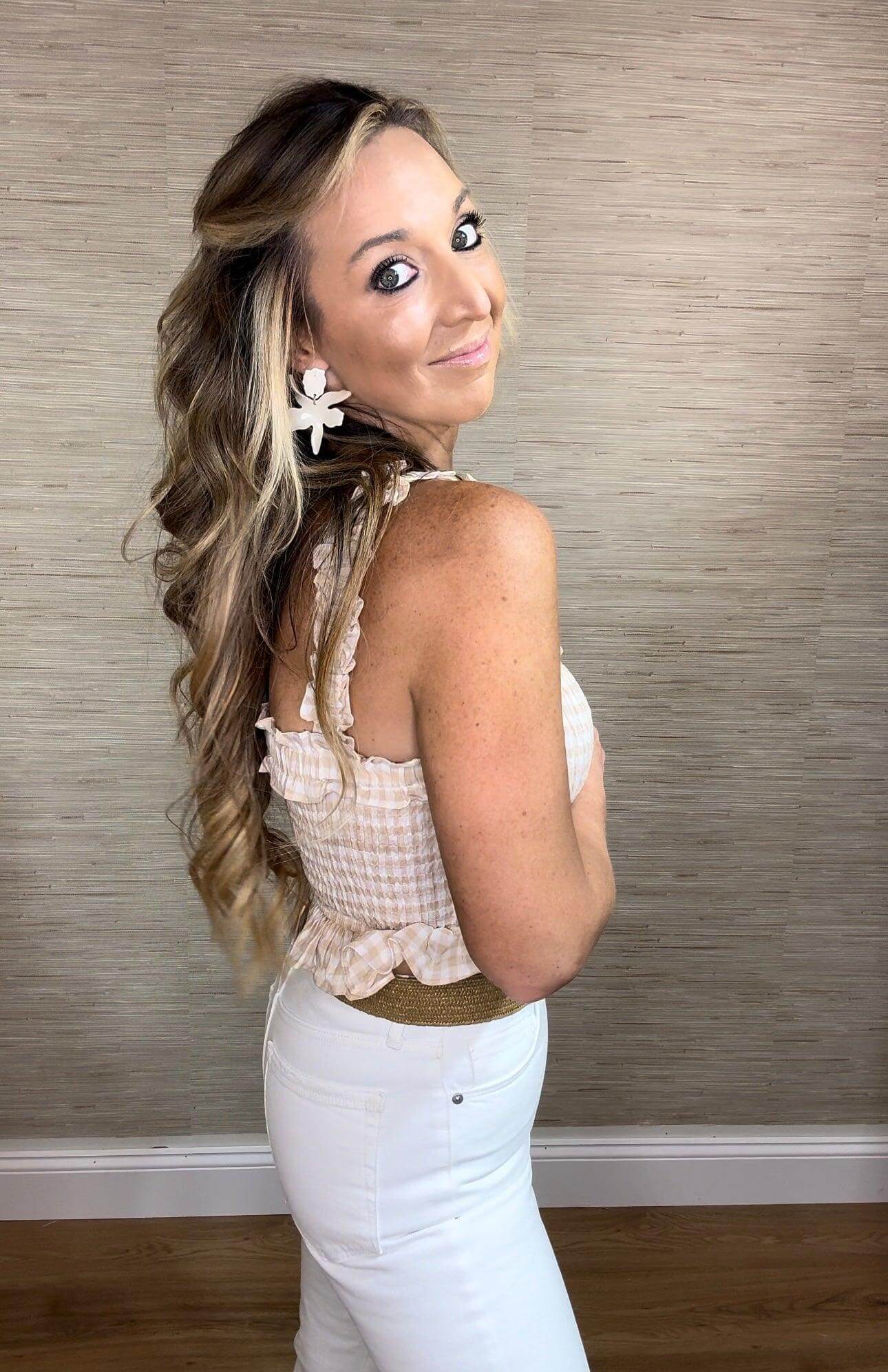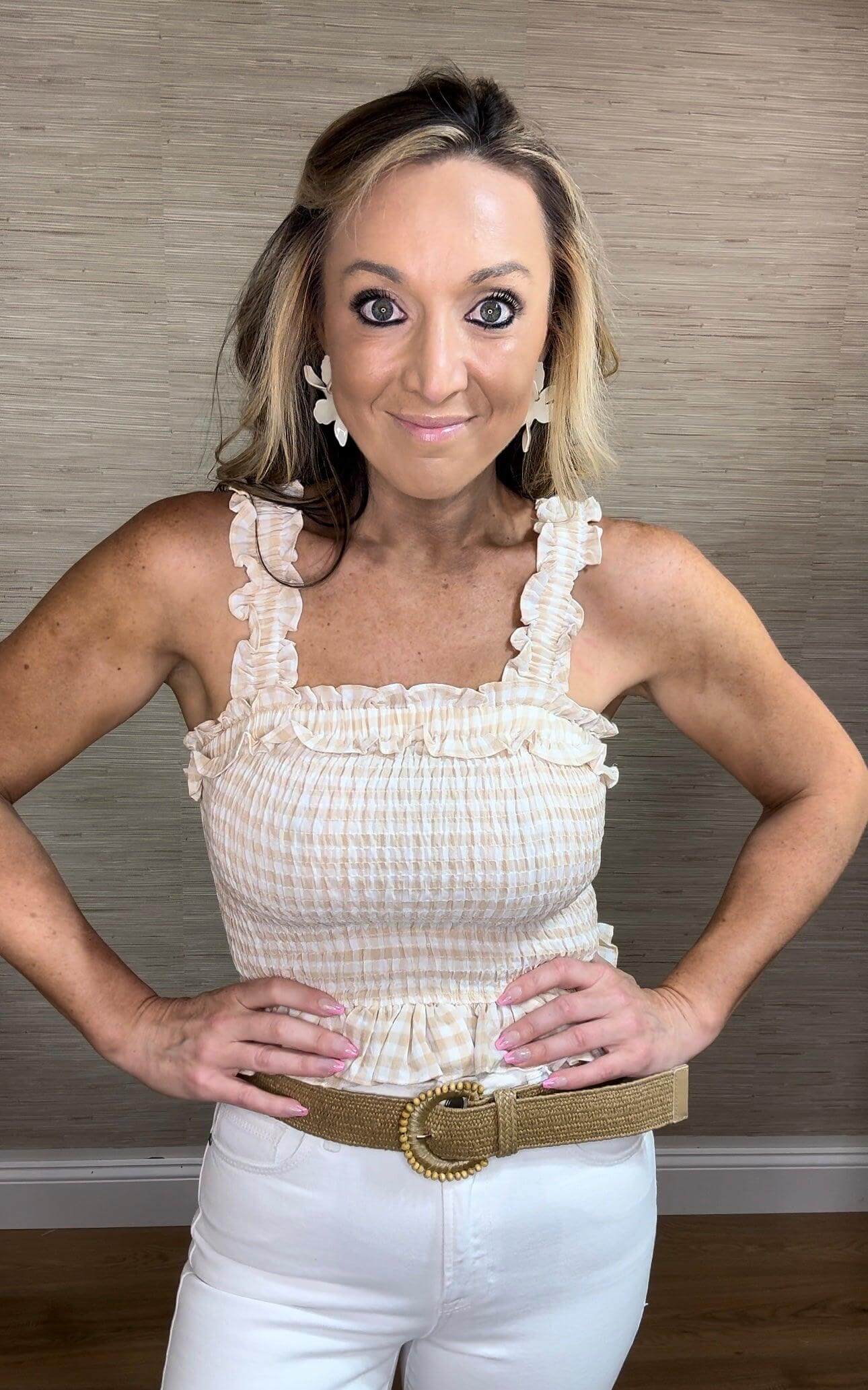 Ruffle detail sleeveless smocked gingham plaid peplum crop top.