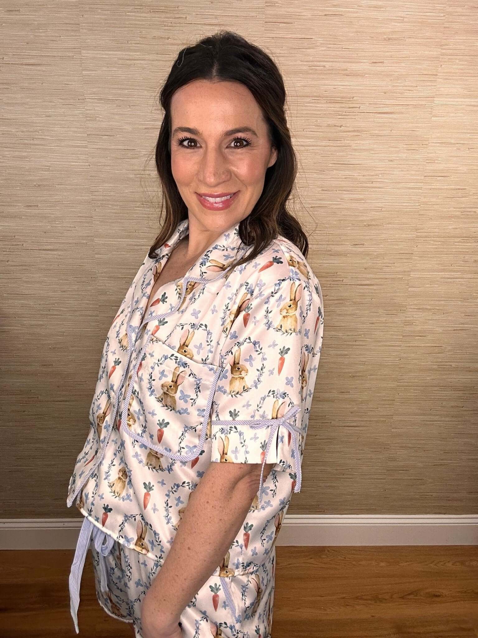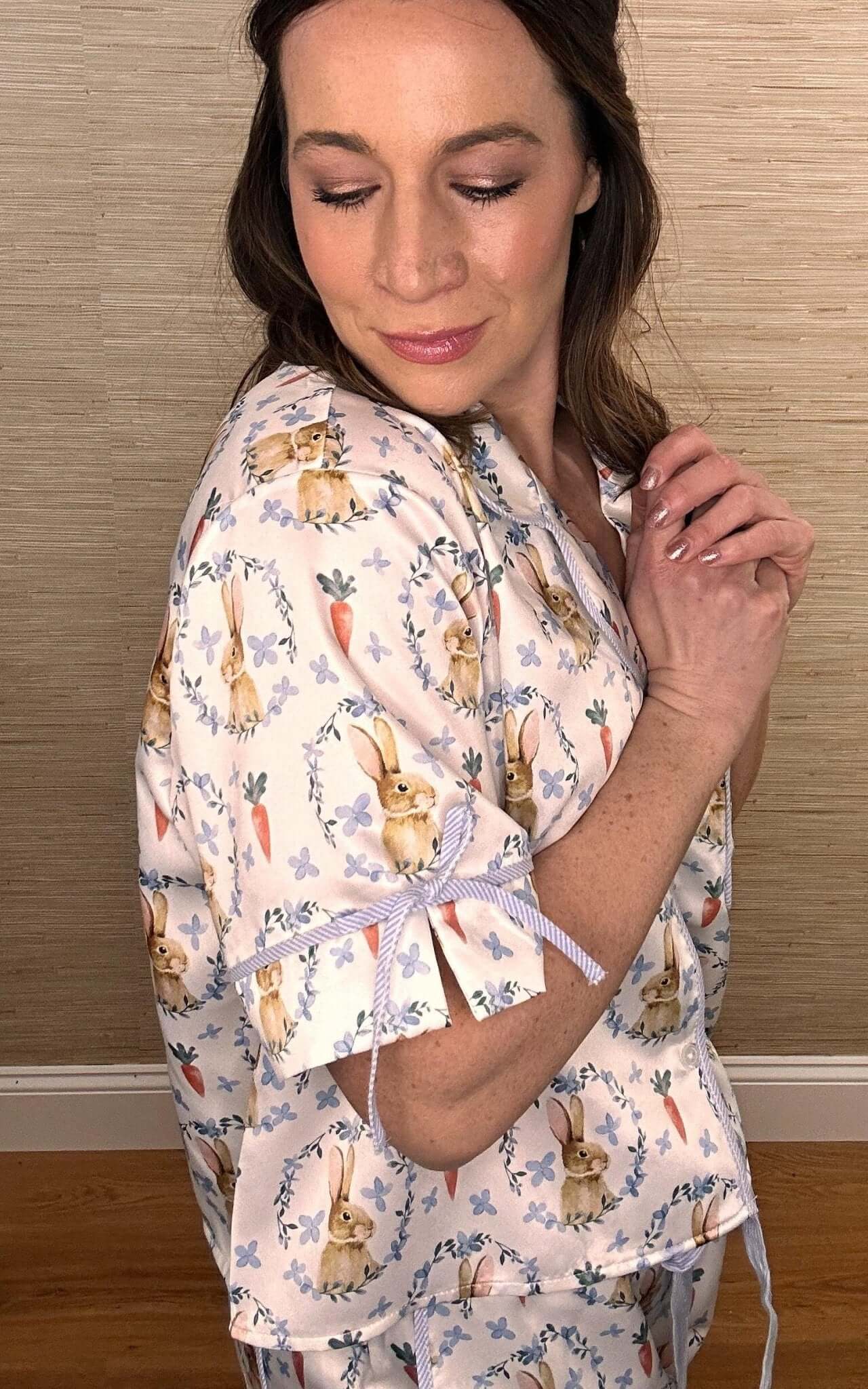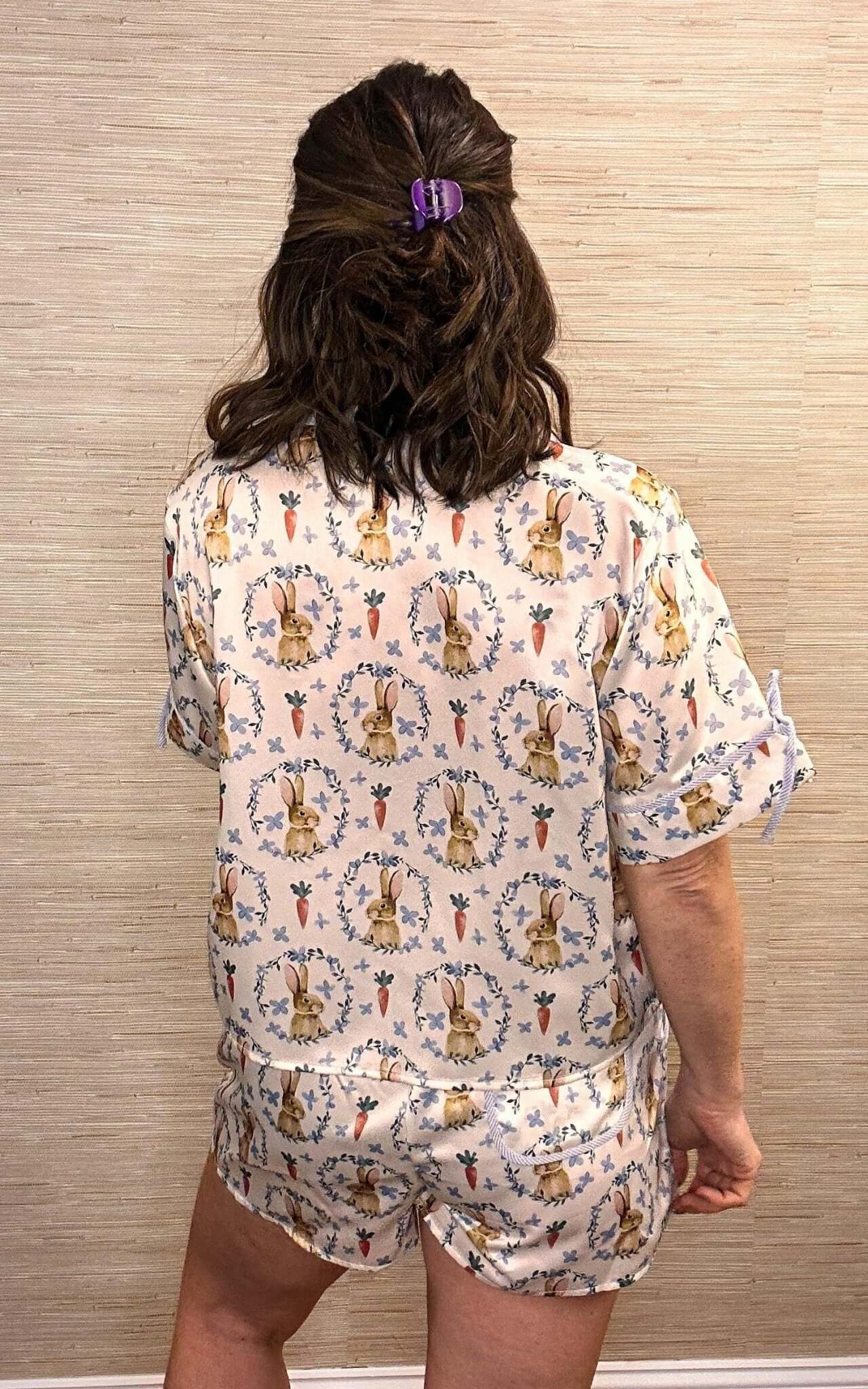 Get ready for Easter with these playful satin bunny pajamas! The elastic waist shorts and button down top make them comfortable and easy to wear. The adorable peter rabbit pattern is accented with blue and white stripe ribbon details on the shorts and sleeves. Hop into bed in style!