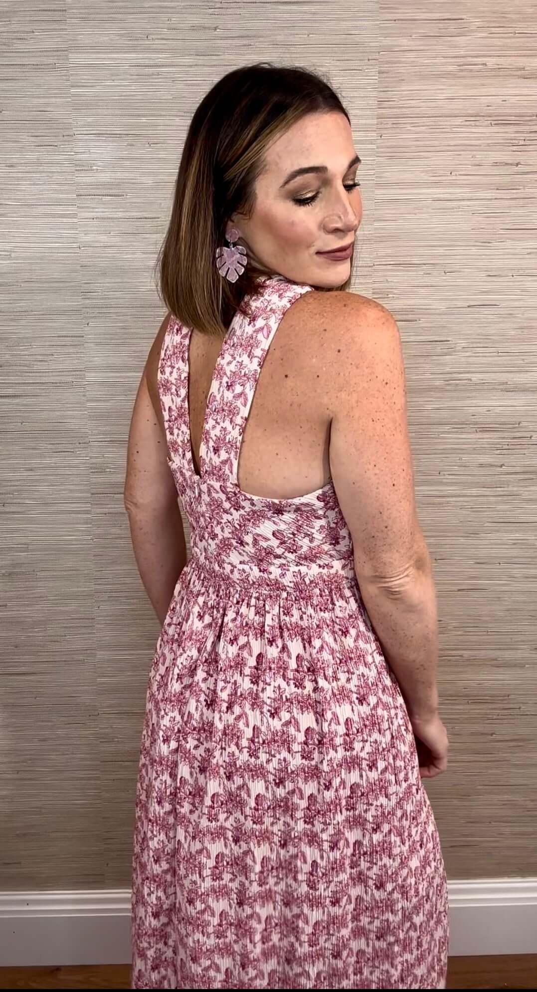Halter neckline, printed ribbed Midi dress. Featuring an elastic waistband, and a concealed back zipper. Model Size + Fit: Model height: 5'10" Dress size: Small Bust: 34 Waist: 24 Hips: 38