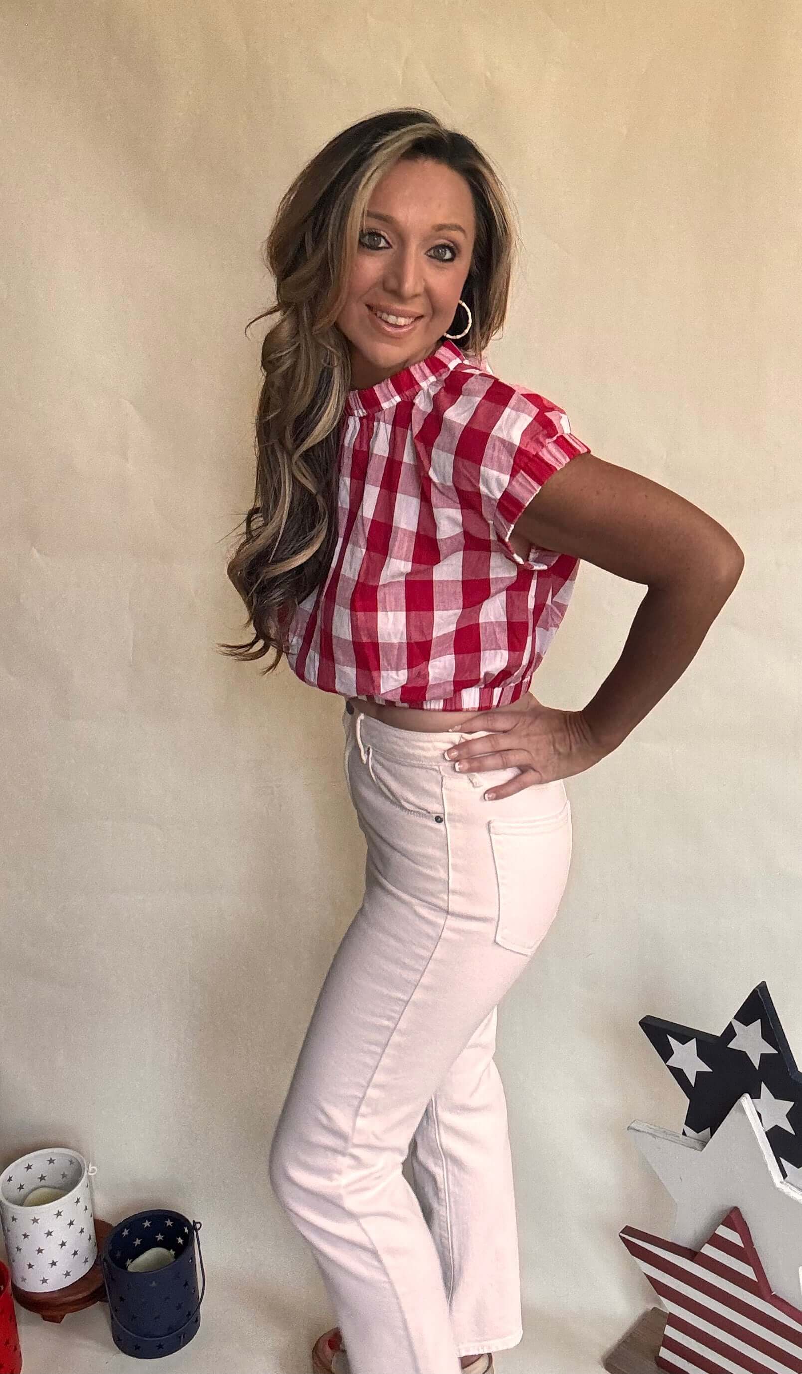 This red and off-white gingham crop top is a stylish choice for any occasion. The elastic band waist provides a comfortable and flattering fit, while the bold gingham pattern adds a touch of personality to your outfit. Stay on trend and comfortable with this top.