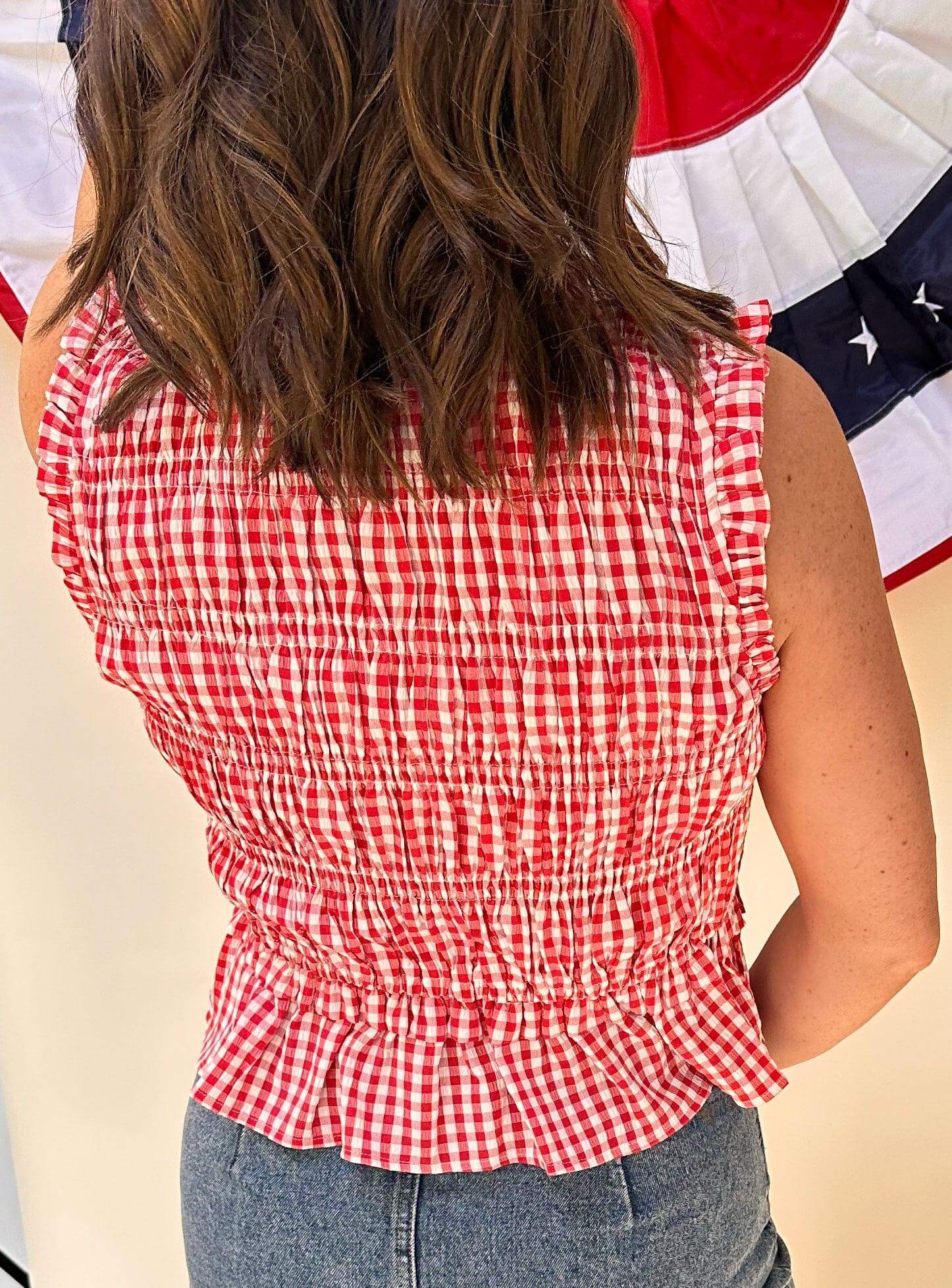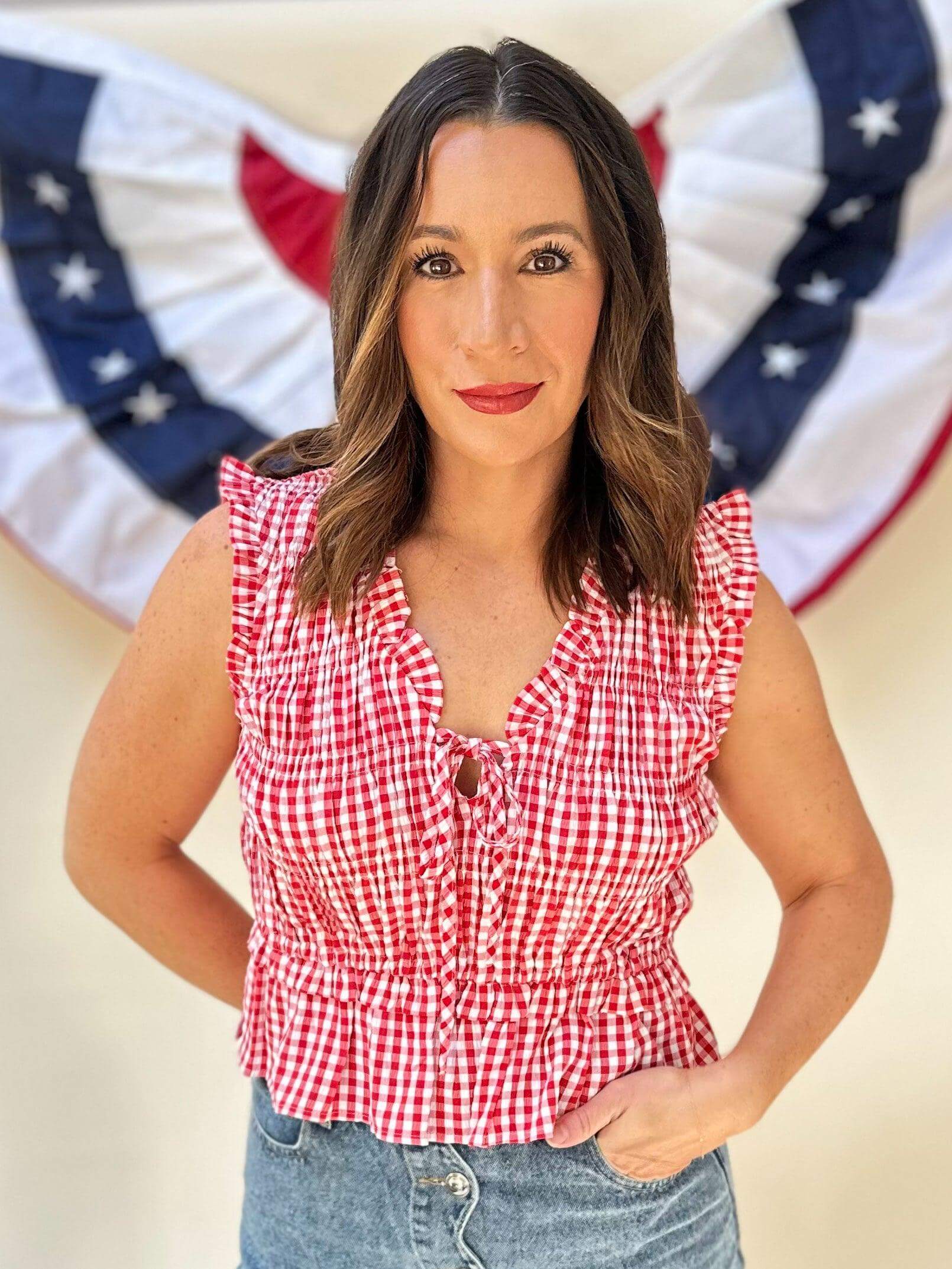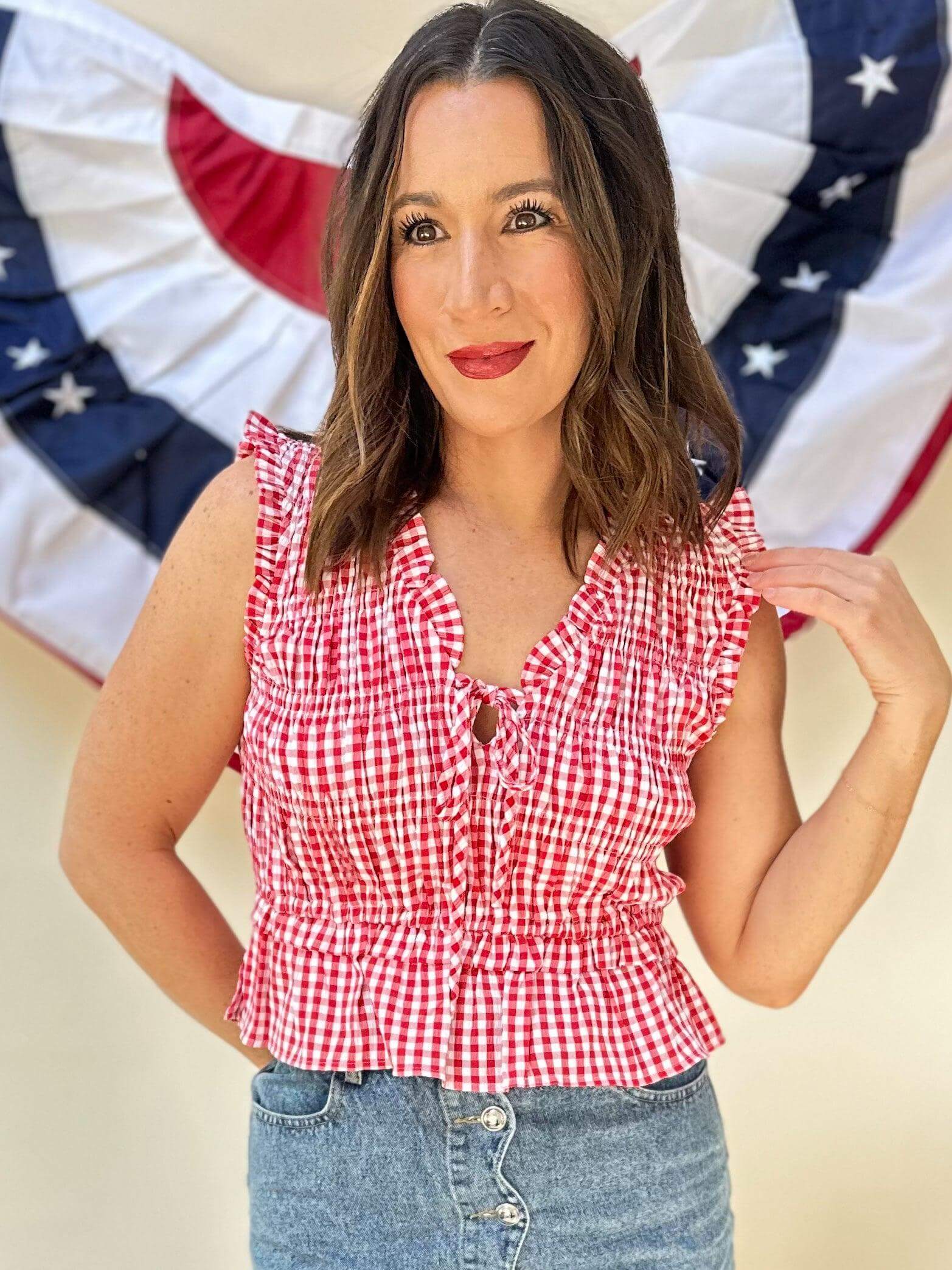 Add a playful touch to your wardrobe with this sleeveless red gingham top. The v neck tie closure adds a unique twist to this classic piece. Perfect for sunny days and casual outings, this top is a must-have for any fashion-forward individual.
